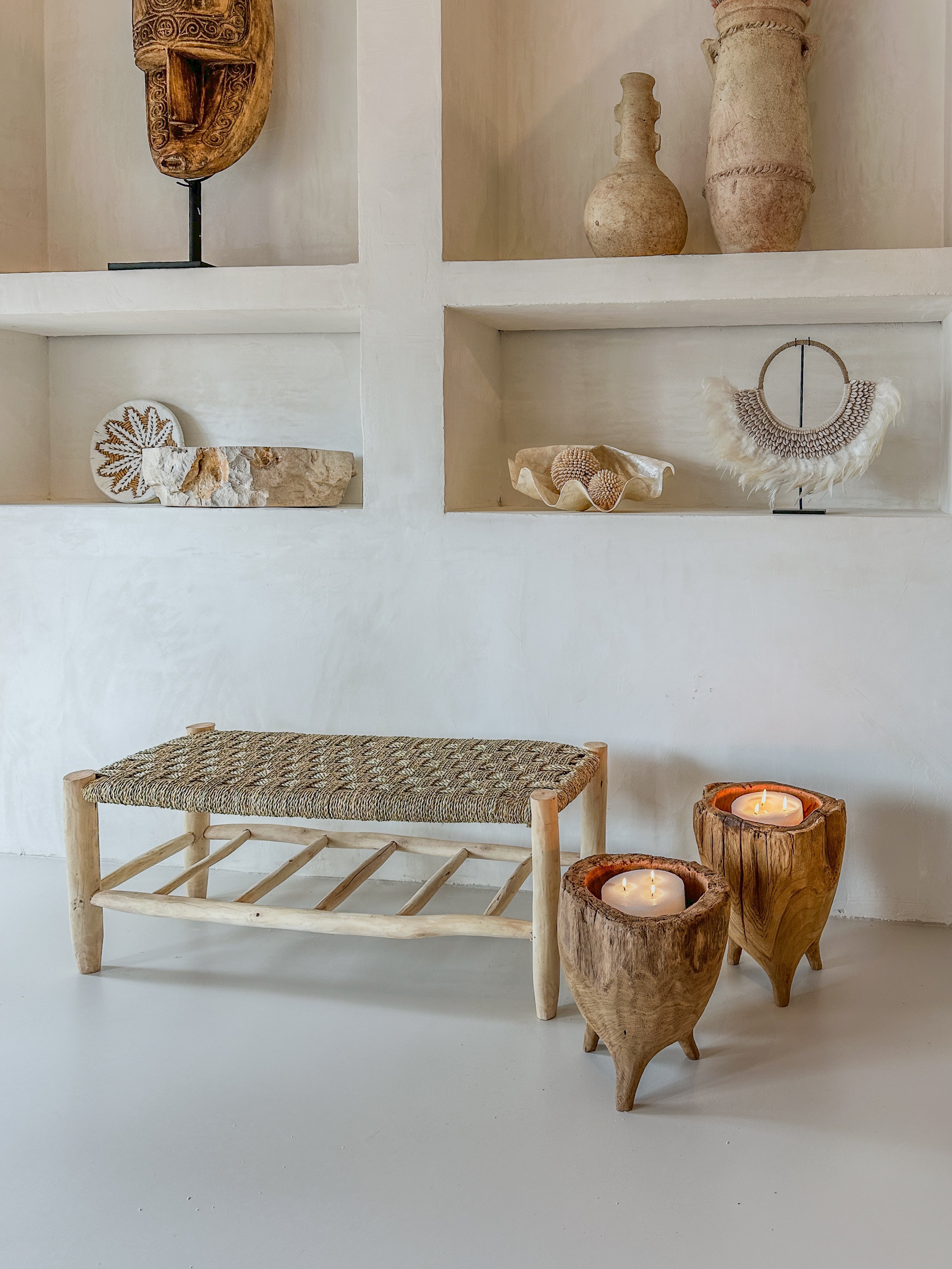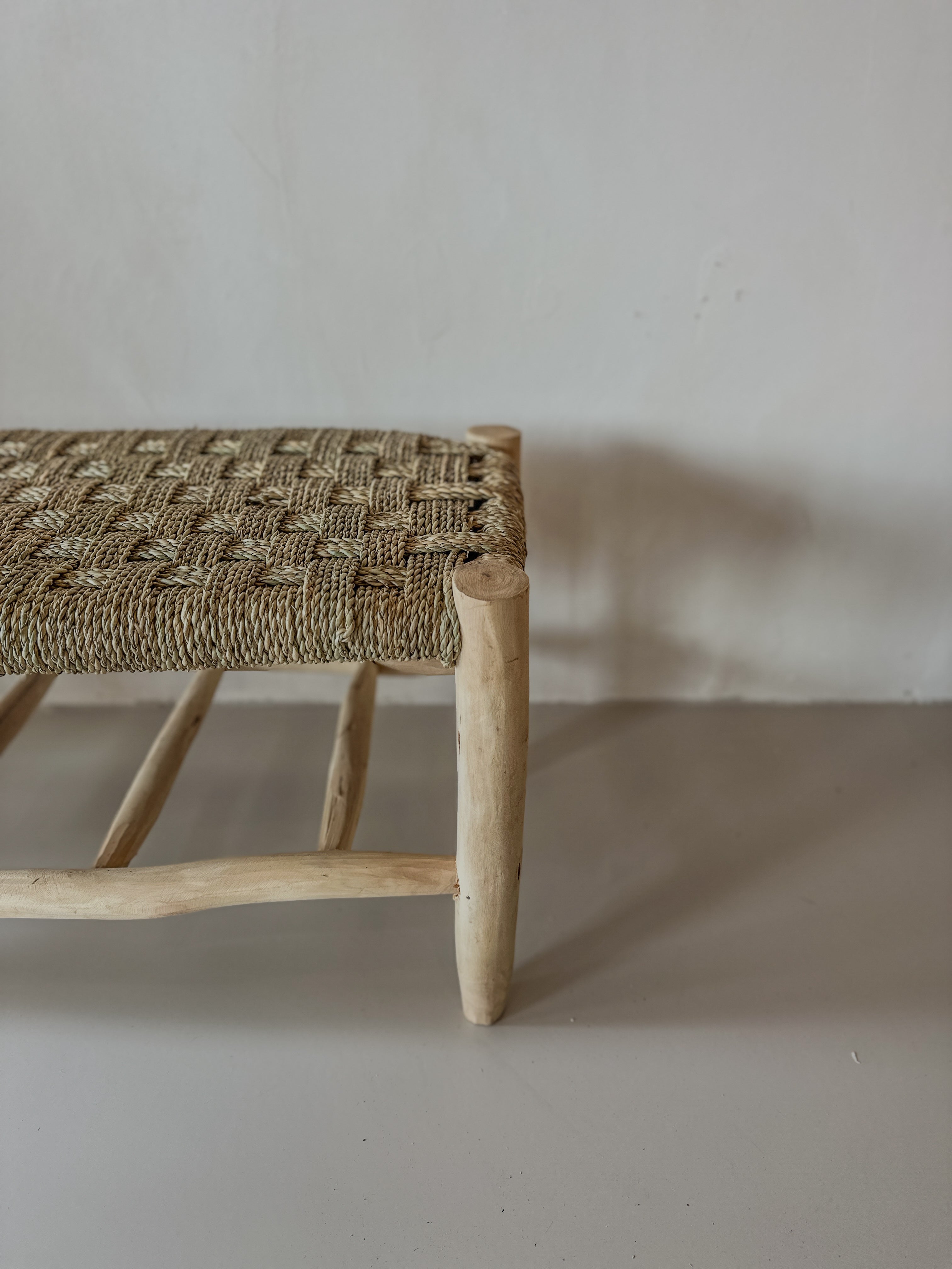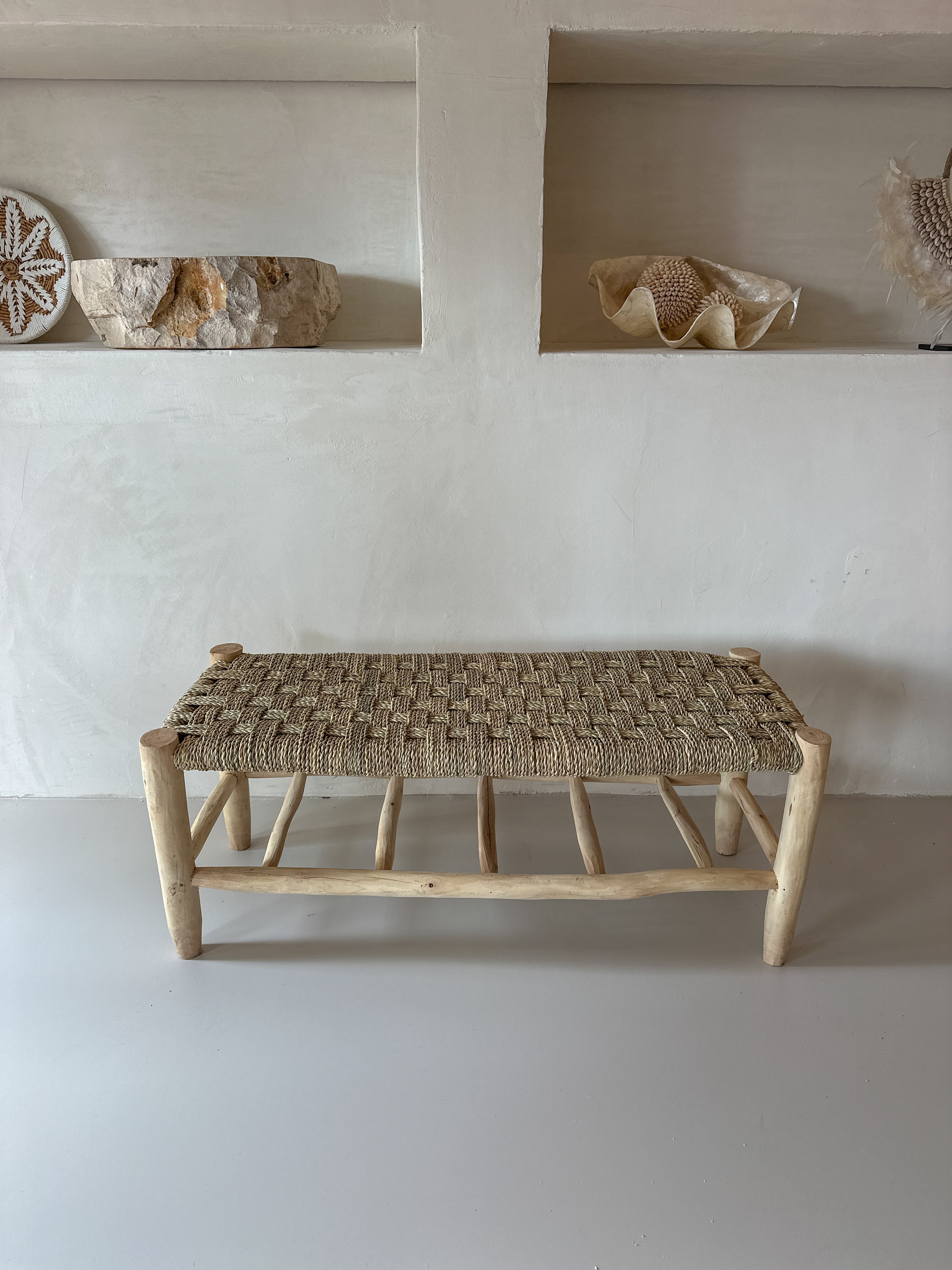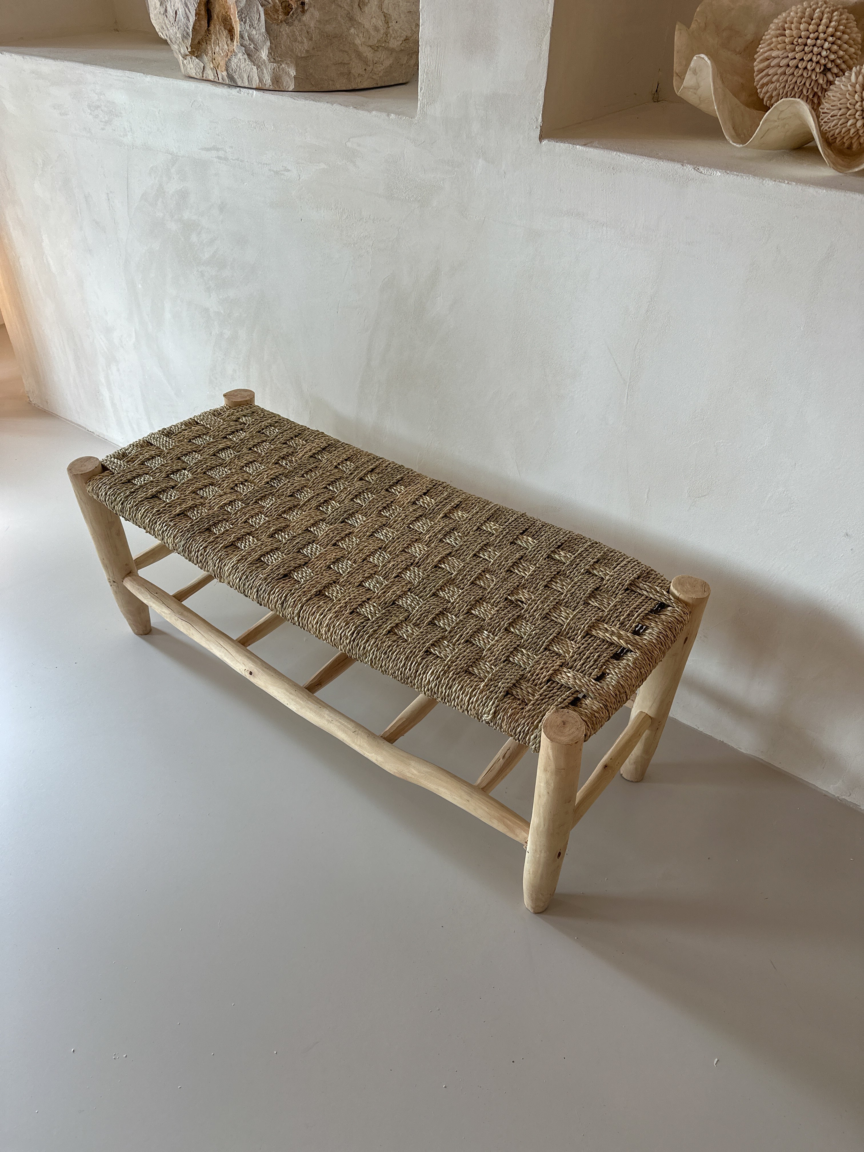 Deze stijlvolle handgemaakte bank is een prachtig staaltje Marokkaans vakmanschap. Het stevige frame is vervaardigd van natuurlijk eucalyptushout, terwijl de zitting met de hand is gevlochten van duurzaam zeegras in een fraai ruitpatroon.