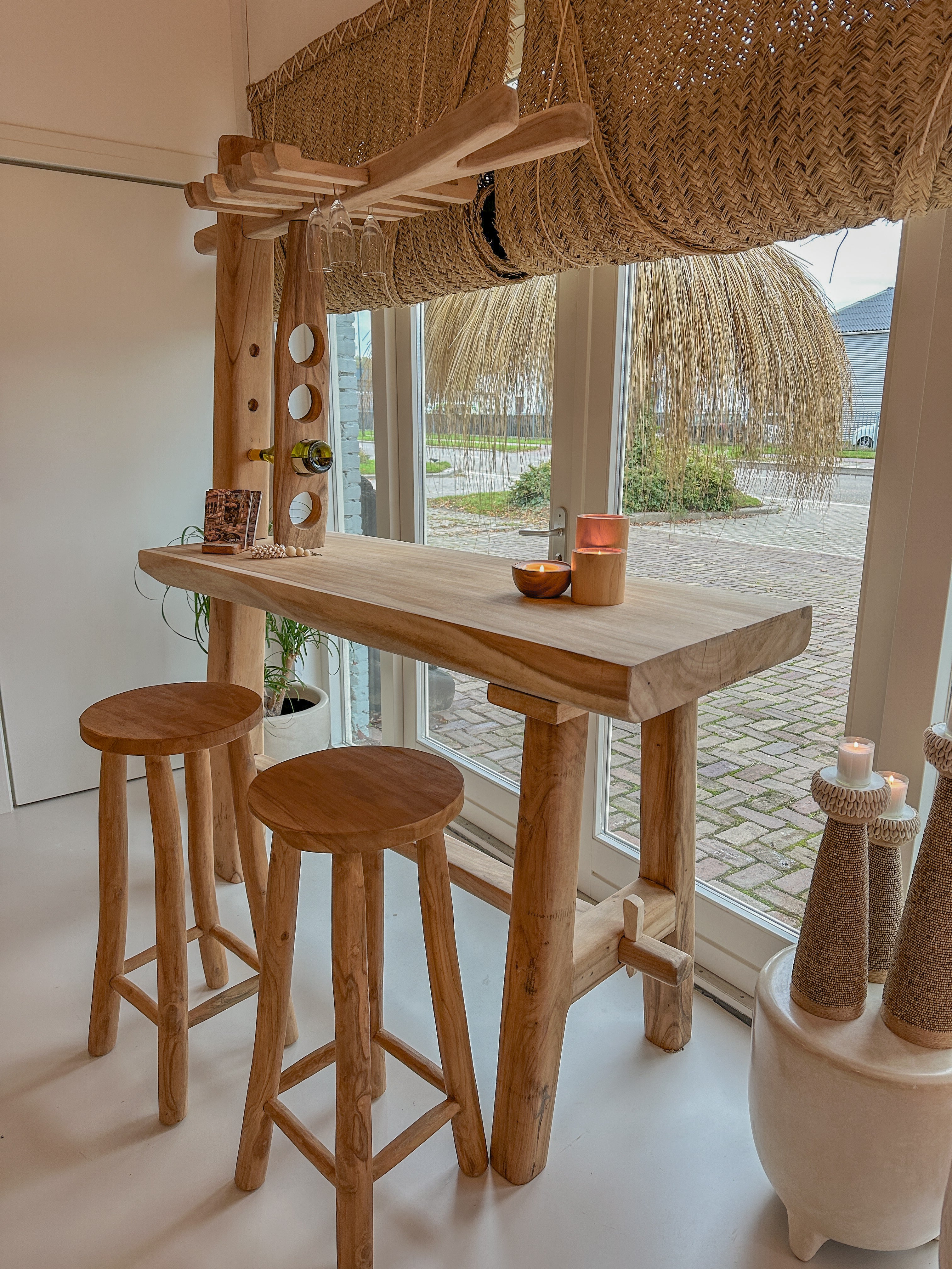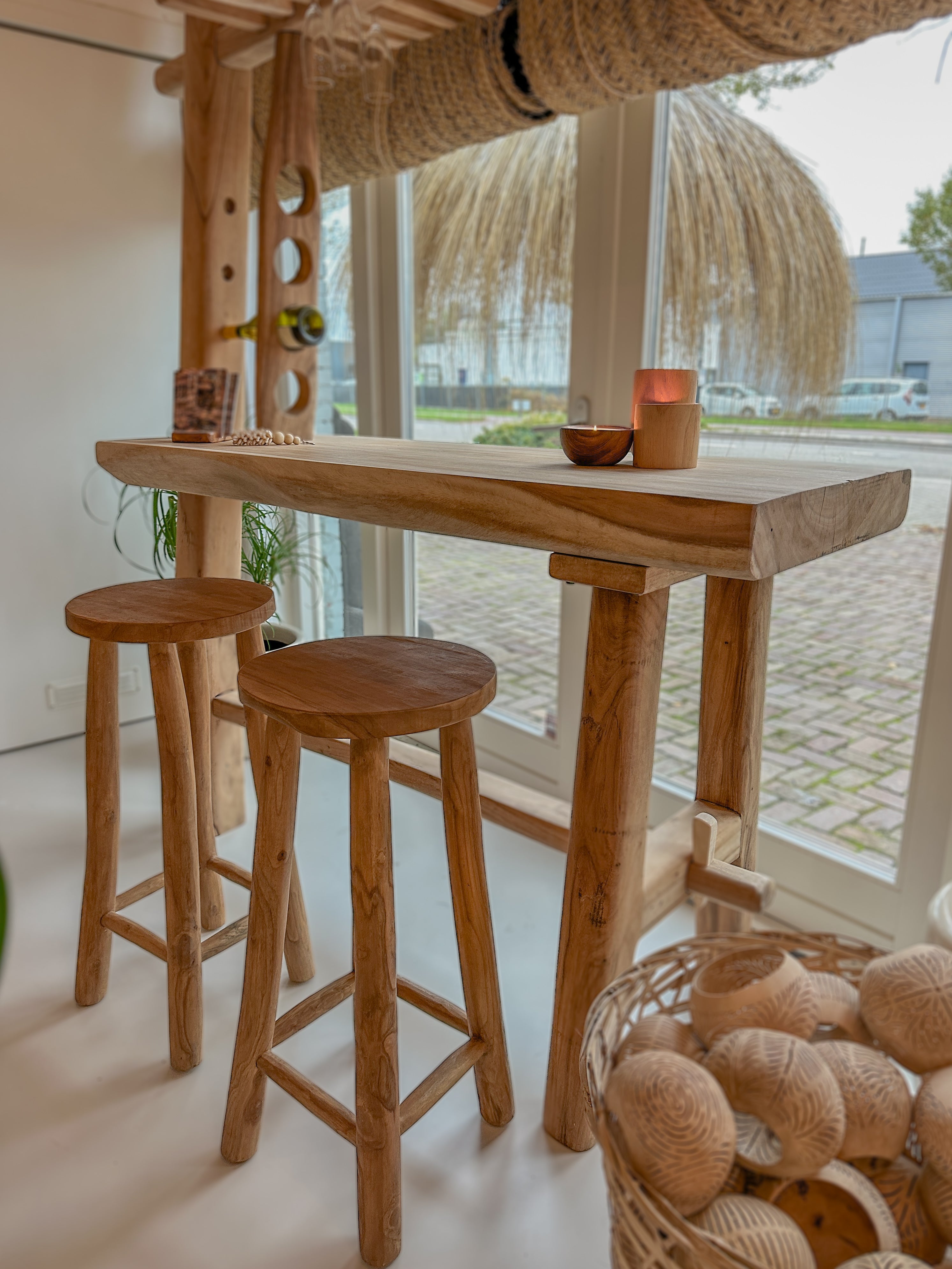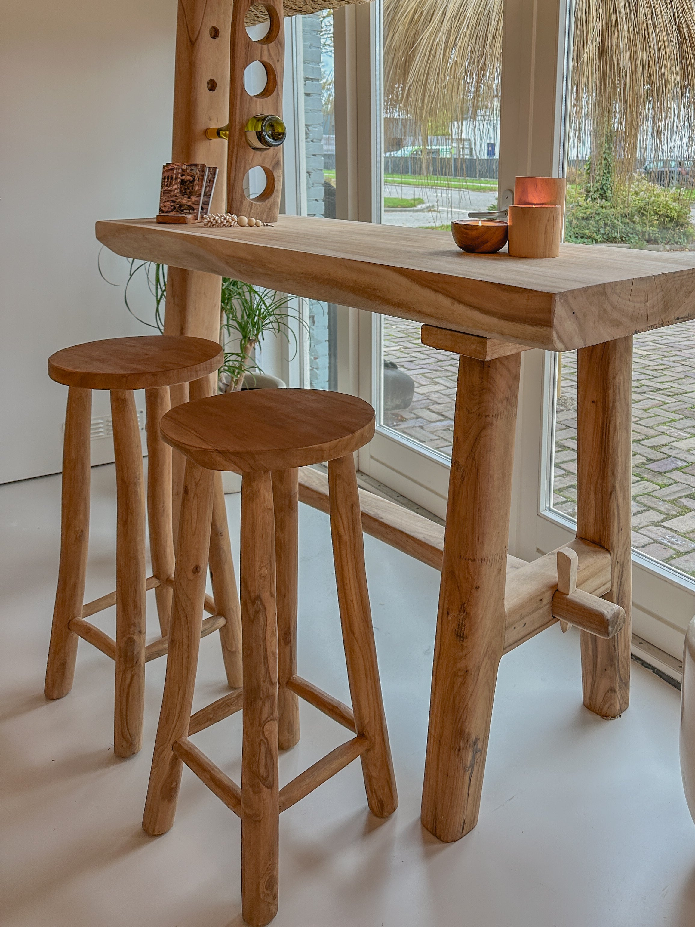 Deze karakteristieke barkruk is handgemaakt van massief teak hout en straalt puur vakmanschap uit. De natuurlijke vormen en zichtbare houtnerf geven elke kruk een uniek uiterlijk met een warme, rustieke uitstraling.