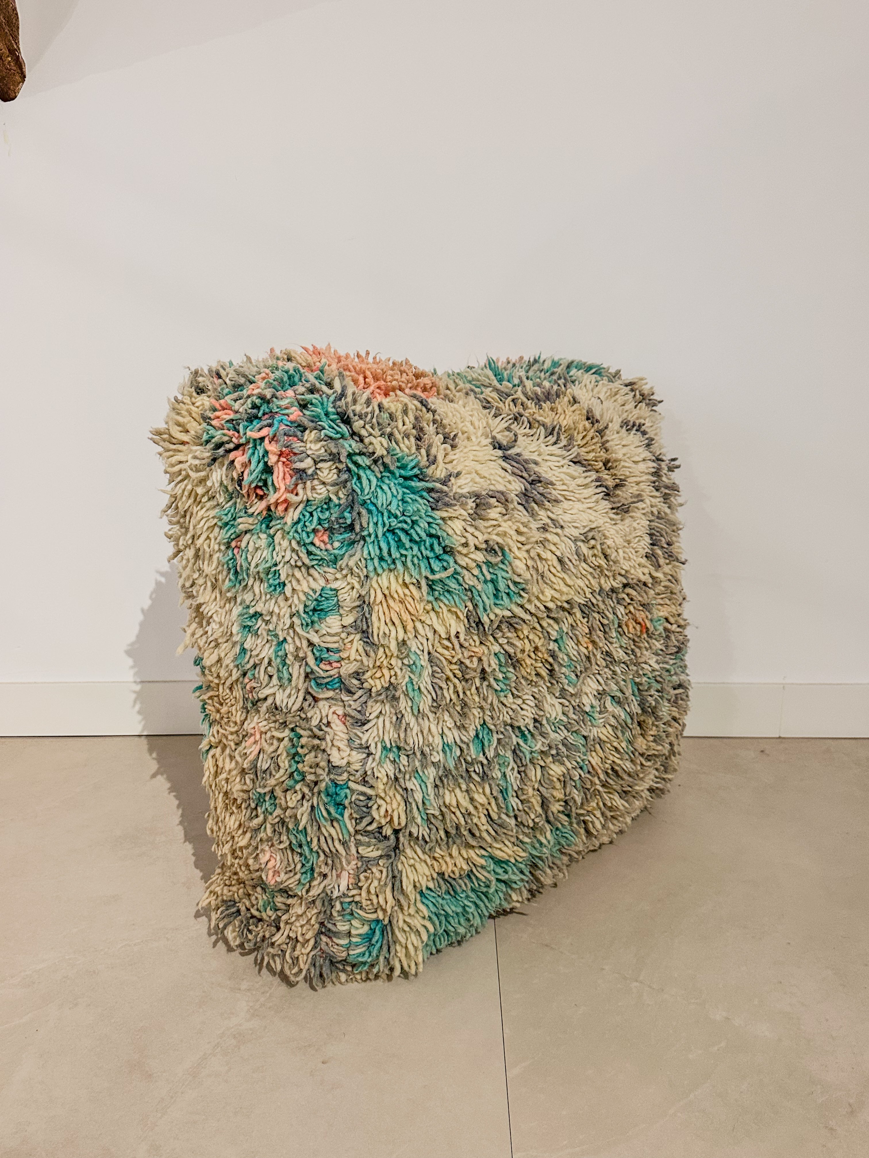 Elke poef is met de hand gemaakt van een vintage Marokkaans tapijt en is een uniek meesterwerk! De poef is een echt statement-stuk, de rijke kleuren en karakteristieke uitstraling van de poef maken het tot een opvallend item dat warmte en karakter geeft aan elke ruimte.