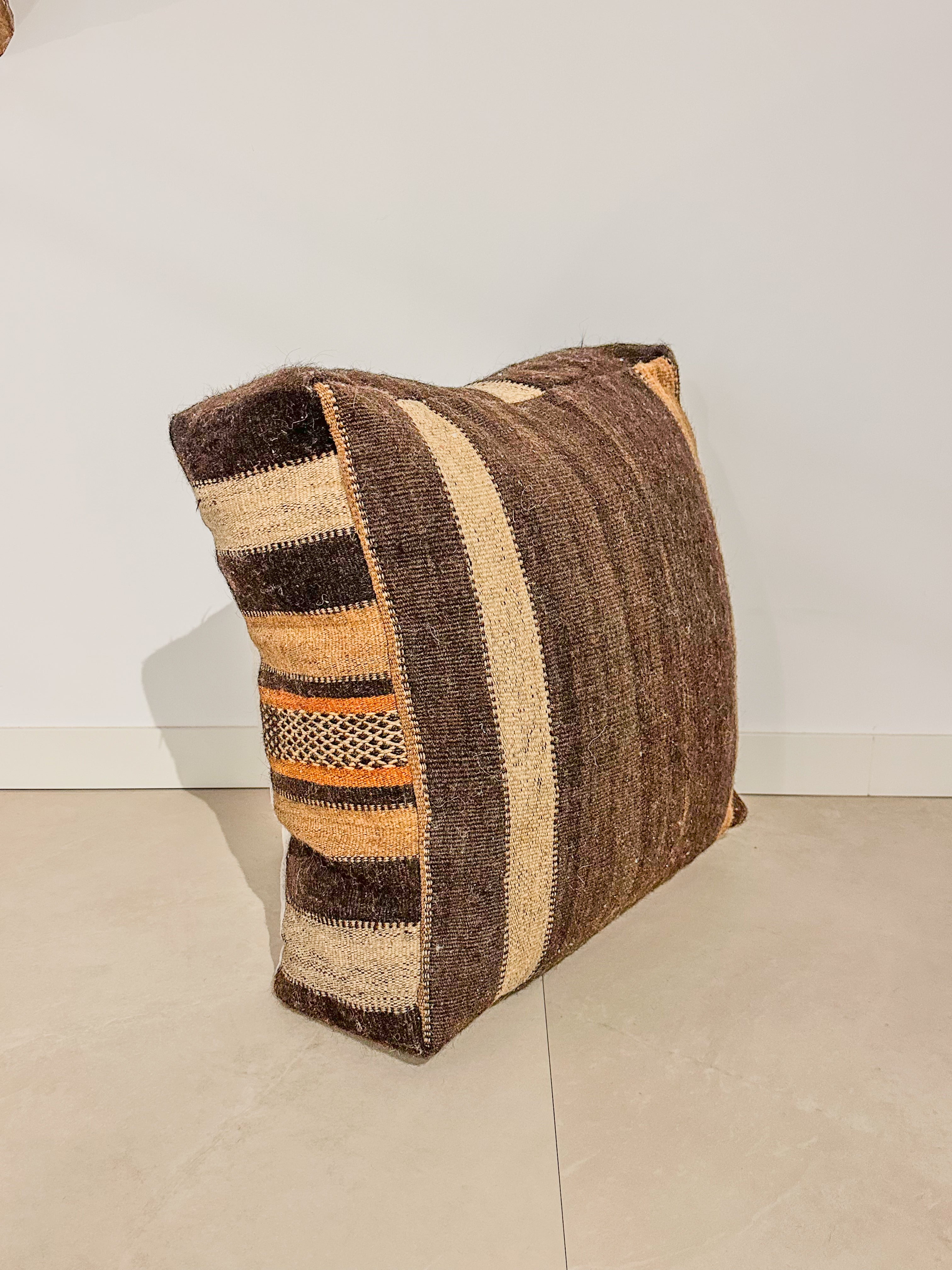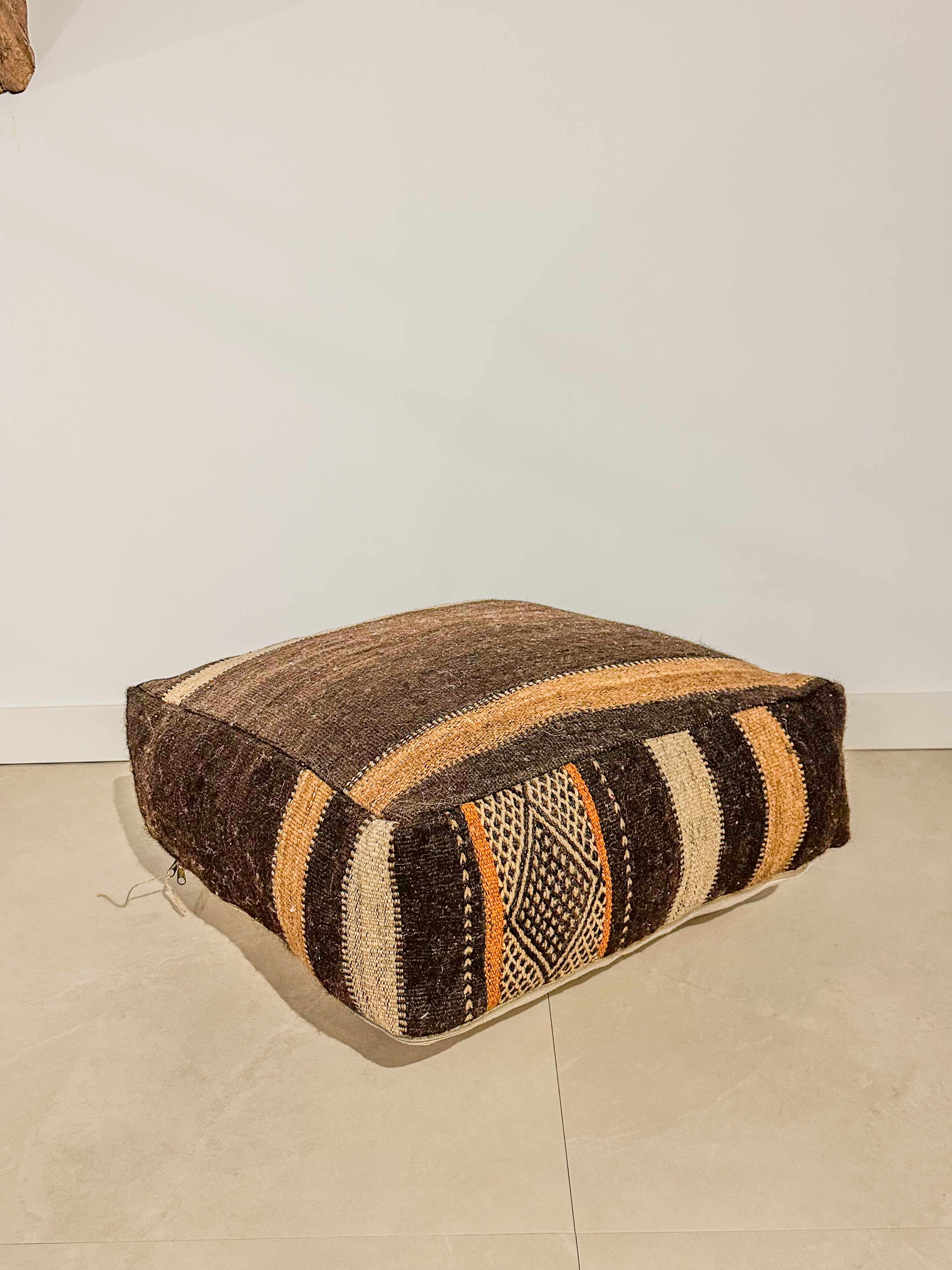 Elke poef is met de hand gemaakt van een vintage Marokkaans tapijt en is een uniek meesterwerk! De poef is een echt statement-stuk, de rijke kleuren en karakteristieke uitstraling van de poef maken het tot een opvallend item dat warmte en karakter geeft aan elke ruimte.