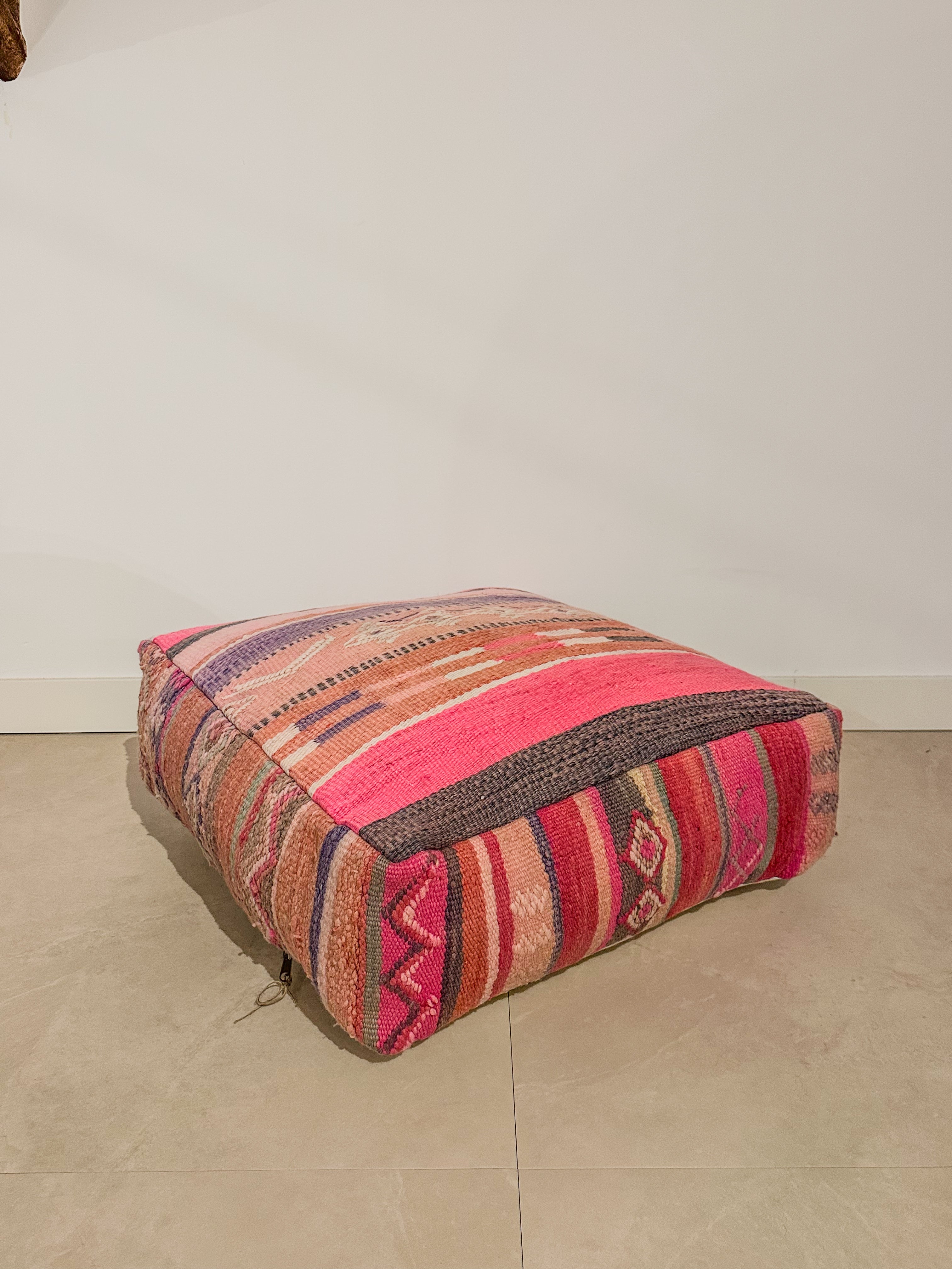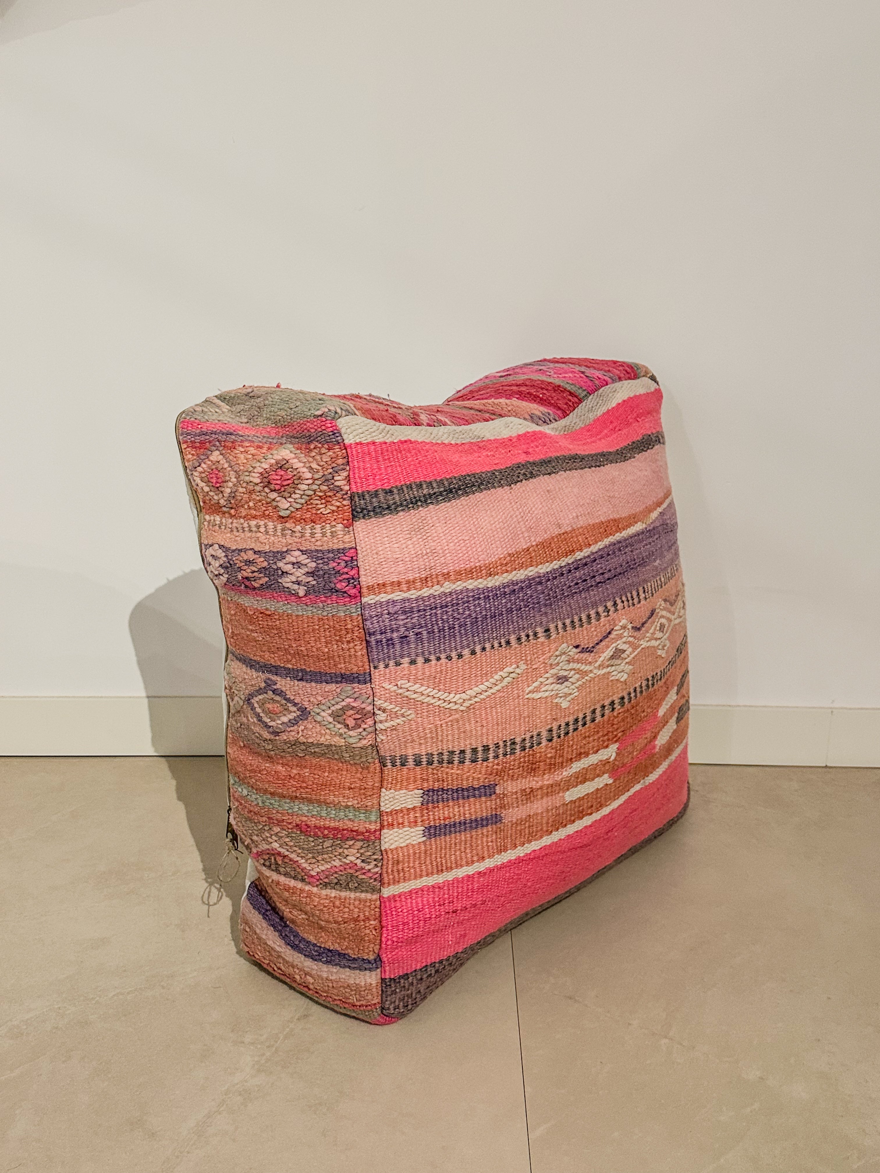 Elke poef is met de hand gemaakt van een vintage Marokkaans tapijt en is een uniek meesterwerk! De poef is een echt statement-stuk, de rijke kleuren en karakteristieke uitstraling van de poef maken het tot een opvallend item dat warmte en karakter geeft aan elke ruimte.