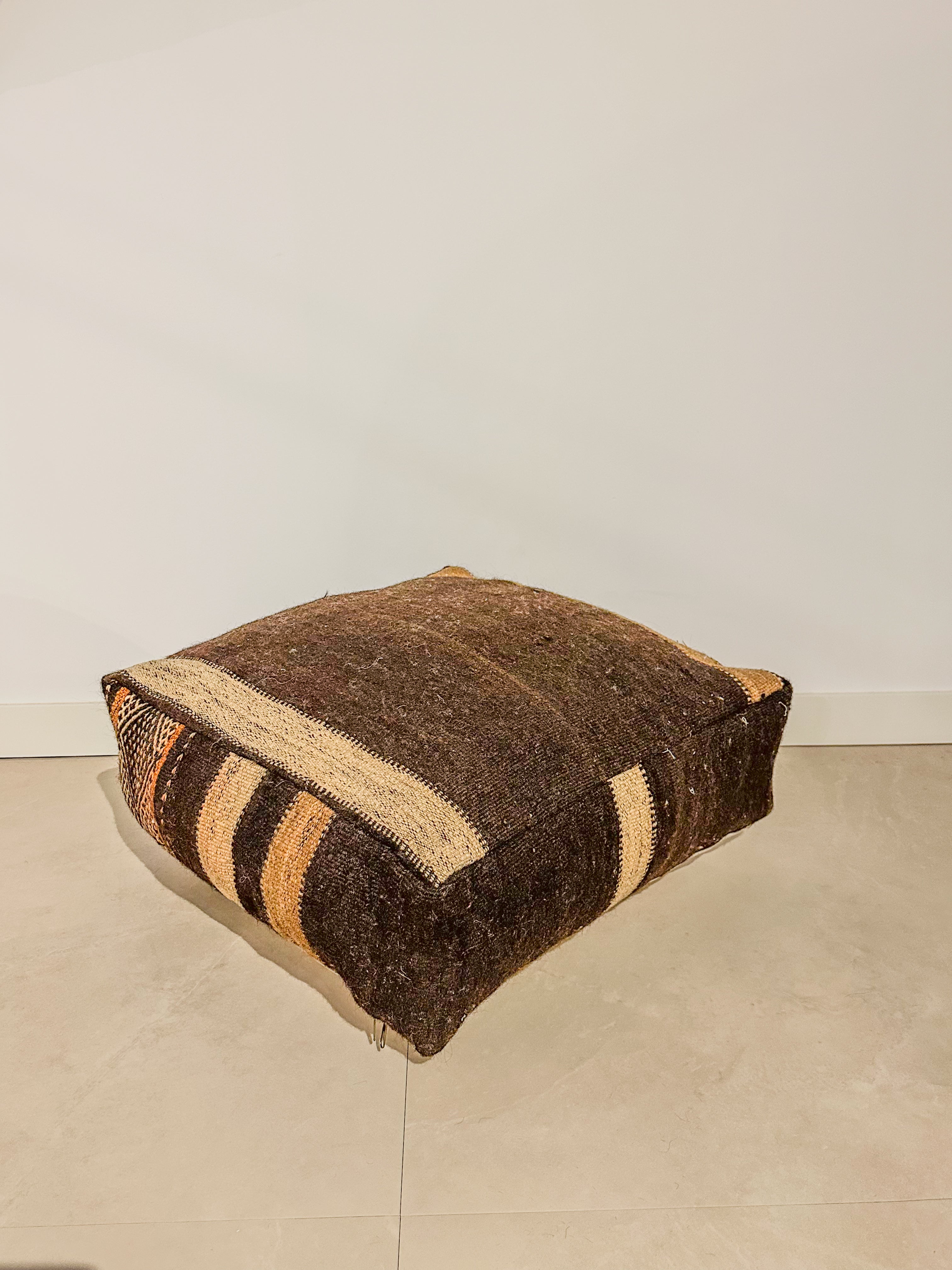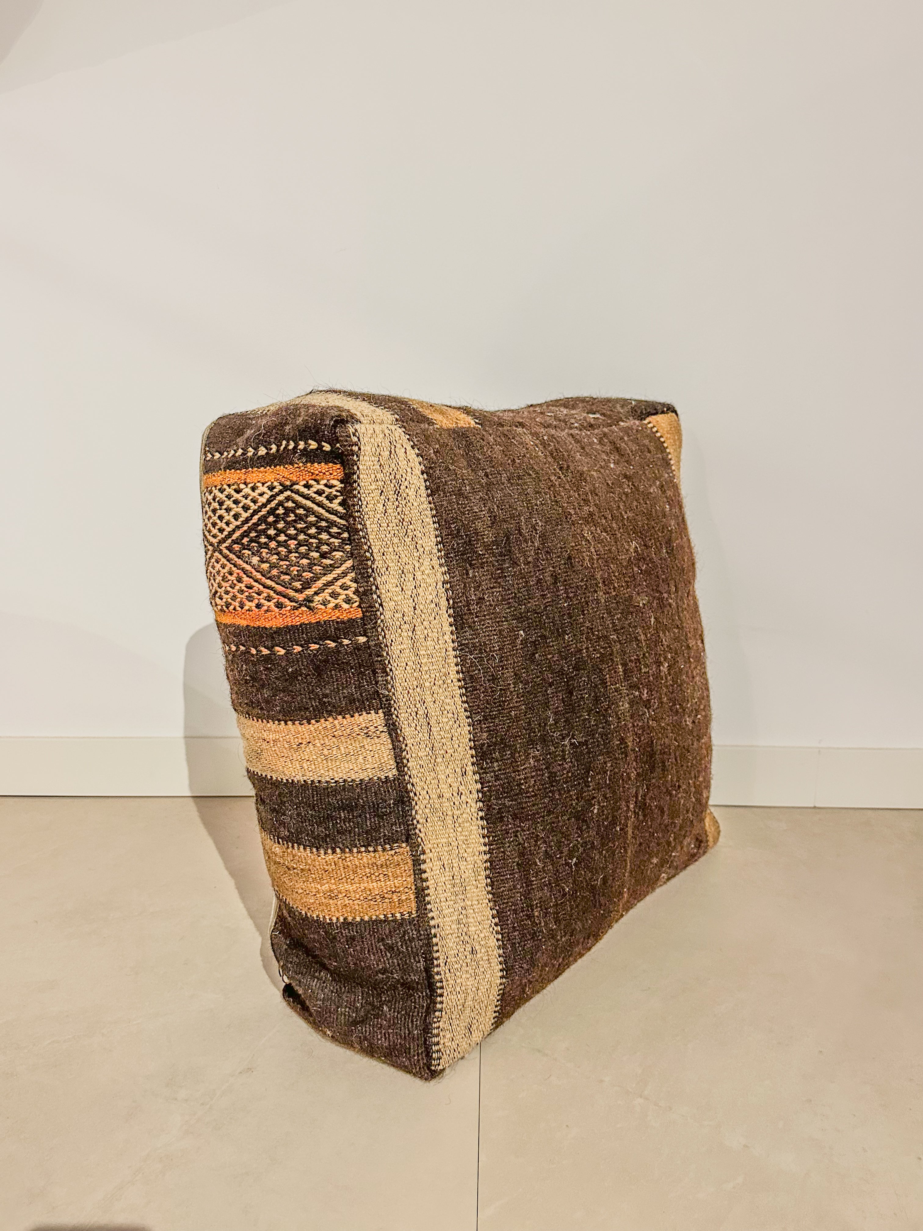 Elke poef is met de hand gemaakt van een vintage Marokkaans tapijt en is een uniek meesterwerk! De poef is een echt statement-stuk, de rijke kleuren en karakteristieke uitstraling van de poef maken het tot een opvallend item dat warmte en karakter geeft aan elke ruimte.