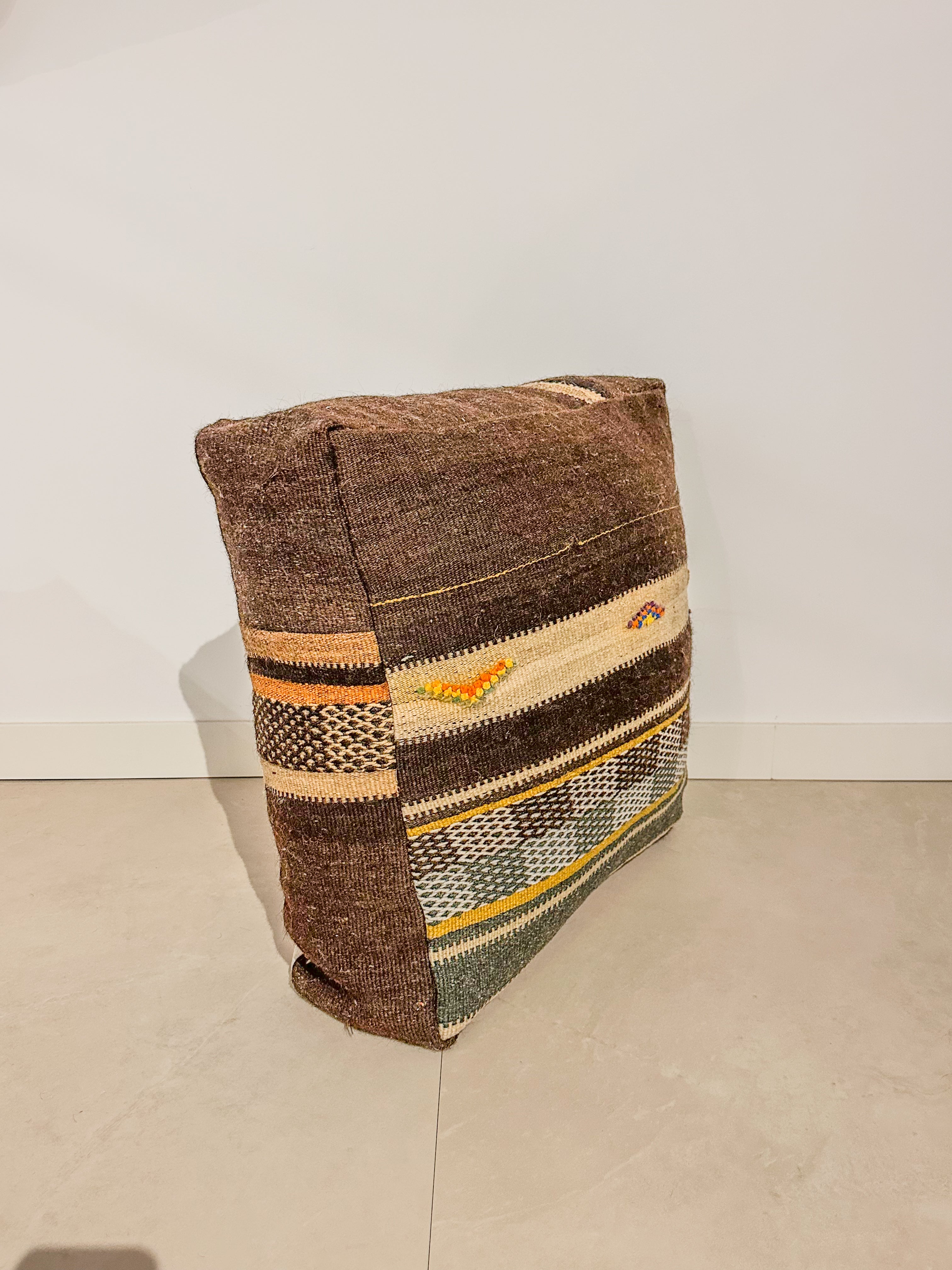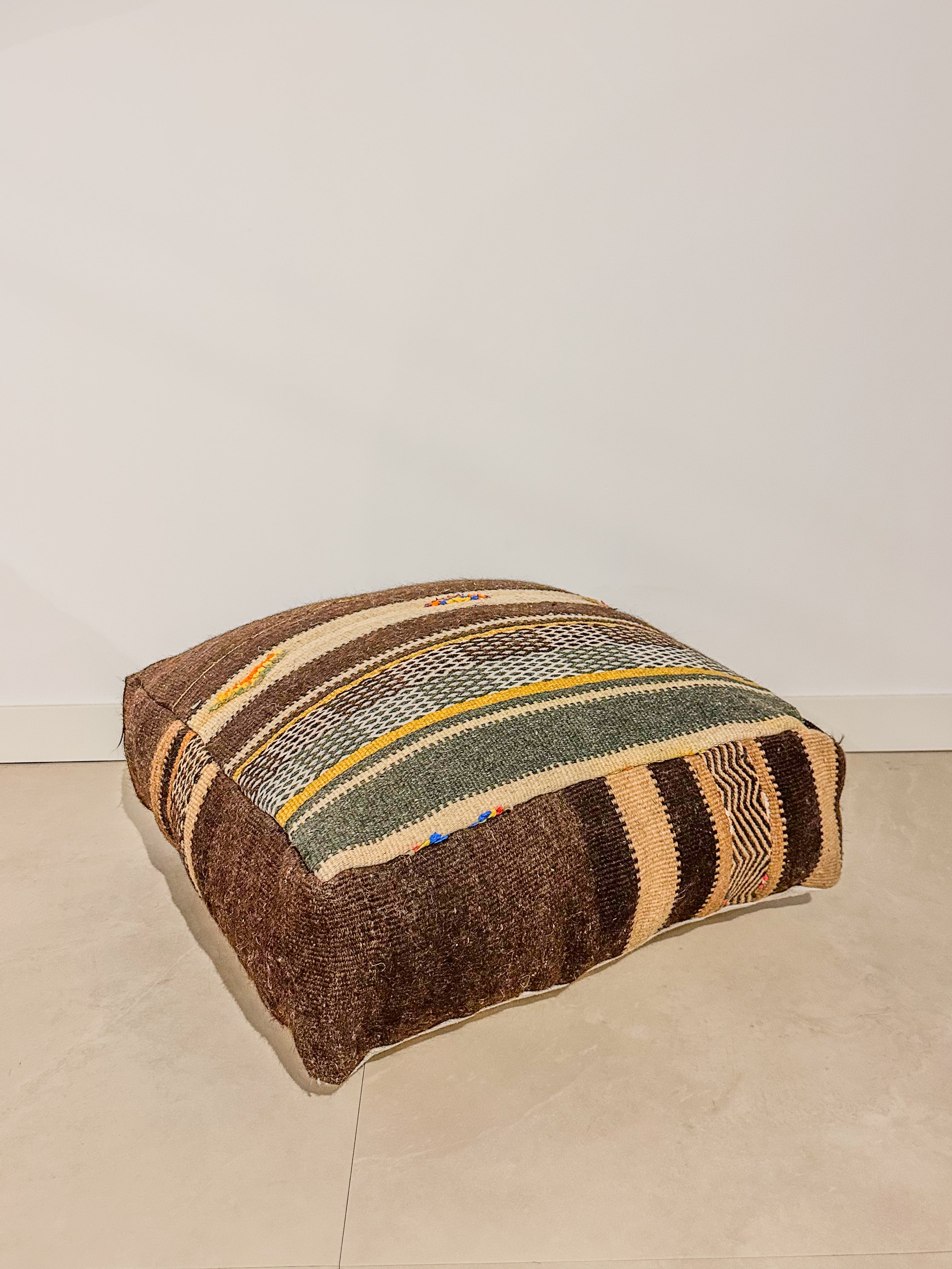 Elke poef is met de hand gemaakt van een vintage Marokkaans tapijt en is een uniek meesterwerk! De poef is een echt statement-stuk, de rijke kleuren en karakteristieke uitstraling van de poef maken het tot een opvallend item dat warmte en karakter geeft aan elke ruimte.