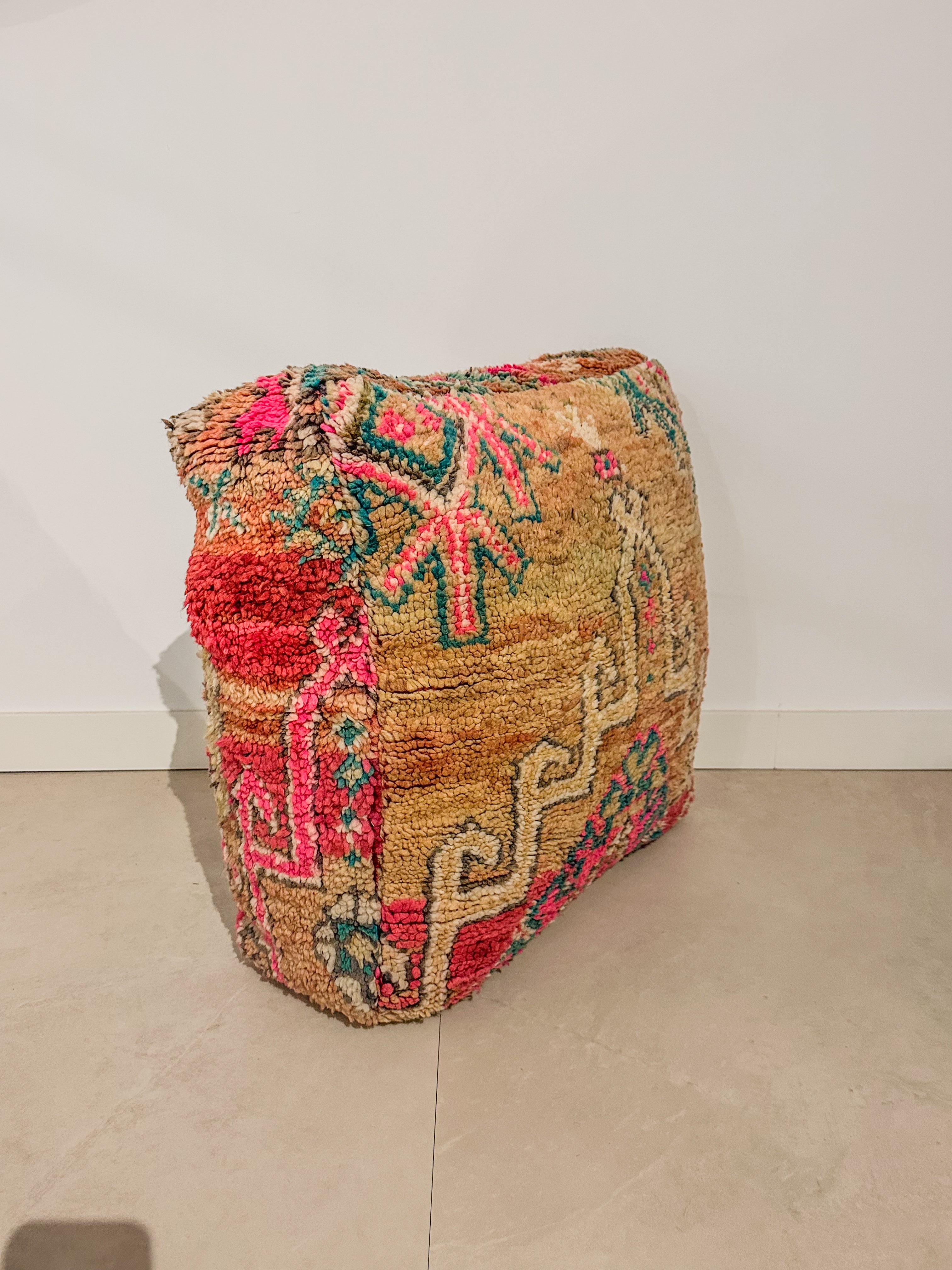 Elke poef is met de hand gemaakt van een vintage Marokkaans tapijt en is een uniek meesterwerk! De poef is een echt statement-stuk, de rijke kleuren en karakteristieke uitstraling van de poef maken het tot een opvallend item dat warmte en karakter geeft aan elke ruimte.