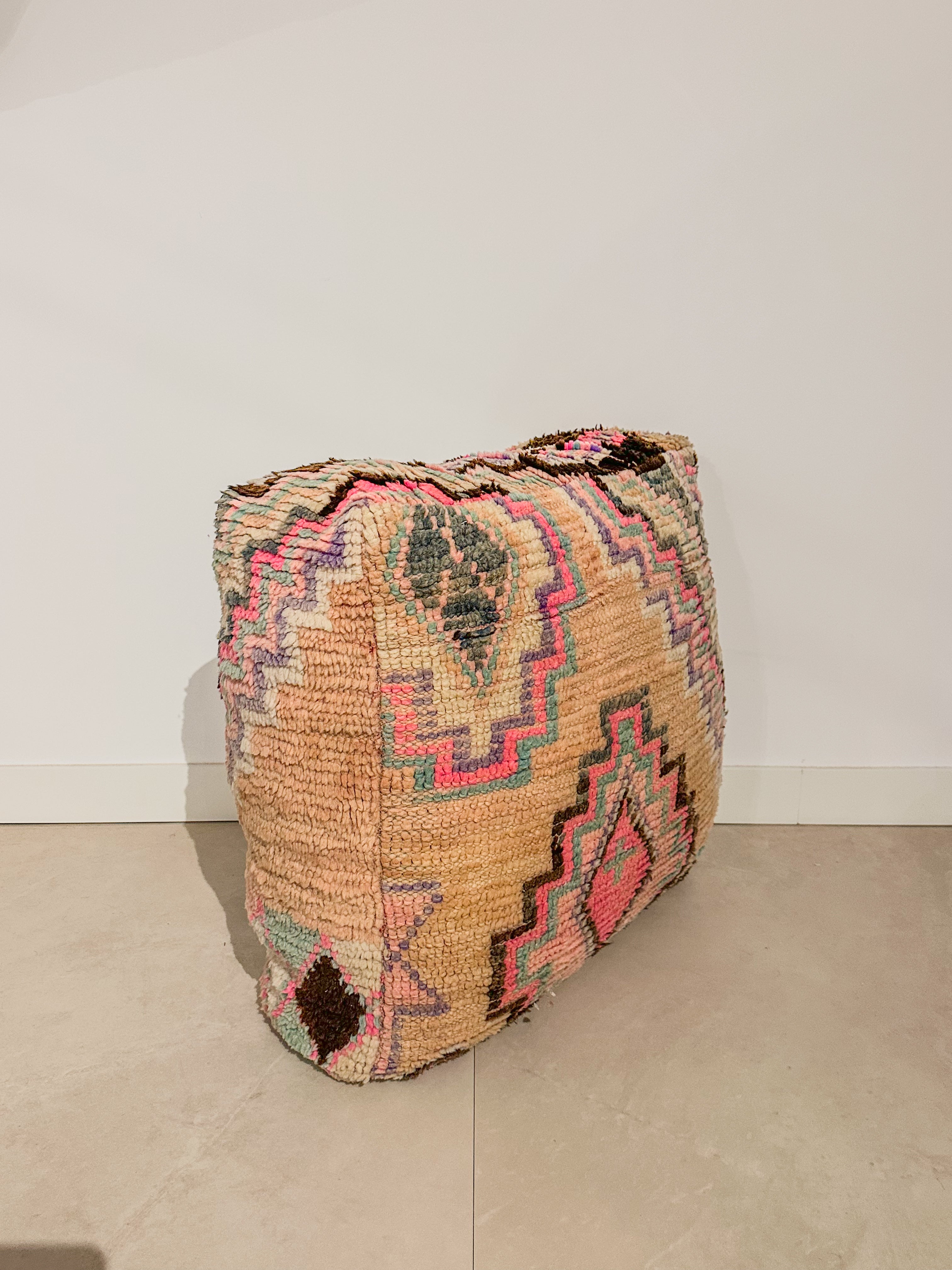 Elke poef is met de hand gemaakt van een vintage Marokkaans tapijt en is een uniek meesterwerk! De poef is een echt statement-stuk, de rijke kleuren en karakteristieke uitstraling van de poef maken het tot een opvallend item dat warmte en karakter geeft aan elke ruimte.