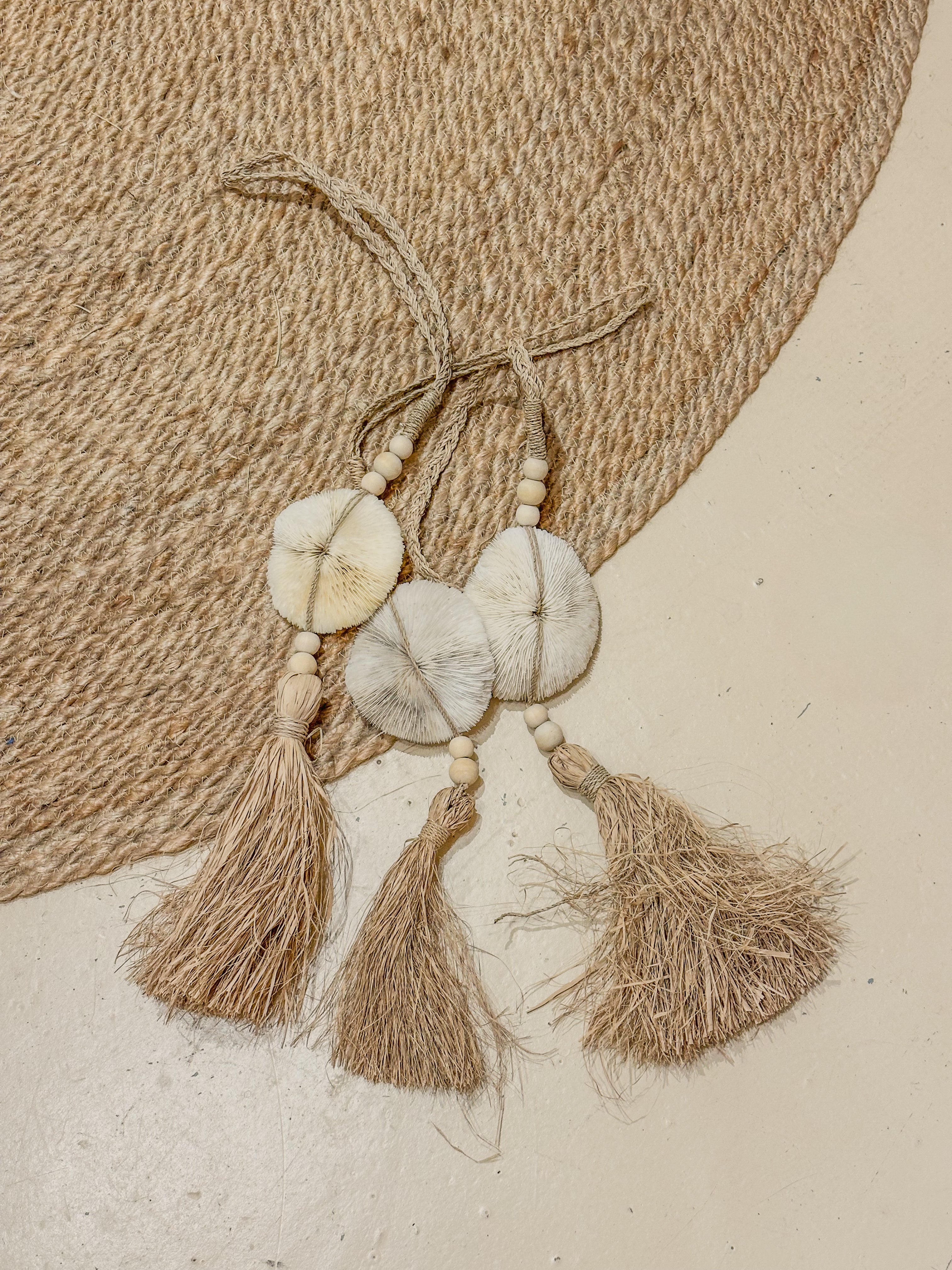 Decoratieve hanger met natuurlijke schelpstructuur, kralen & raffia kwast – handgemaakt Deze prachtige hanger is volledig handgemaakt van natuurlijke materialen...