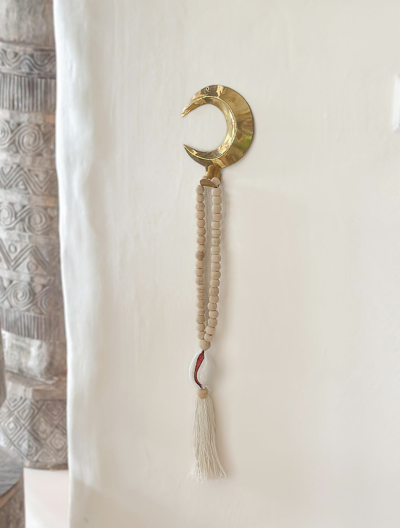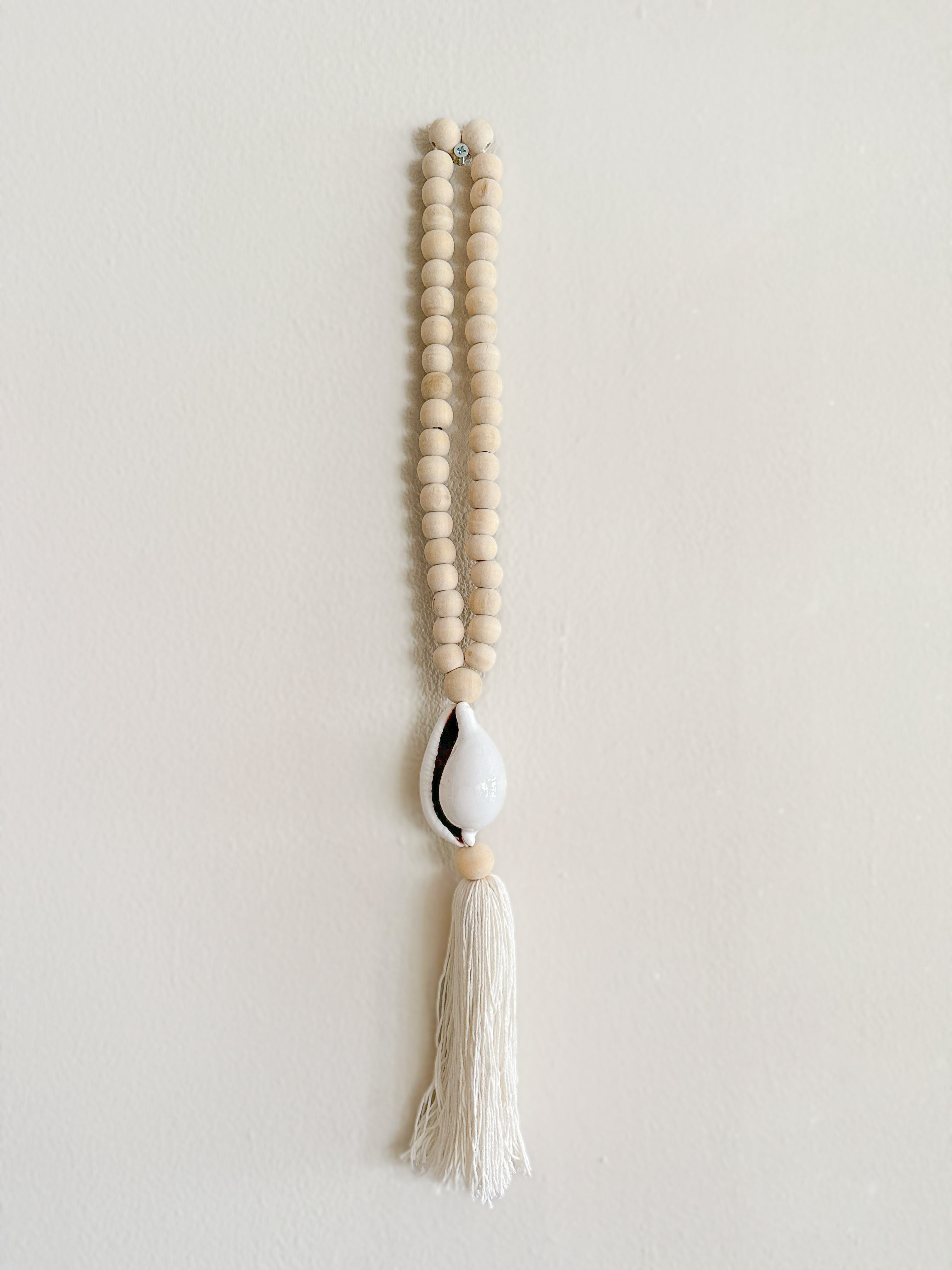 Breng natuurlijke warmte en elegantie in je interieur met deze handgemaakte decoratieve ketting. De combinatie van hout, witte tijgerschelp en witte tassel, maakt deze ketting een uniek en tijdloos accessoire. De natuurlijke materialen en neutrale tinten zorgen voor een rustieke uitstraling die in elke woonstijl past.
