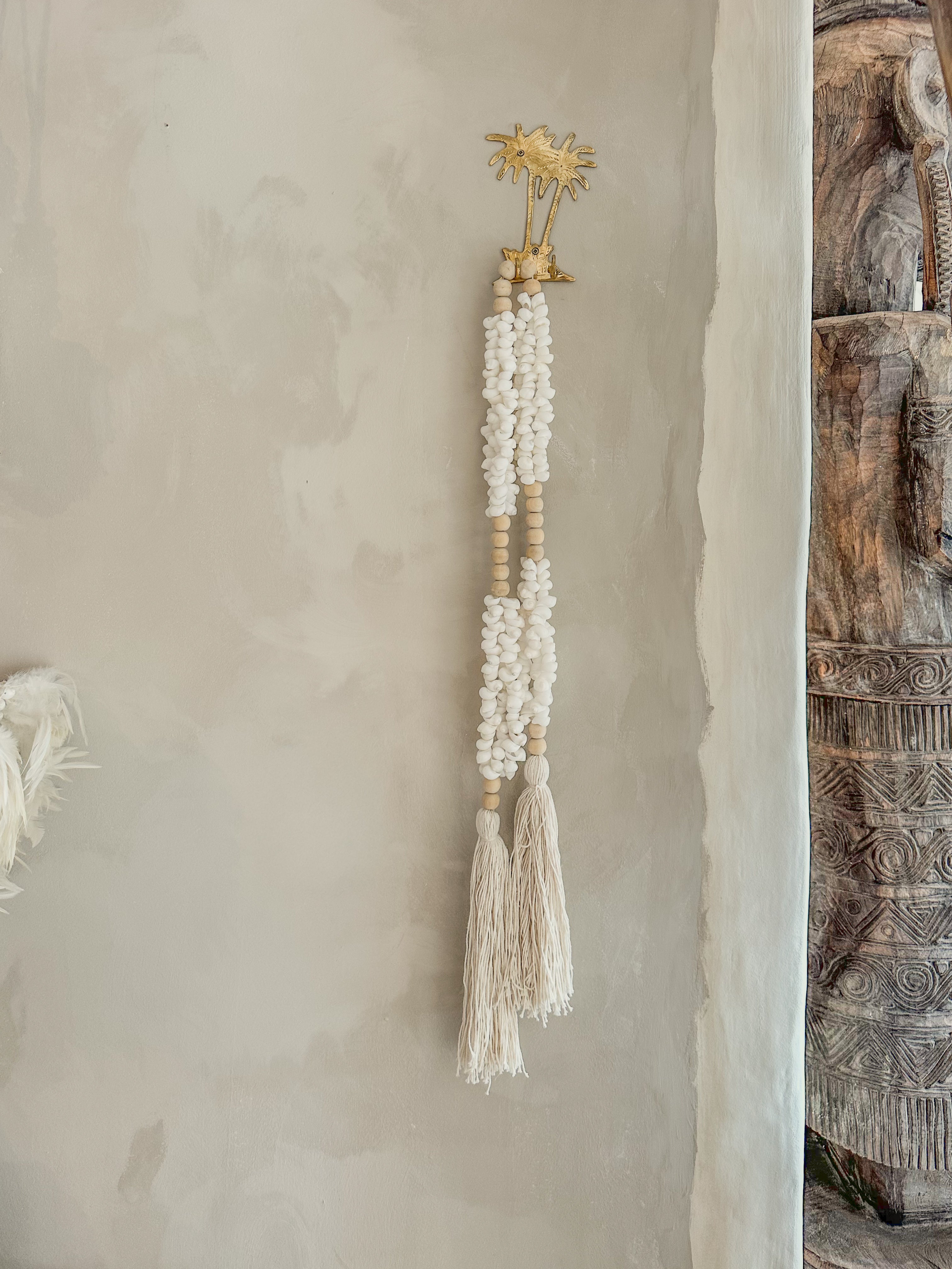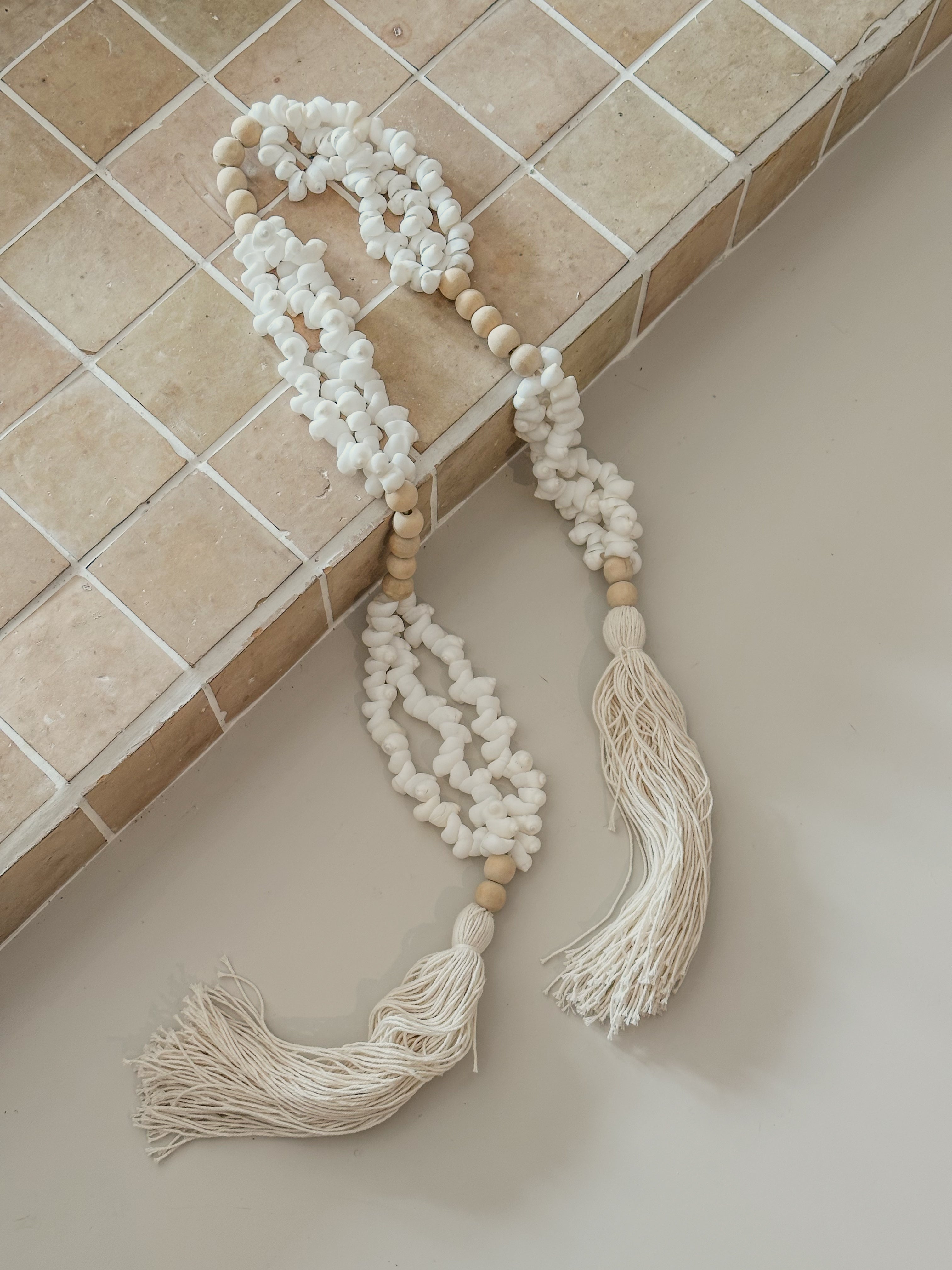 Deze prachtige handgemaakte schelpenketting is een echte sfeermaker in huis. De combinatie van natuurlijke schelpen, houten kralen en katoenen kwasten zorgt voor een unieke, bohemian uitstraling. Hang de ketting aan een wandhaak, deurknop of gebruik hem als stylingobject in een schaal of over een kastdeur.