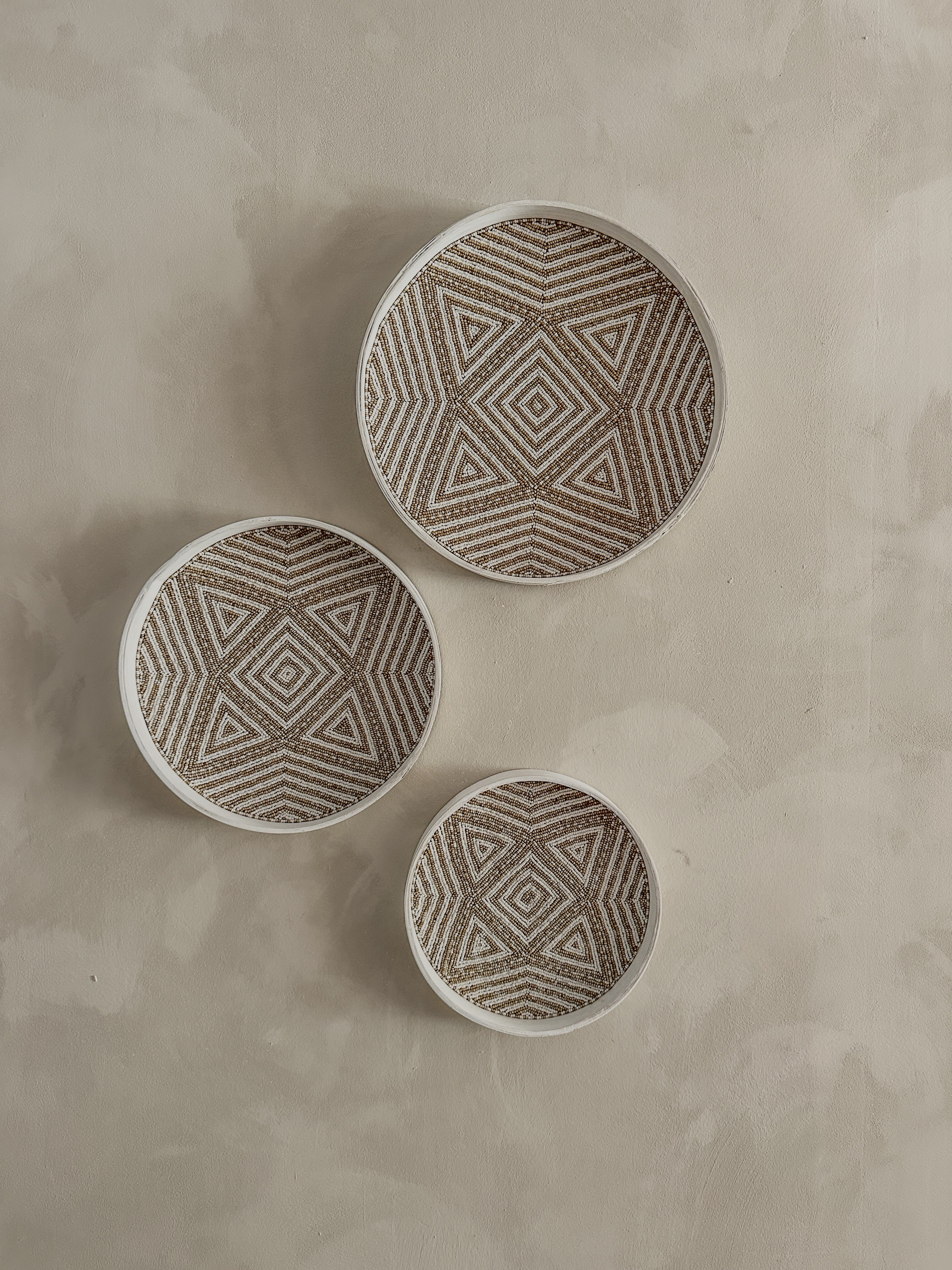 Deze prachtige decoratieve schalen zijn gemaakt van gevlochten rotan en ingelegd met een verfijnd patroon van witte en beige glaskralen.