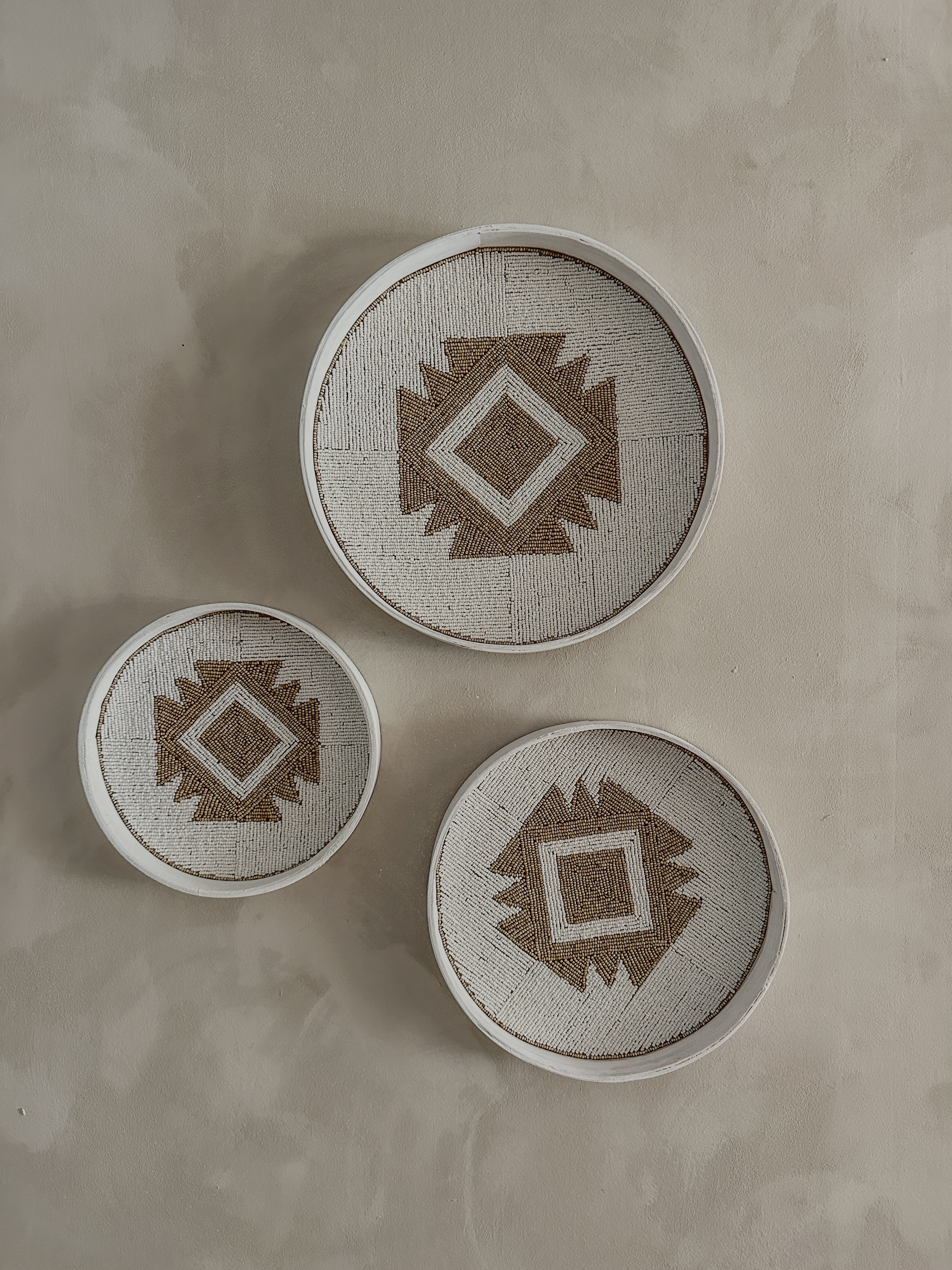 Deze prachtige decoratieve schalen zijn gemaakt van gevlochten rotan en ingelegd met een verfijnd patroon van witte glaskralen en kauri...