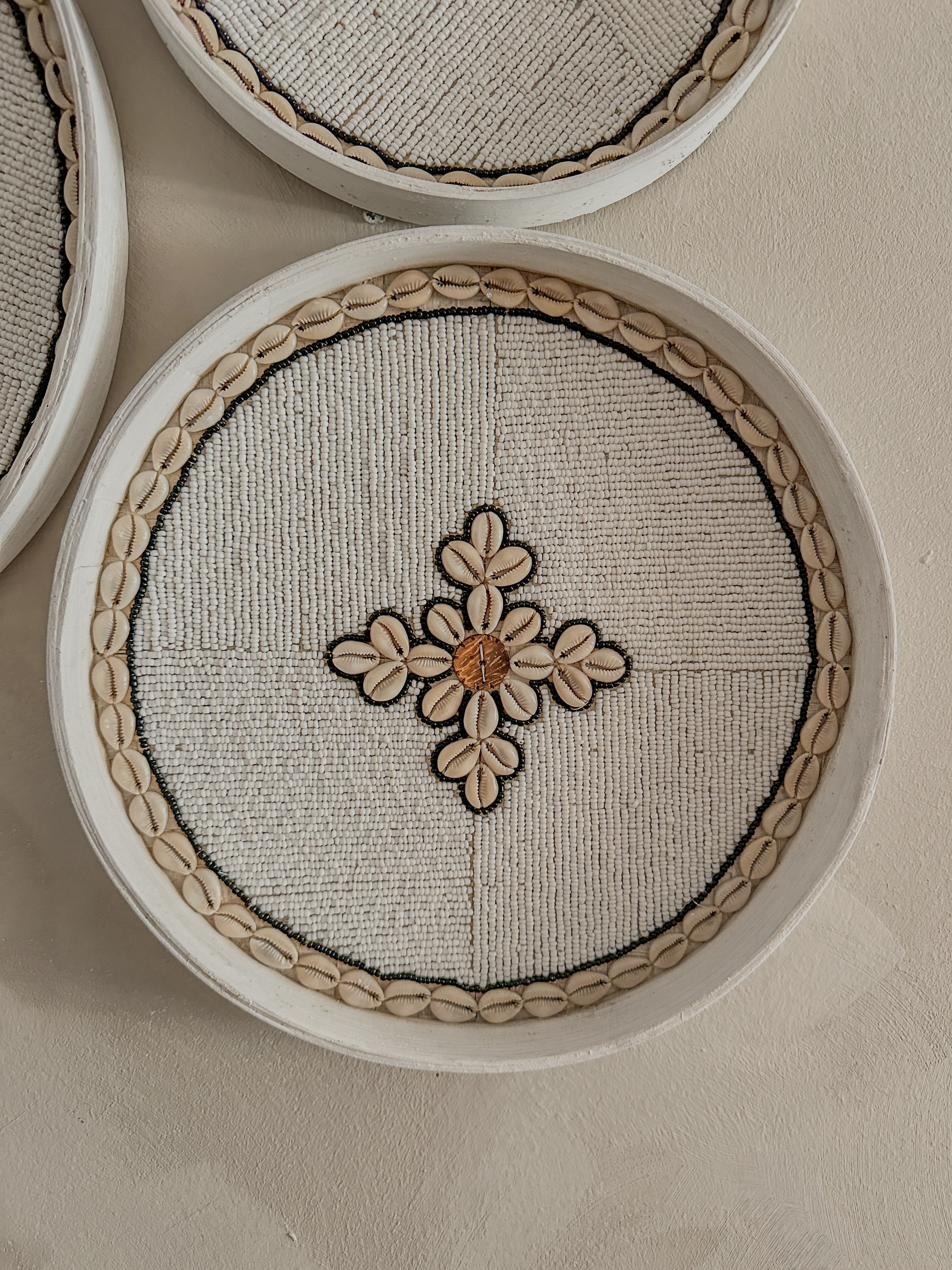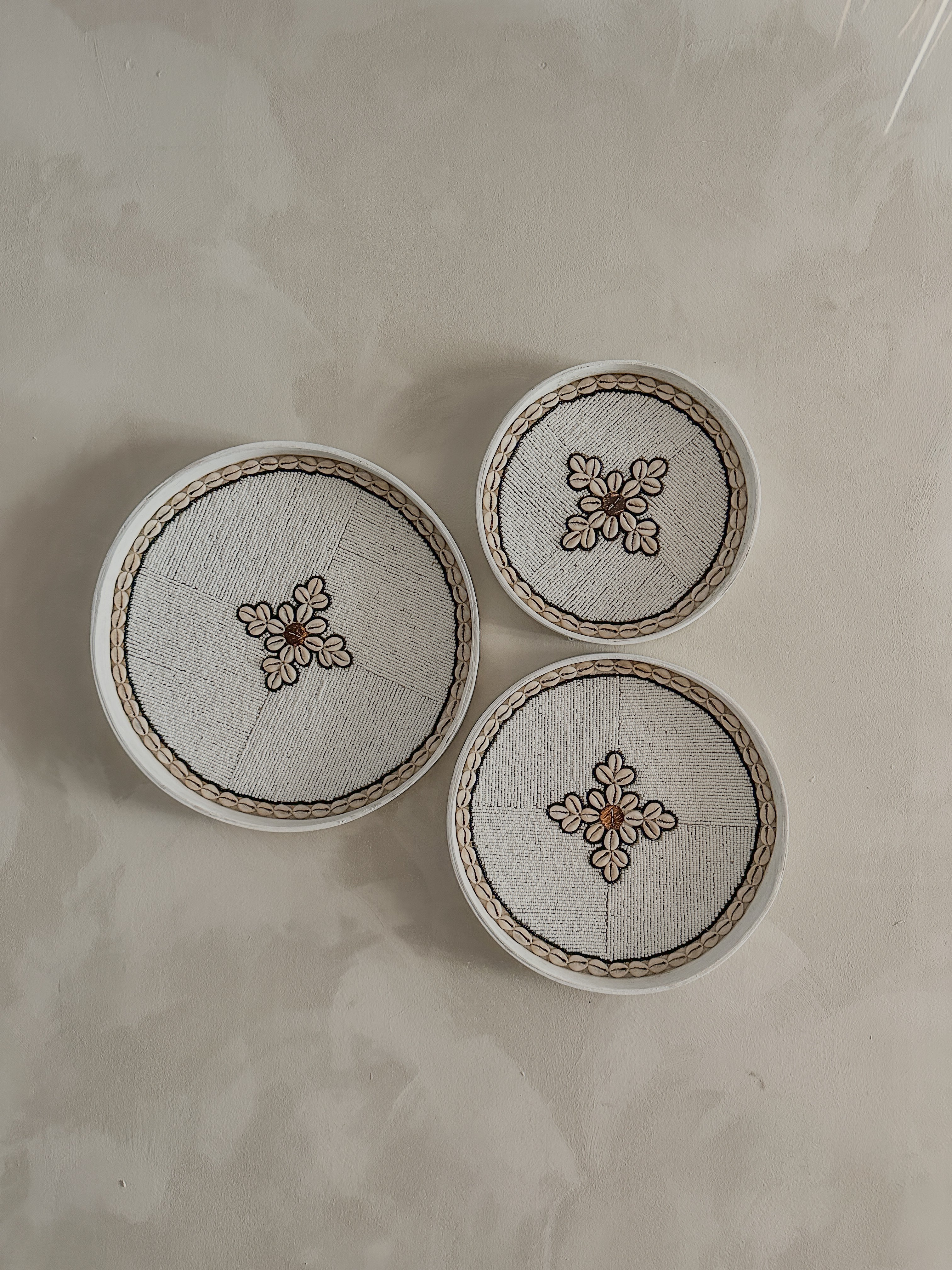 Deze prachtige decoratieve schalen zijn gemaakt van gevlochten rotan en ingelegd met een verfijnd patroon van witte glaskralen en kauri schelpen.