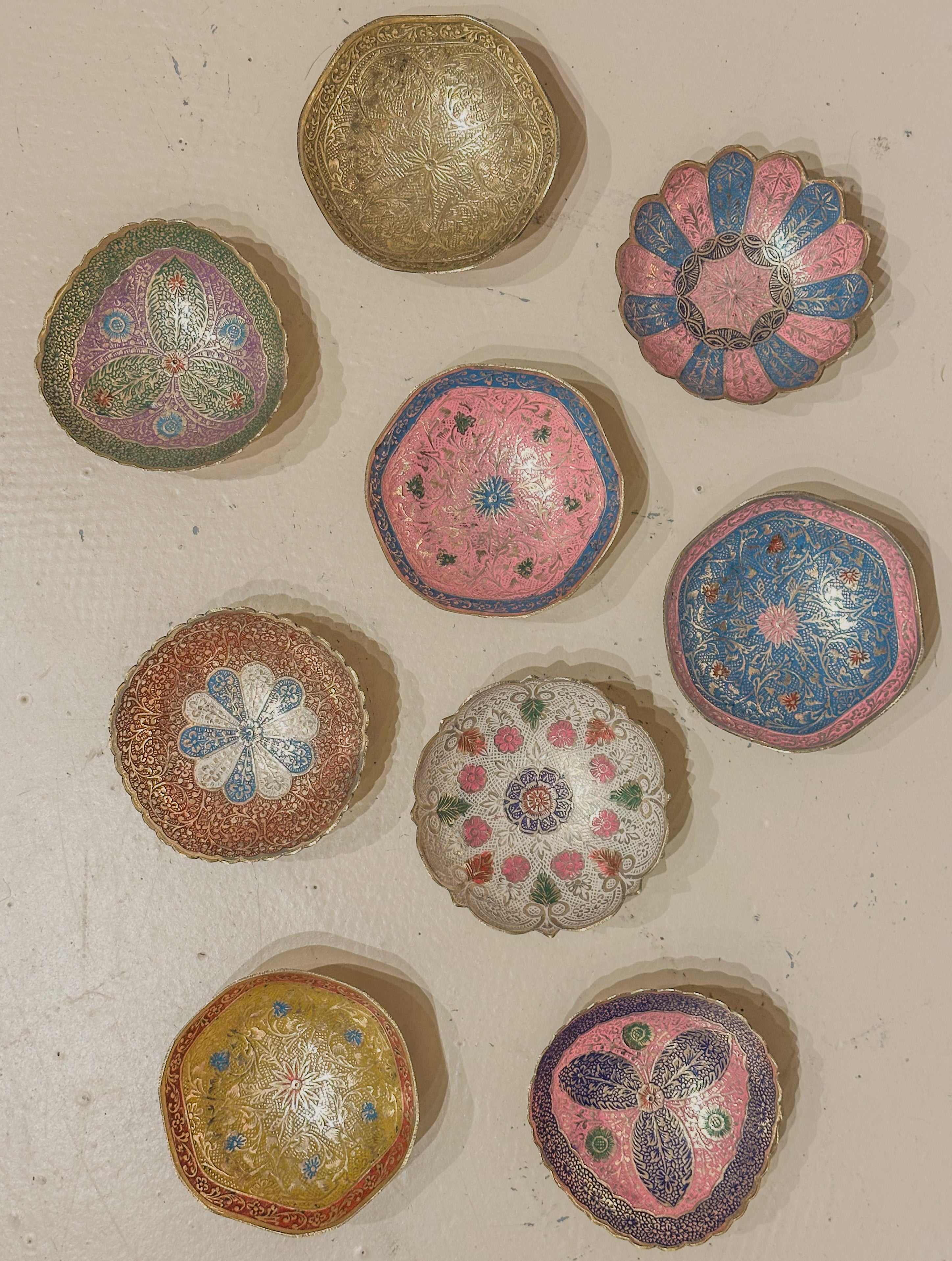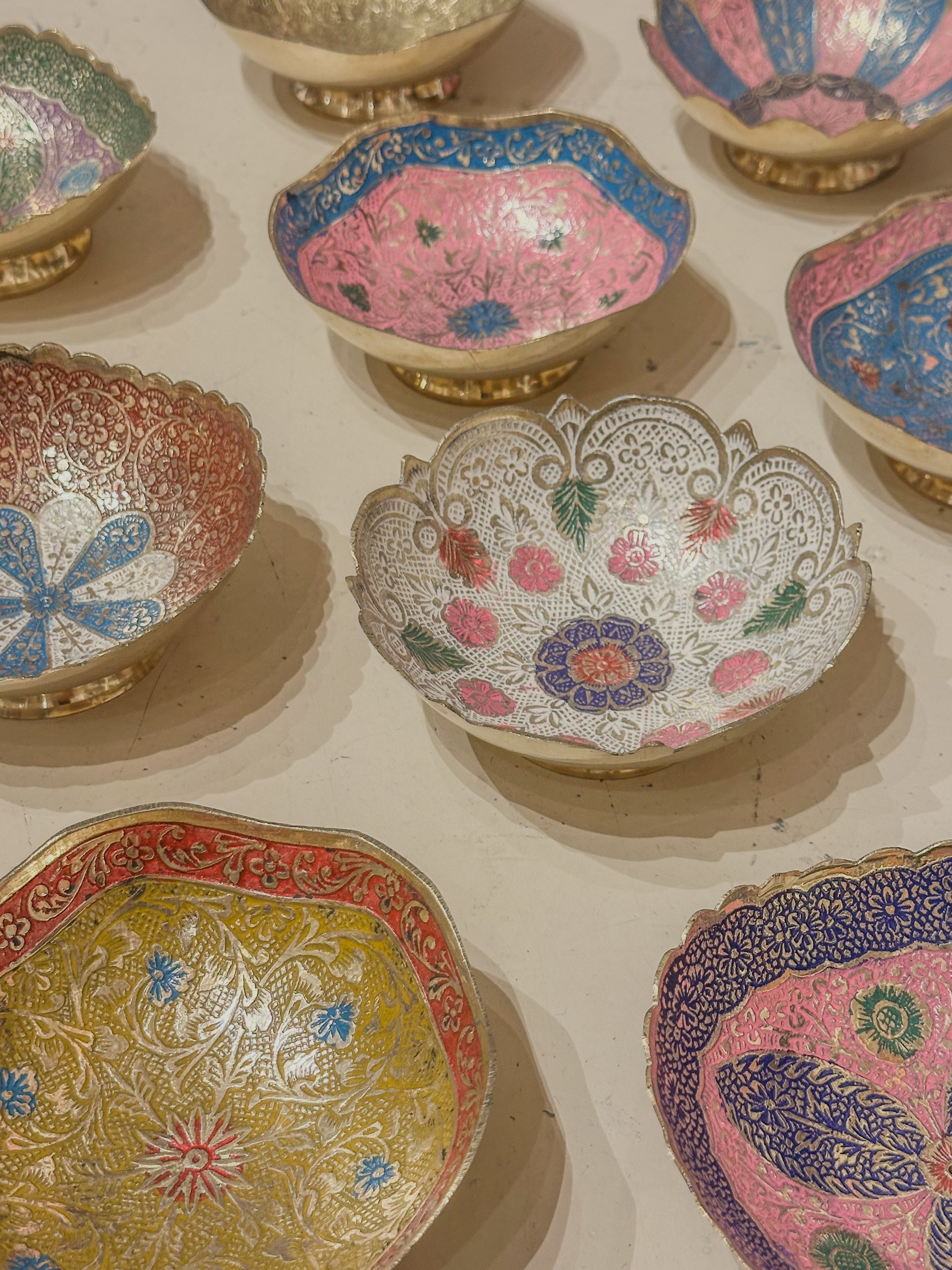 Deze prachtige schaaltjes zijn gemaakt van messing en met de hand beschilderd in kleurrijke patronen.