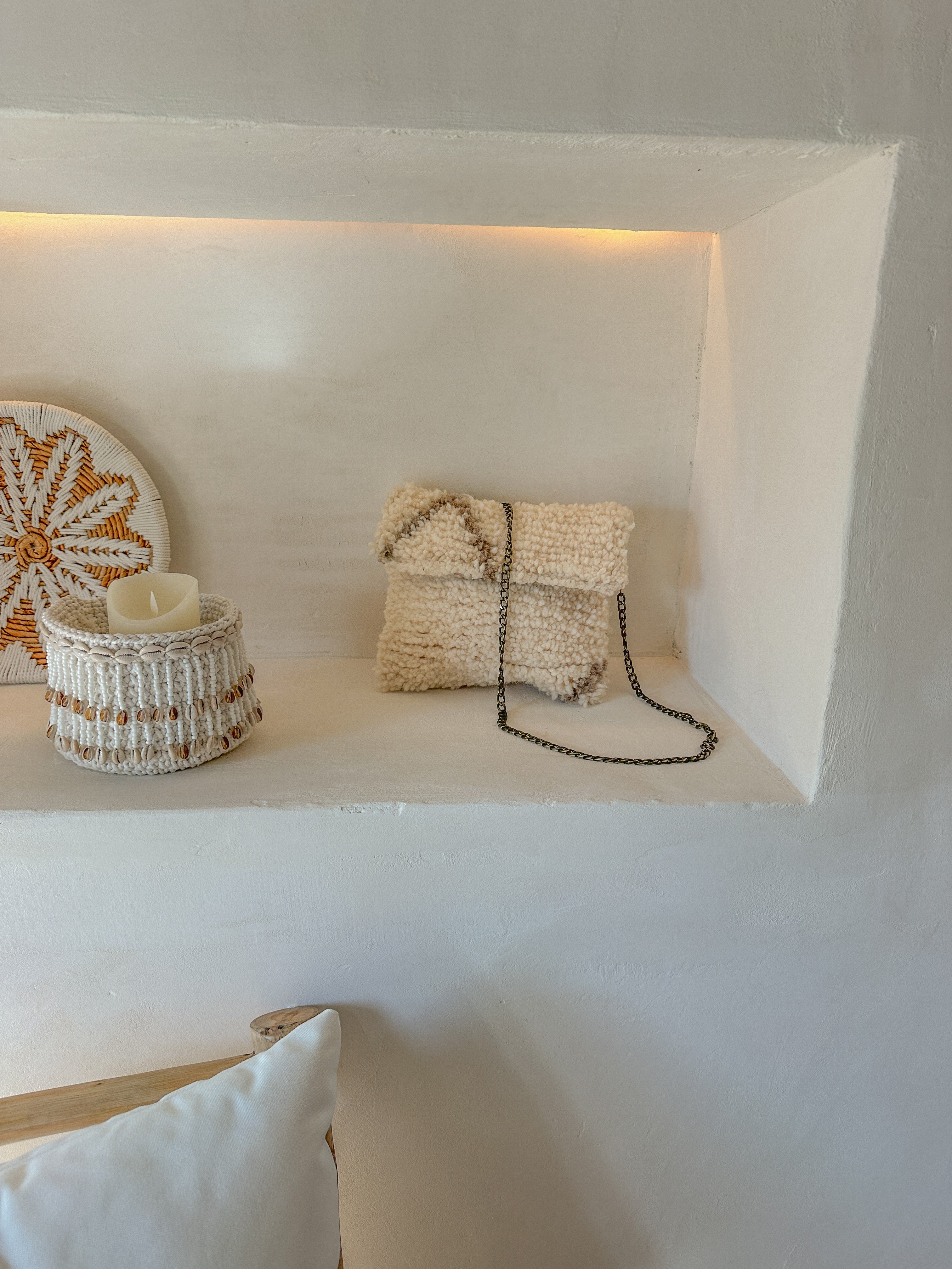Dit unieke handgemaakte tasje uit Marokko is vervaardigd van originele Beni Ouarain wol, bekend van de iconische Berber vloerkleden.