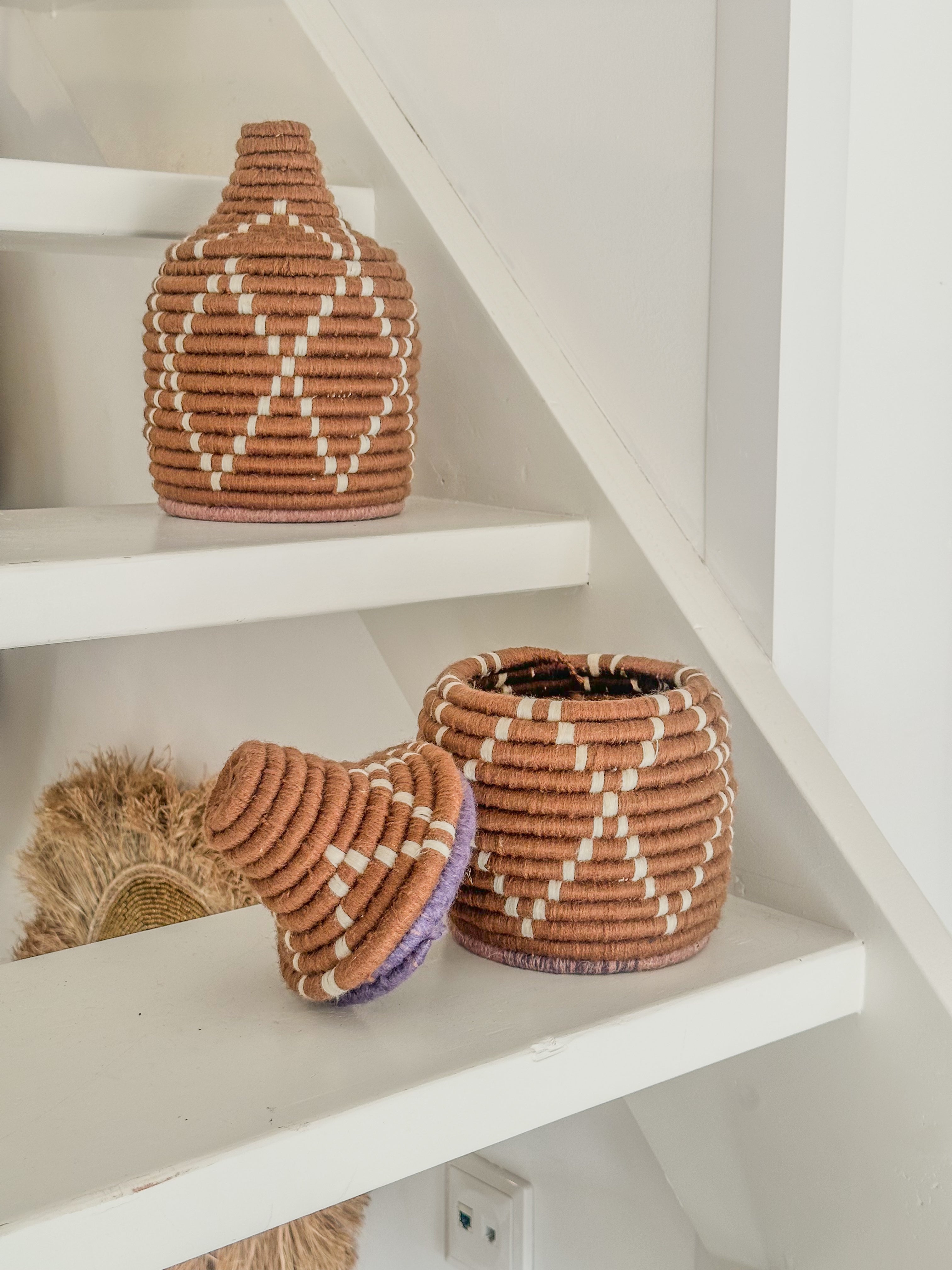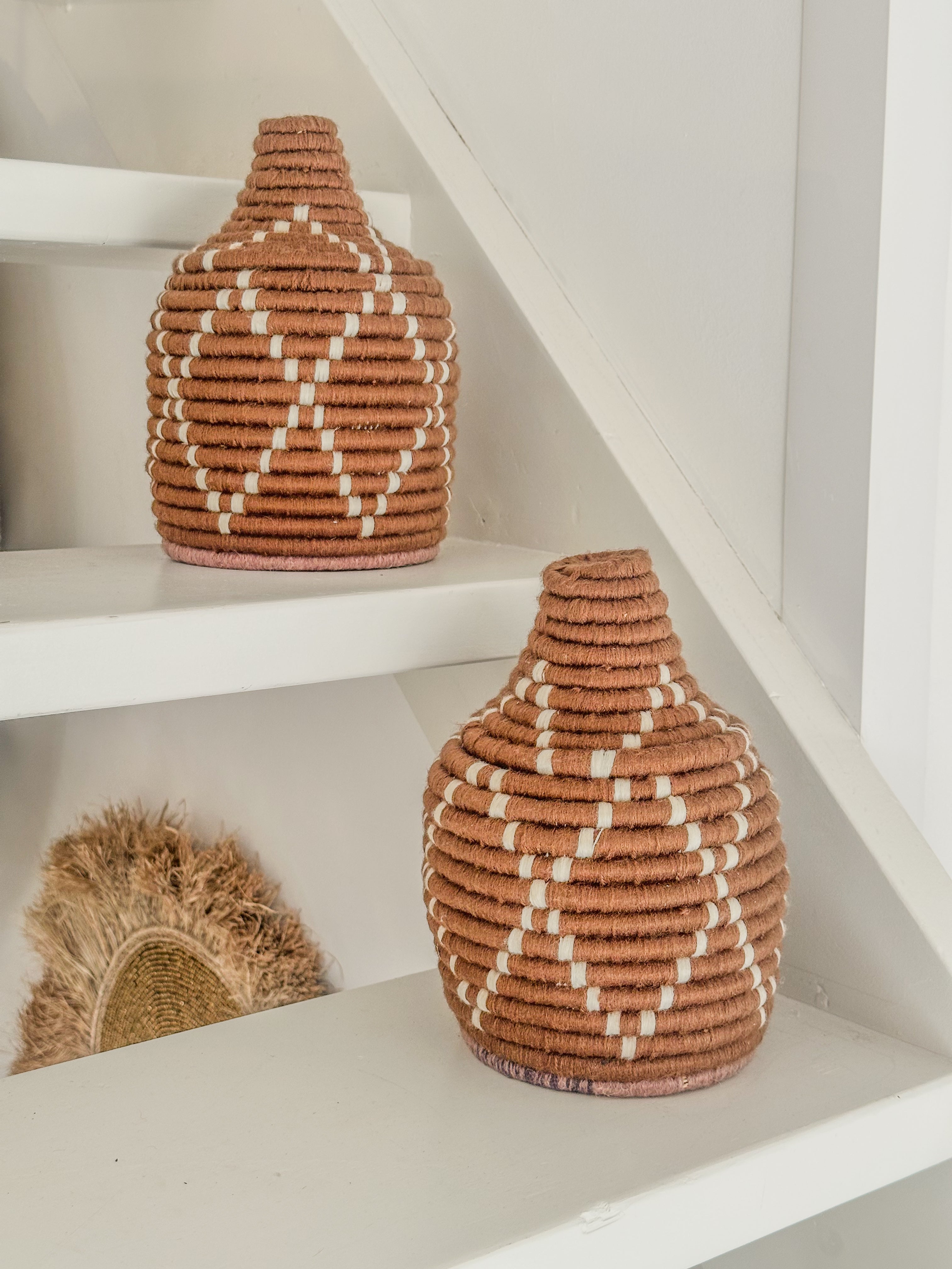 Dit charmante handgemaakte mandje uit Marokko is vervaardigd uit natuurlijk zeegras en omvlochten met wol in warme aardetinten. Elk mandje is uniek en heeft zijn eigen subtiele verschillen in vorm, kleur en afwerking, waardoor je altijd een one of a kind exemplaar in huis haalt.