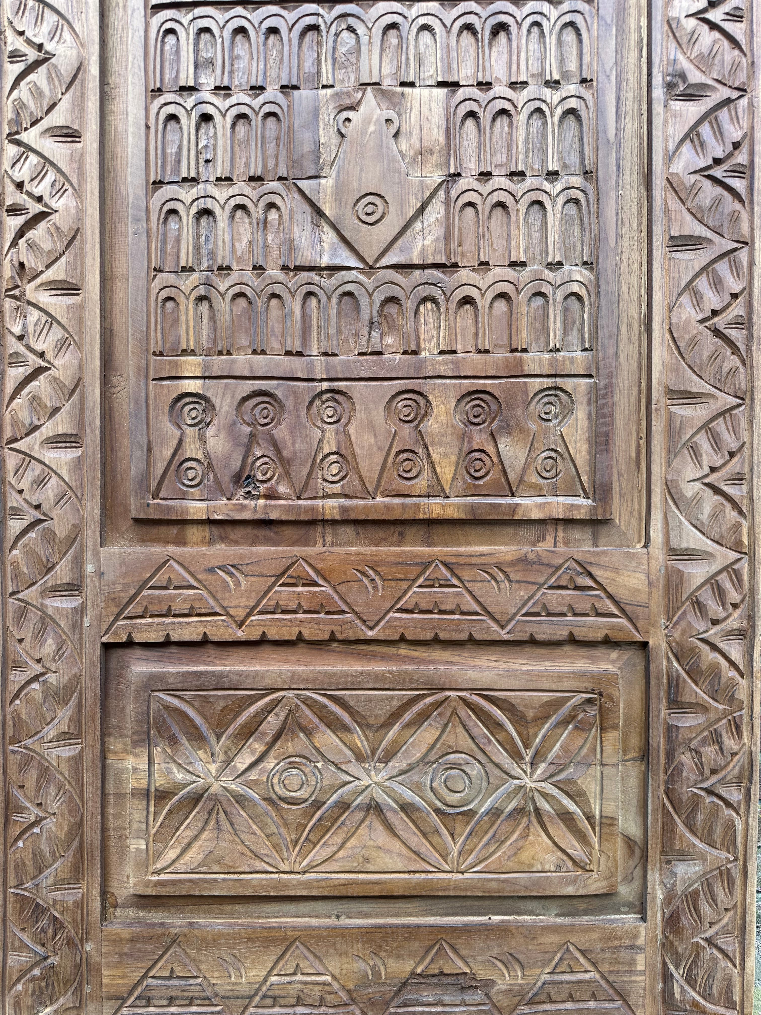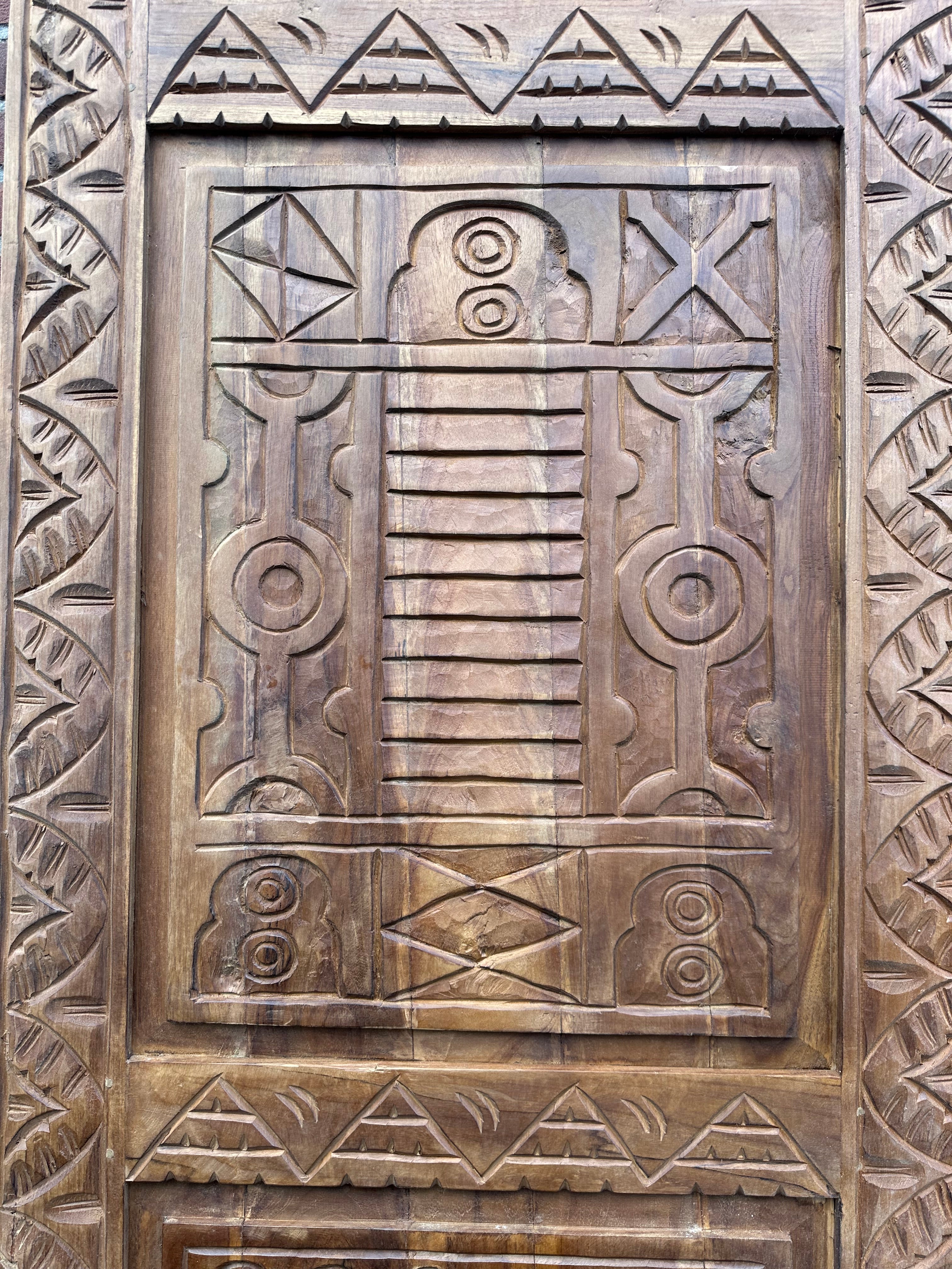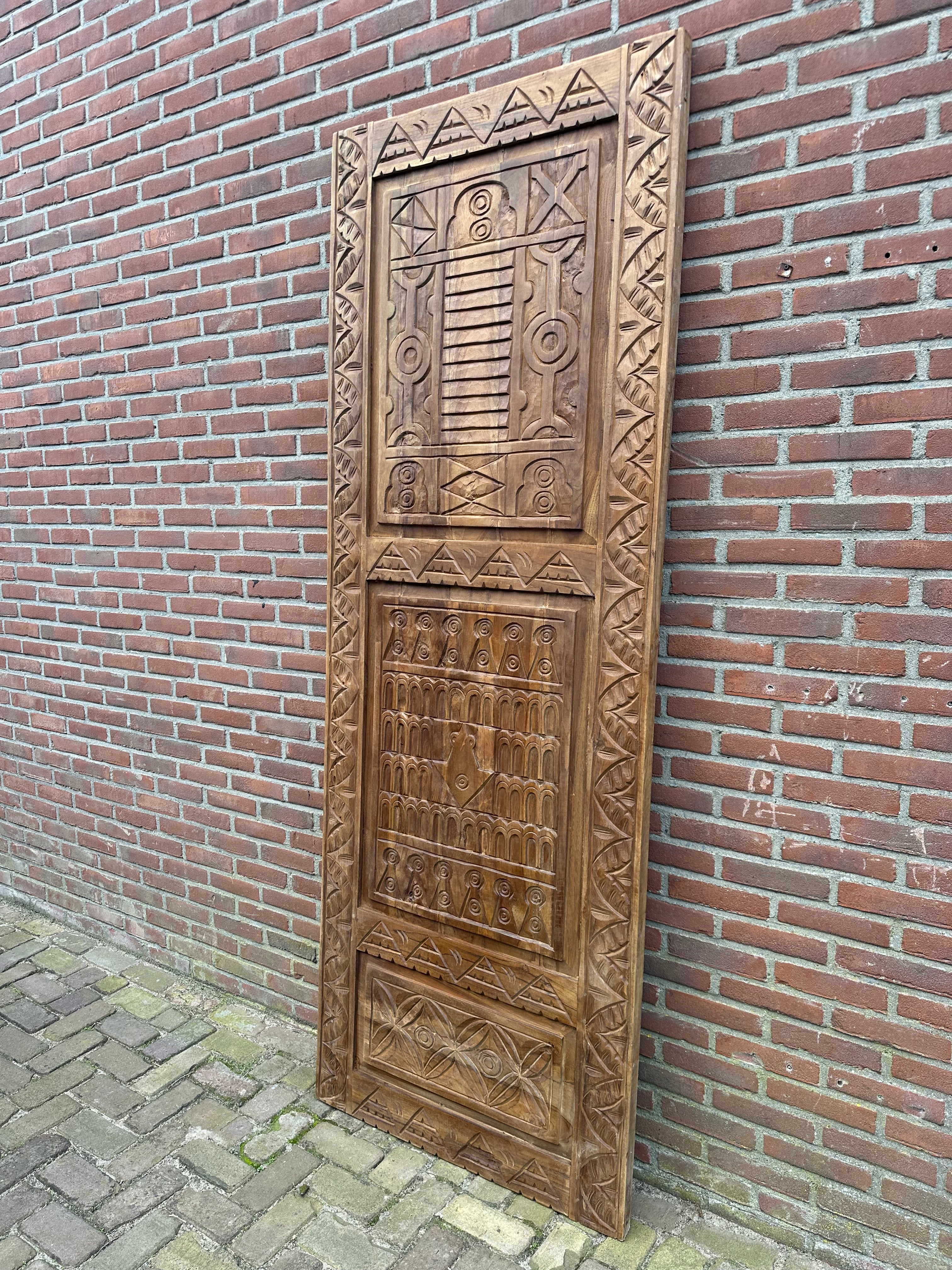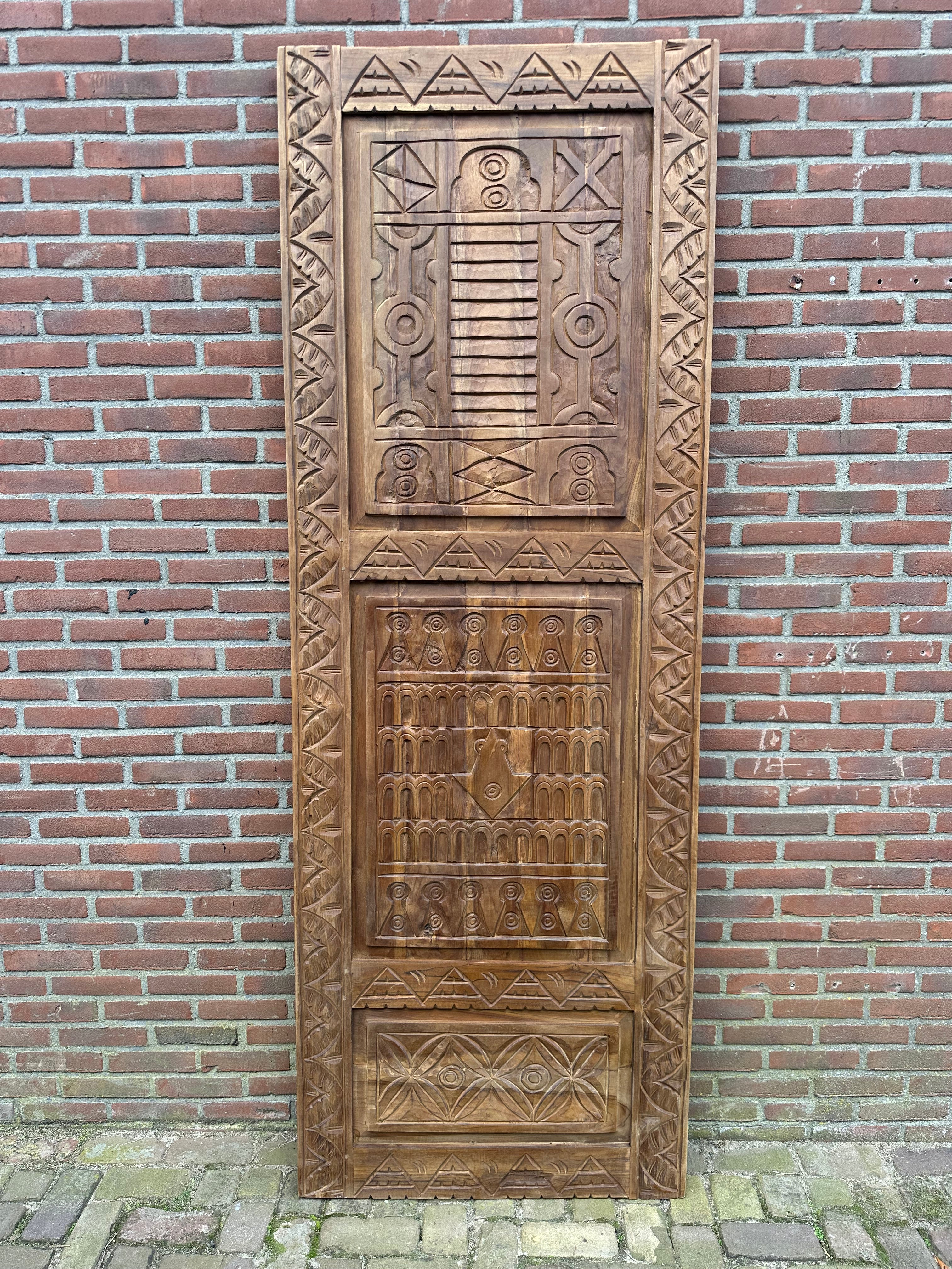 Dit indrukwekkende handgemaakte teak houten paneel uit Indonesië is een uniek kunstwerk dat zowel als deur of als wanddecoratie gebruikt kan worden. Het massieve teak hout is rijkelijk voorzien van met de hand uitgesneden patronen en symbolen, waardoor elk stuk volledig uniek is.