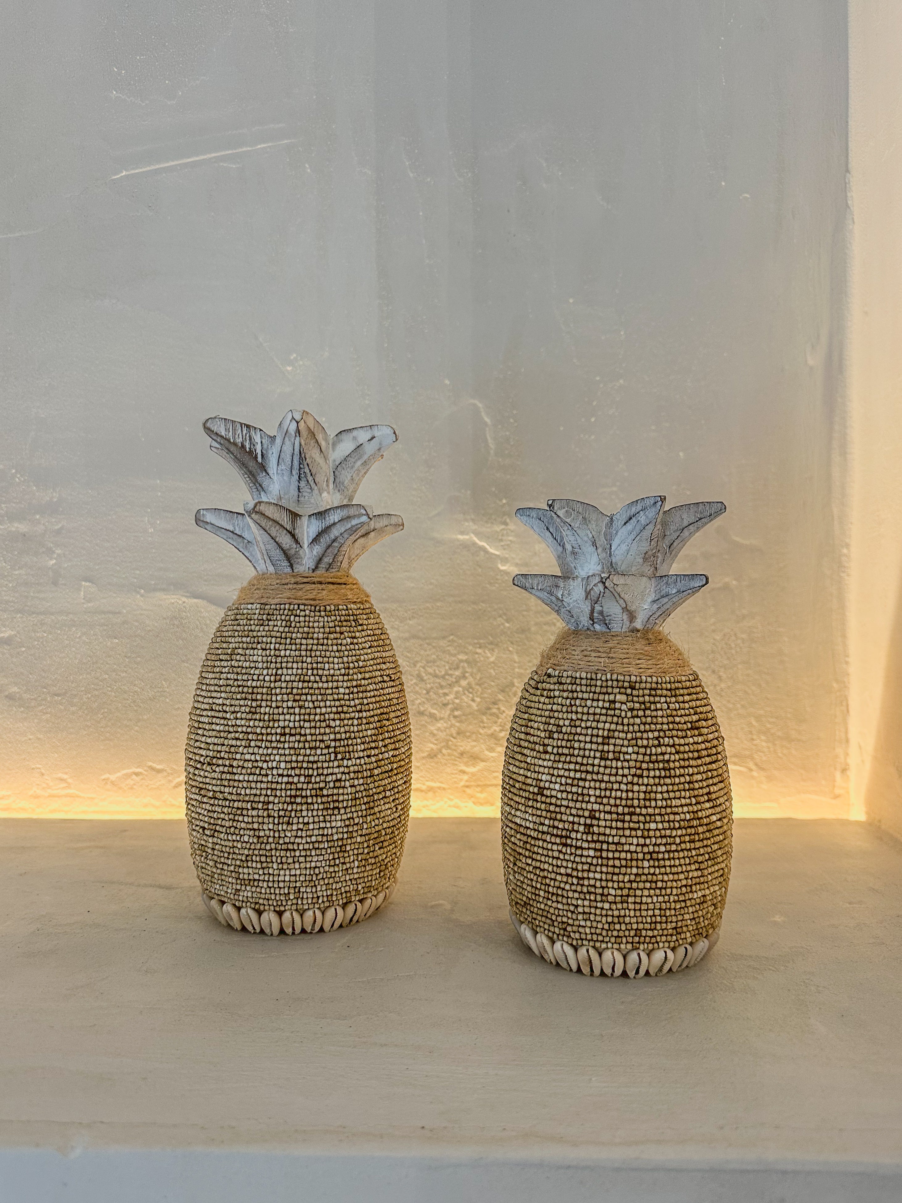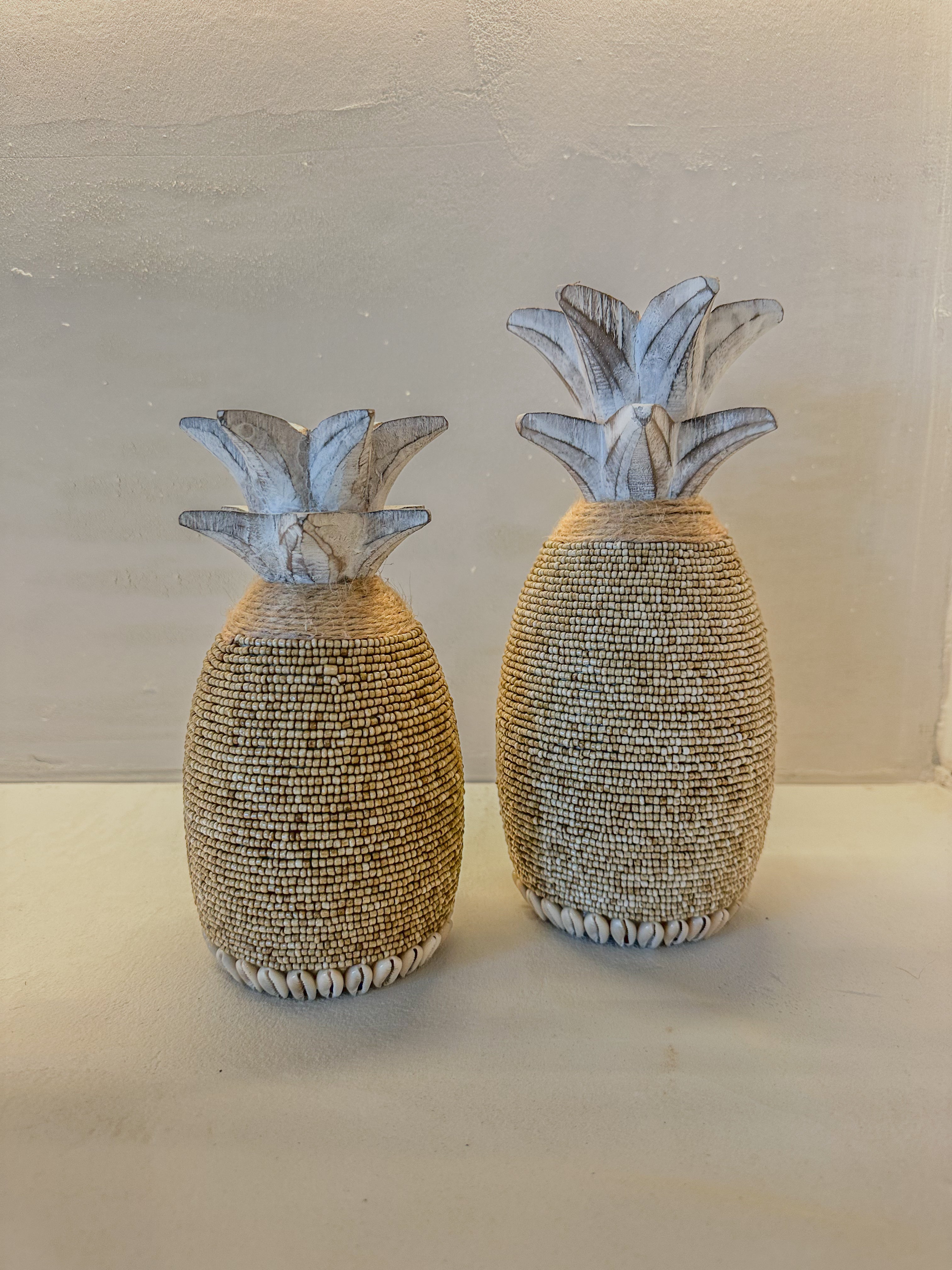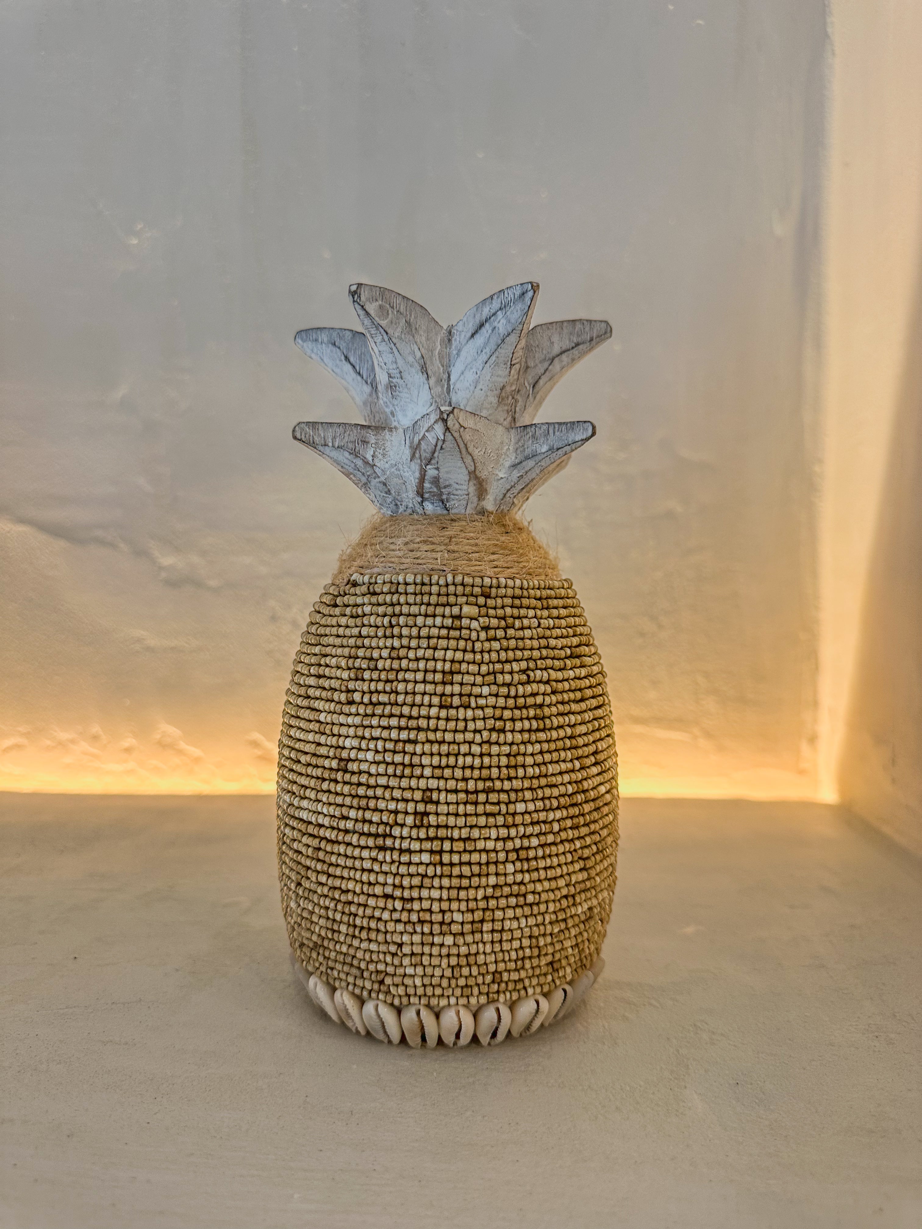De ananas is vervaardigd uit whitewash hout en rijkelijk versierd met beige glaskralen, jute touw en een randje kauri schelpen voor een natuurlijke, boho uitstraling.