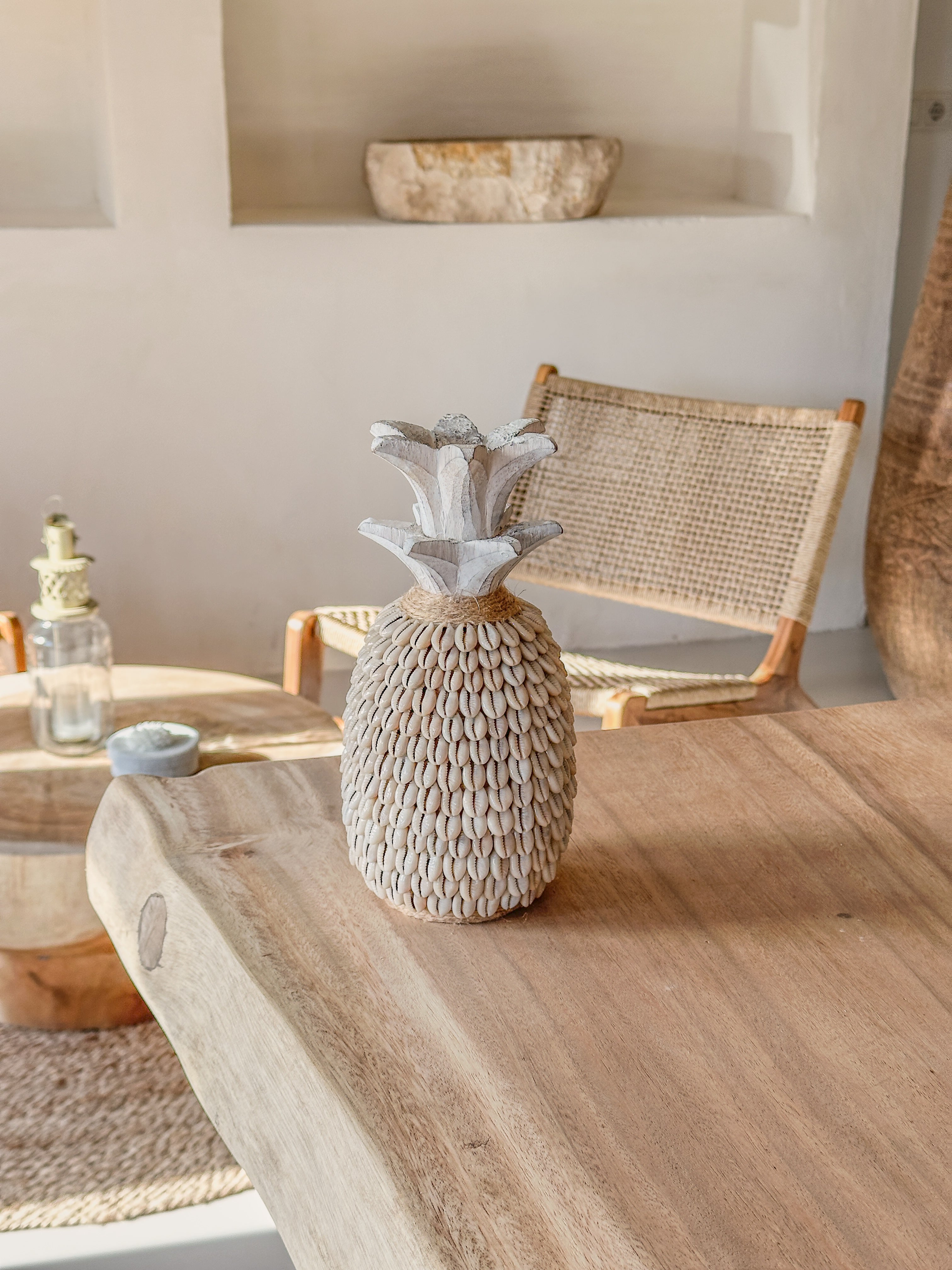 De ananas is vervaardigd uit whitewash hout en rijkelijk versierd met kauri schelpjes en jute touw voor een natuurlijke, boho uitstraling.