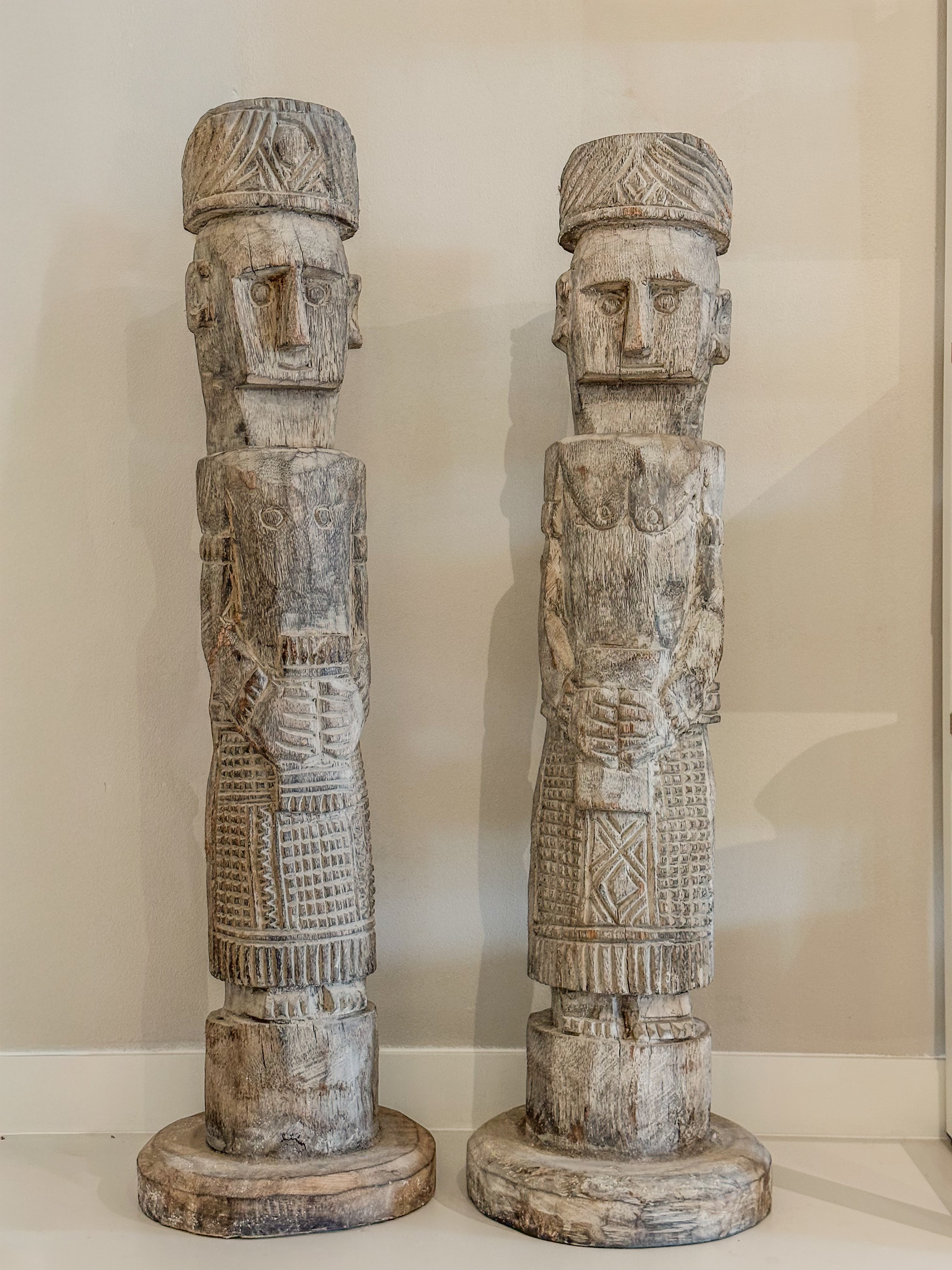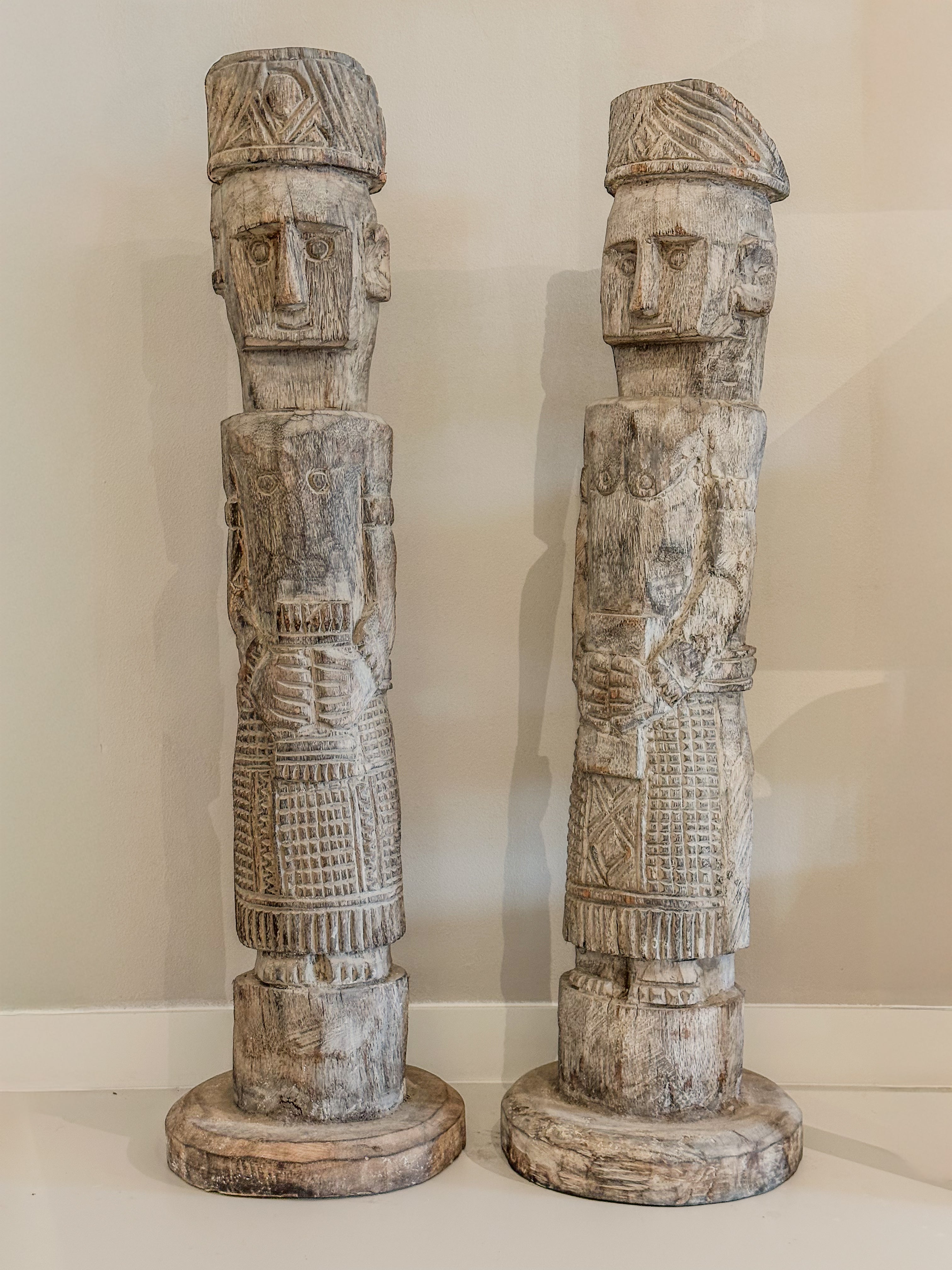 Elk beeld is ca. 116 cm hoog, heeft een slanke vorm van 20 cm doorsnede en staat stevig op een ronde voet van 30 cm doorsnede. De verweerde whitewash afwerking geeft de beelden een stoere en karaktervolle uitstraling.