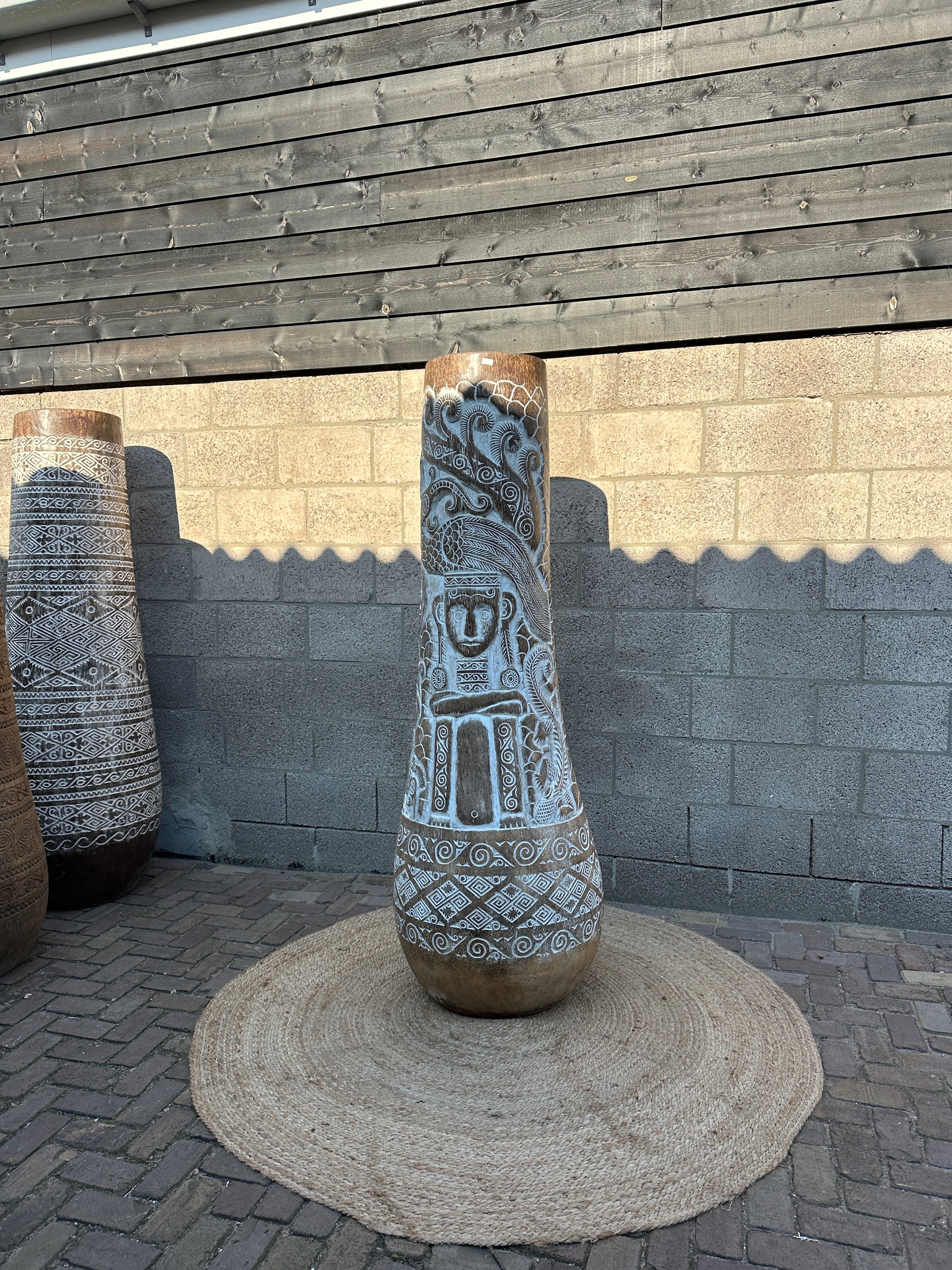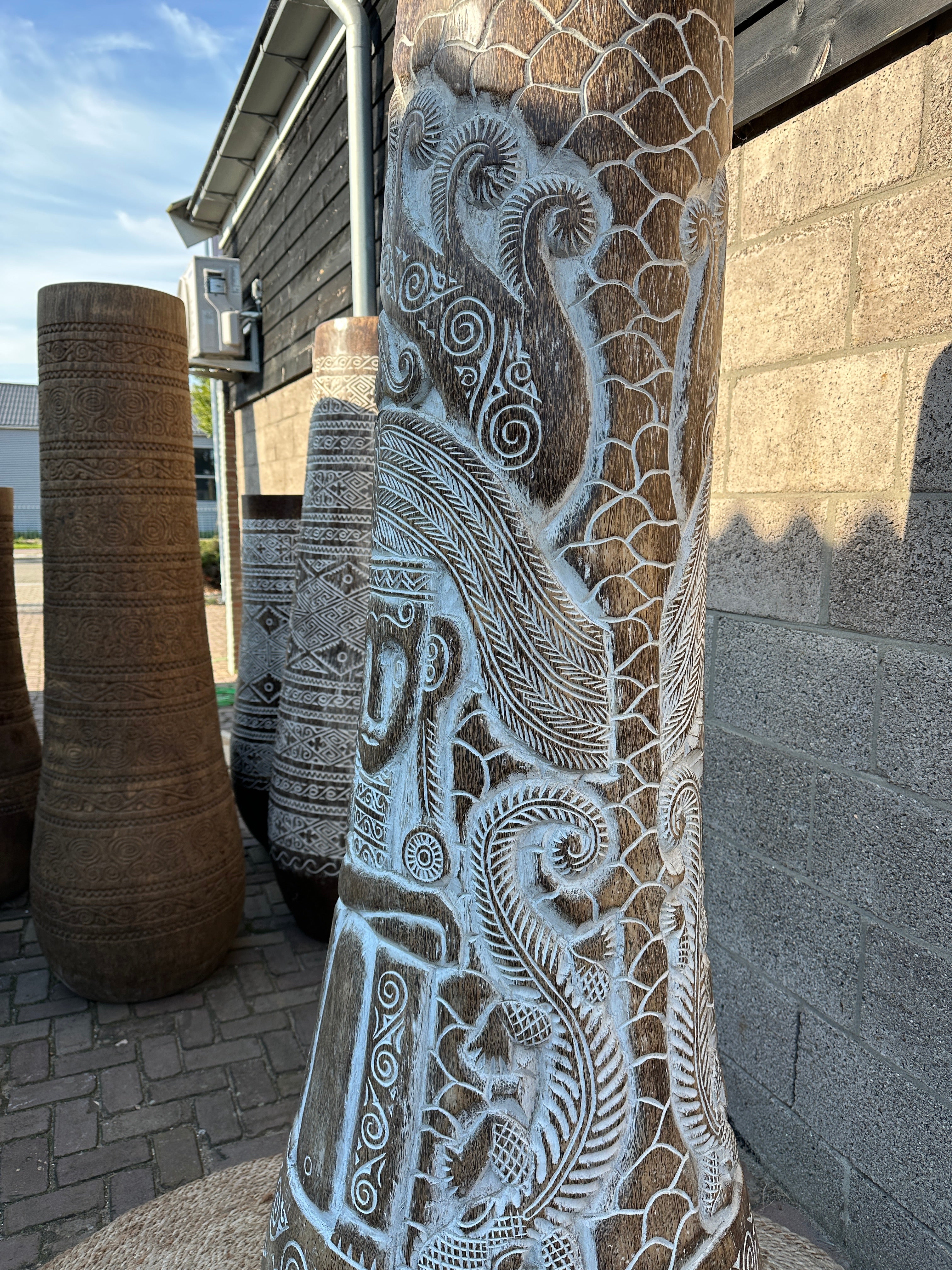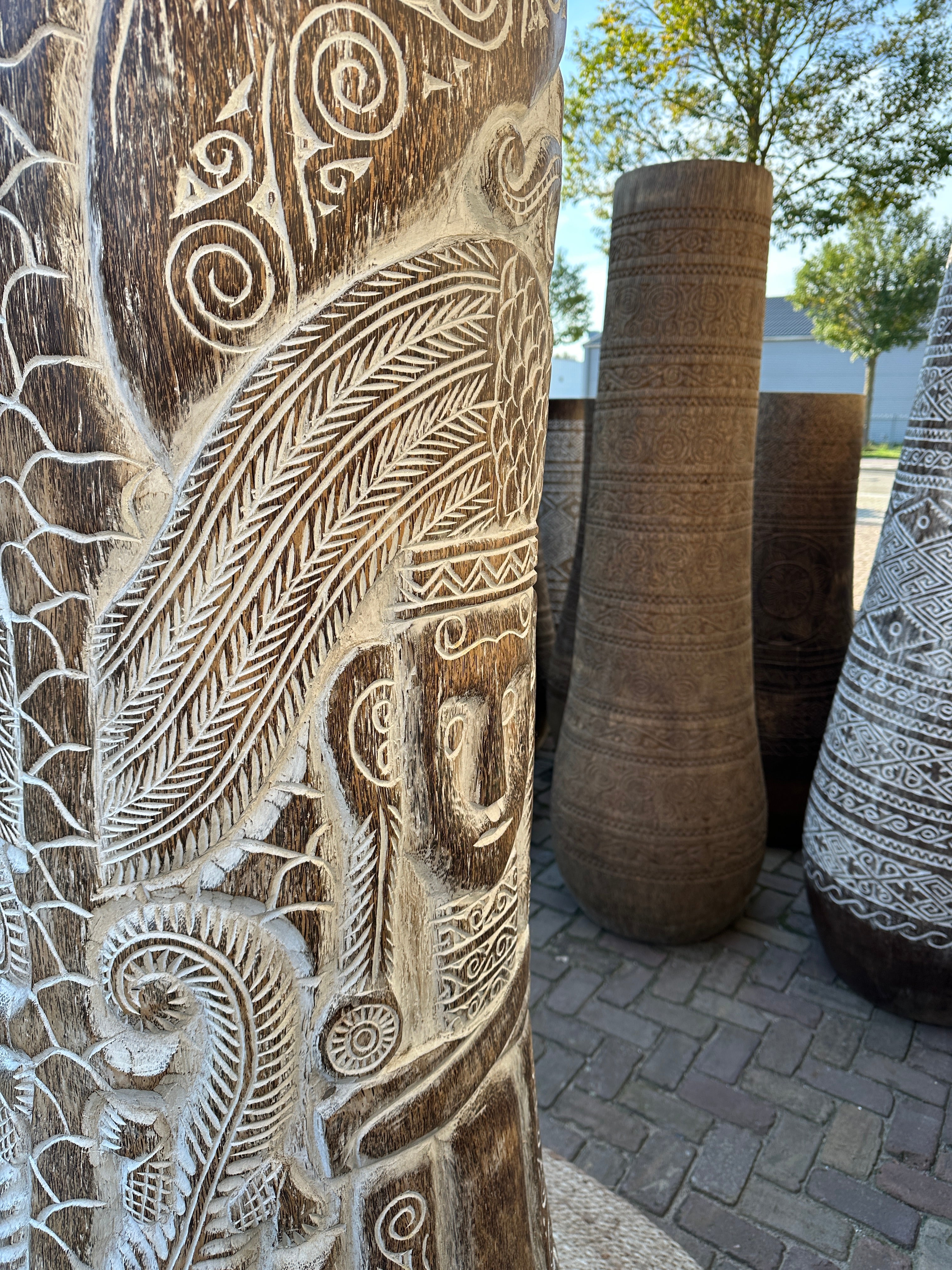 Met de hand vervaardigd uit de stam van de palmboom en voorzien van verfijnd houtsnijwerk, is dit een waar kunstwerk dat vakmanschap en exotische charme uitstraalt. Met zijn hoogte van 2 meter is het een echte blikvanger die elke ruimte tot leven brengt. De witte accenten in het reliëf benadrukken de organische patronen van het hout en geven de vaas een stijlvolle, doorleefde uitstraling.