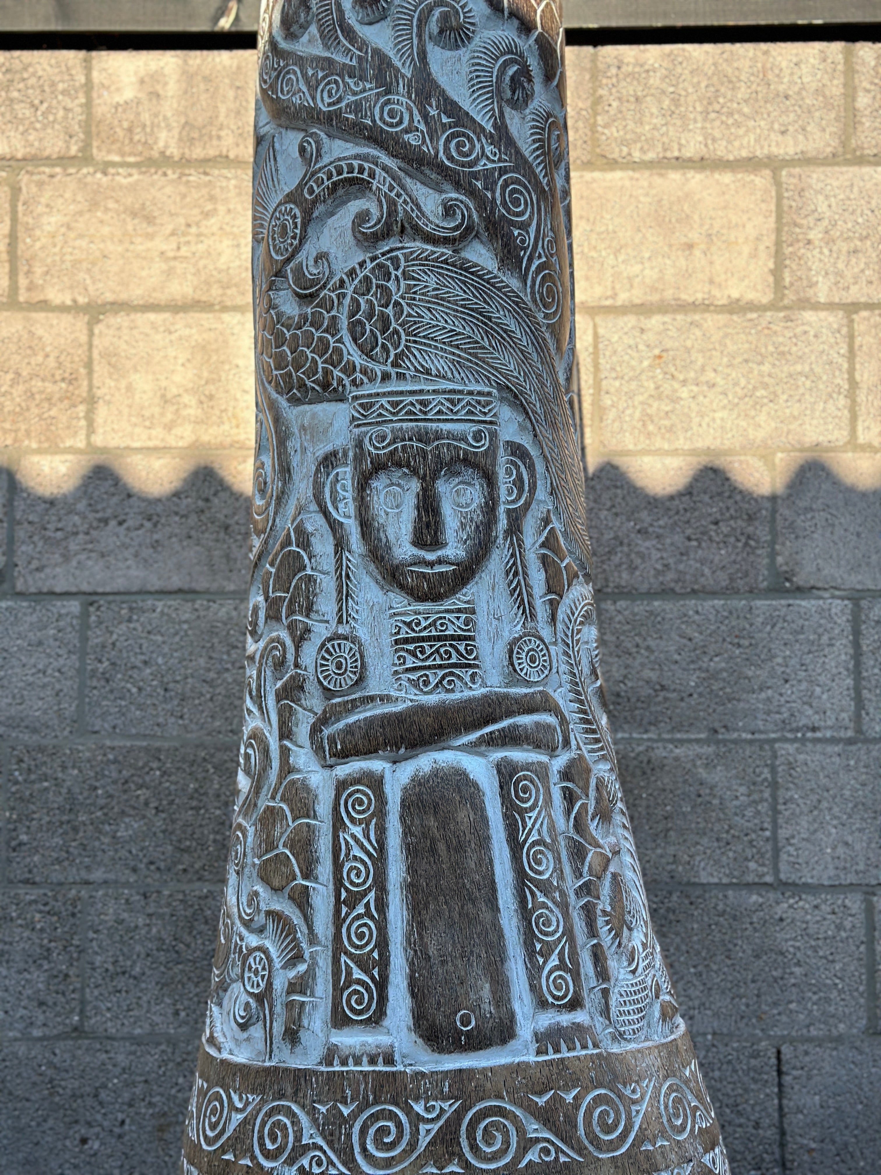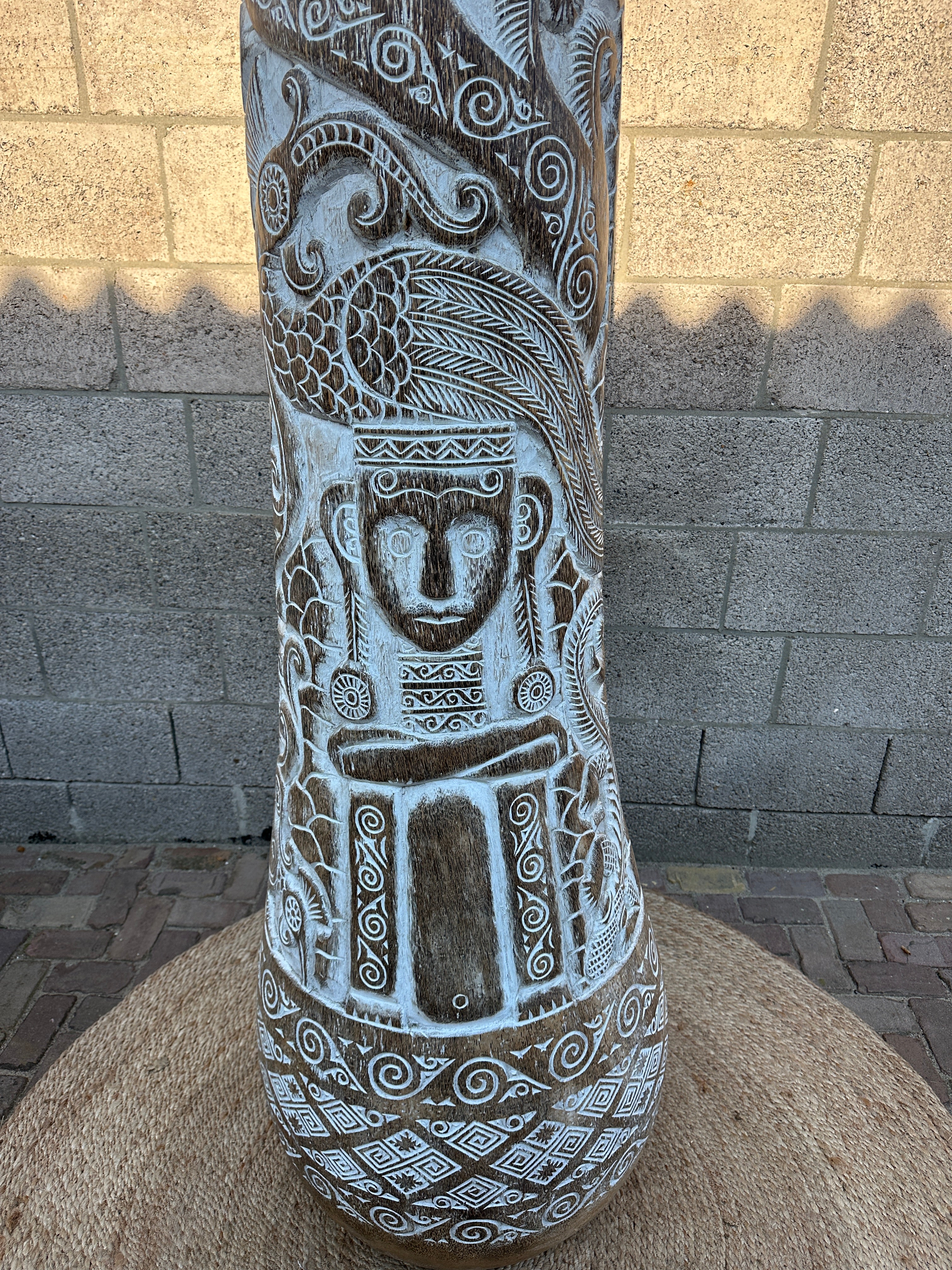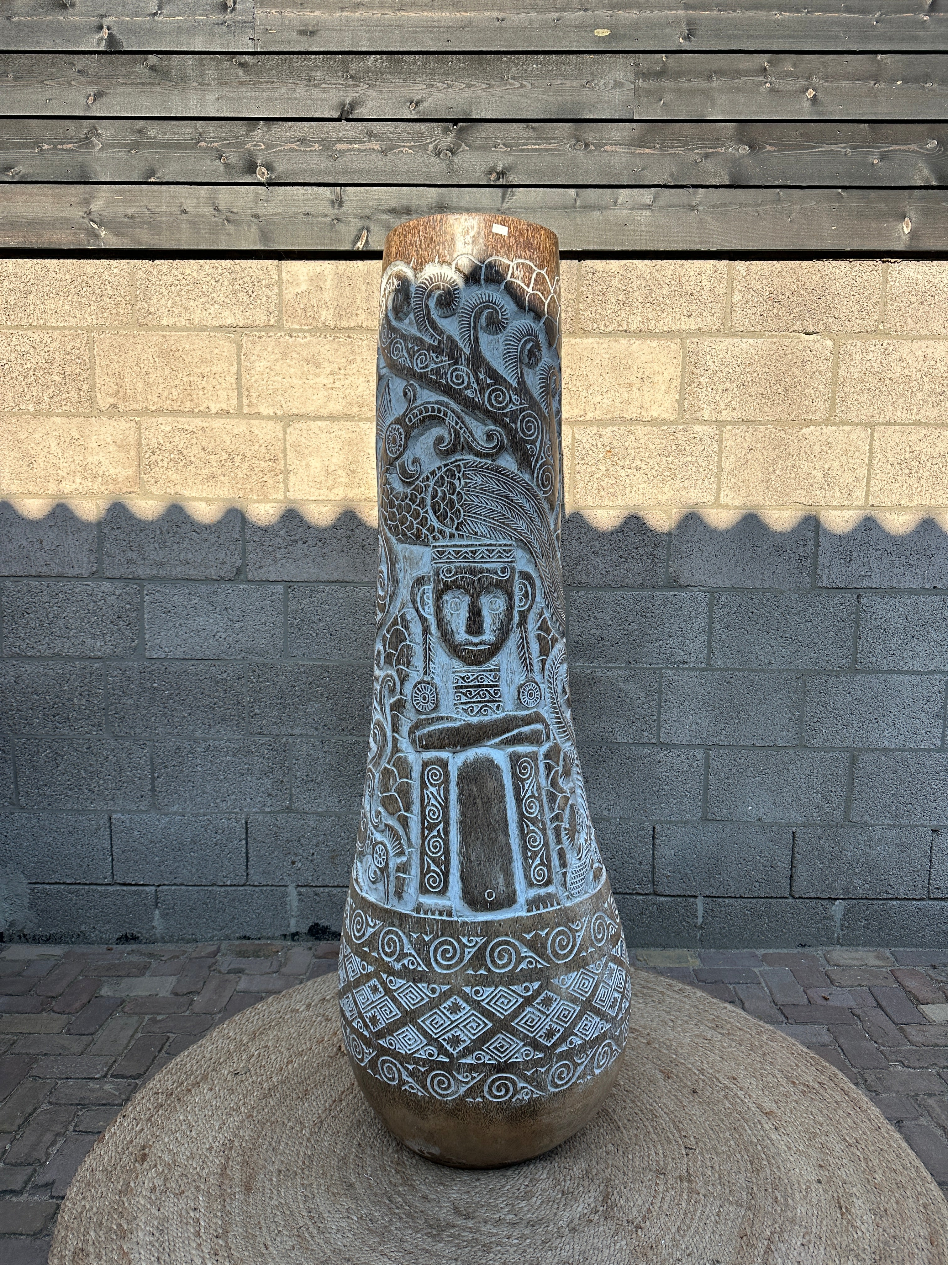 Met de hand vervaardigd uit de stam van de palmboom en voorzien van verfijnd houtsnijwerk, is dit een waar kunstwerk dat vakmanschap en exotische charme uitstraalt. Met zijn hoogte van 2 meter is het een echte blikvanger die elke ruimte tot leven brengt. De witte accenten in het reliëf benadrukken de organische patronen van het hout en geven de vaas een stijlvolle, doorleefde uitstraling.