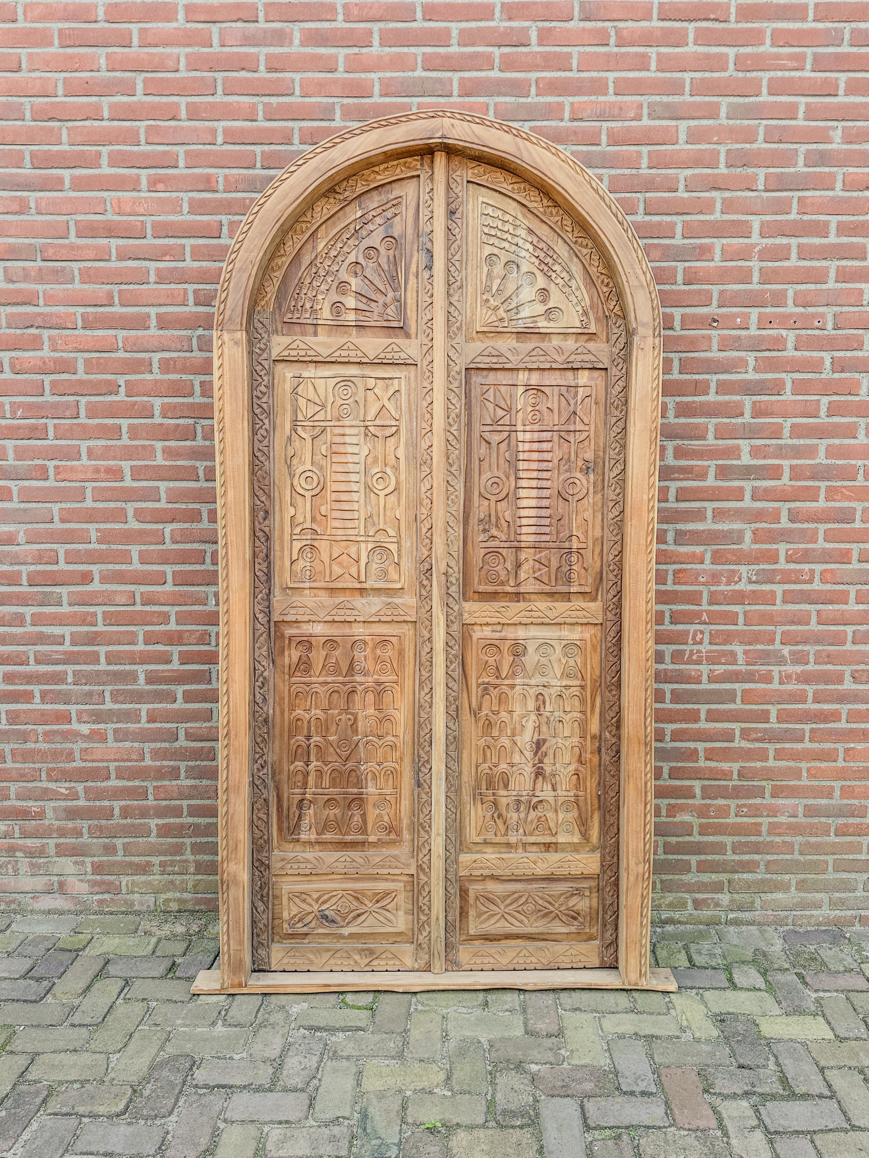 Deze elegante Indonesische teak houten boogdeuren zijn een waar kunstwerk van vakmanschap. Met de hand gesneden uit massief teak hout, stralen de deuren authenticiteit, warmte en exotische charme uit. Het bijzondere boogontwerp maakt deze dubbele deuren extra karaktervol en uniek, waardoor ze een echte blikvanger zijn in huis of tuin.