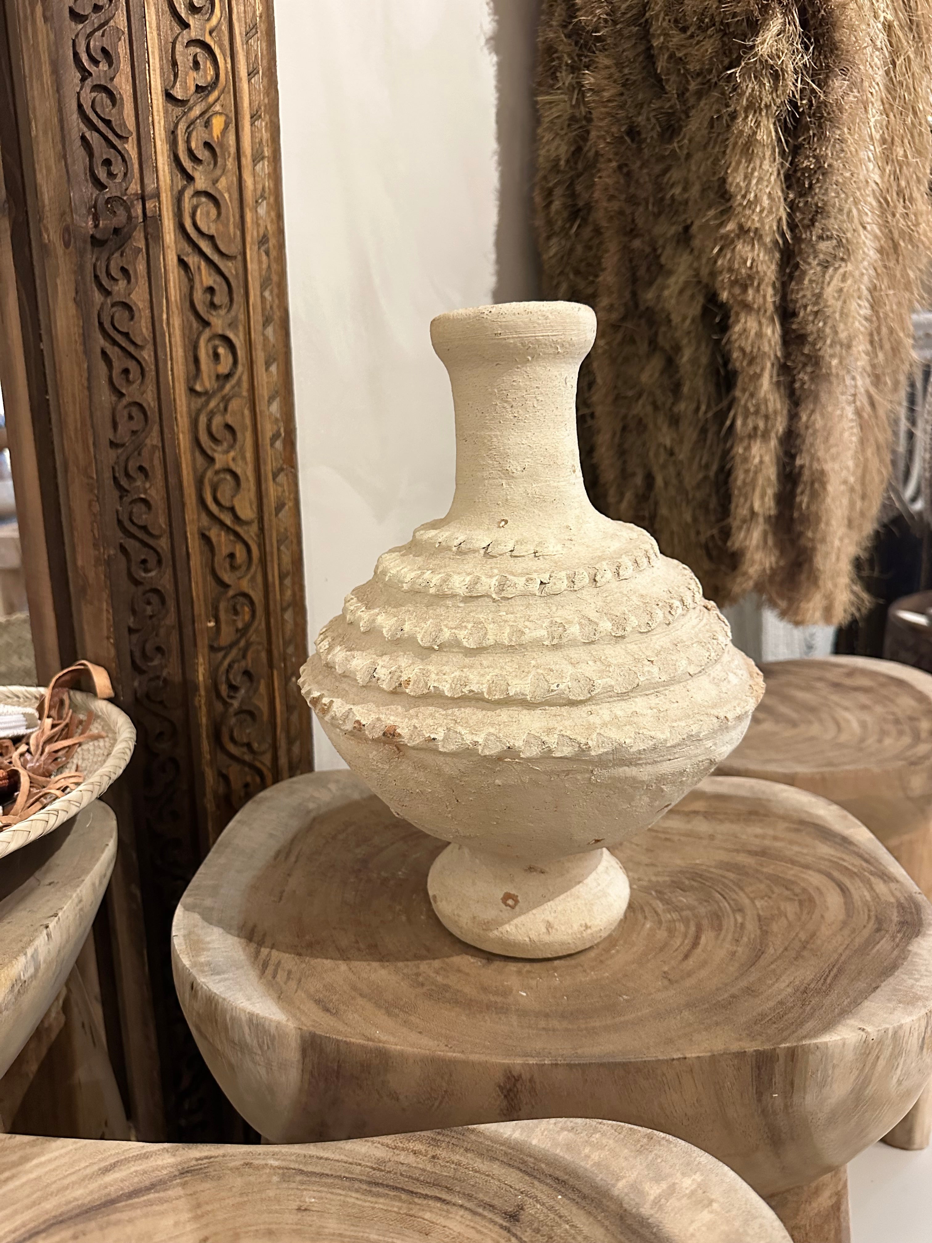 De warme terra en naturel gemêleerde tinten geven de vaas een natuurlijke, doorleefde uitstraling die moeiteloos past in zowel een modern als een bohemien interieur. Dankzij het ambachtelijke proces is geen enkel exemplaar hetzelfde, kleine verschillen in vorm, kleur en afmeting maken juist de charme en authenticiteit van dit bijzondere stuk uit.