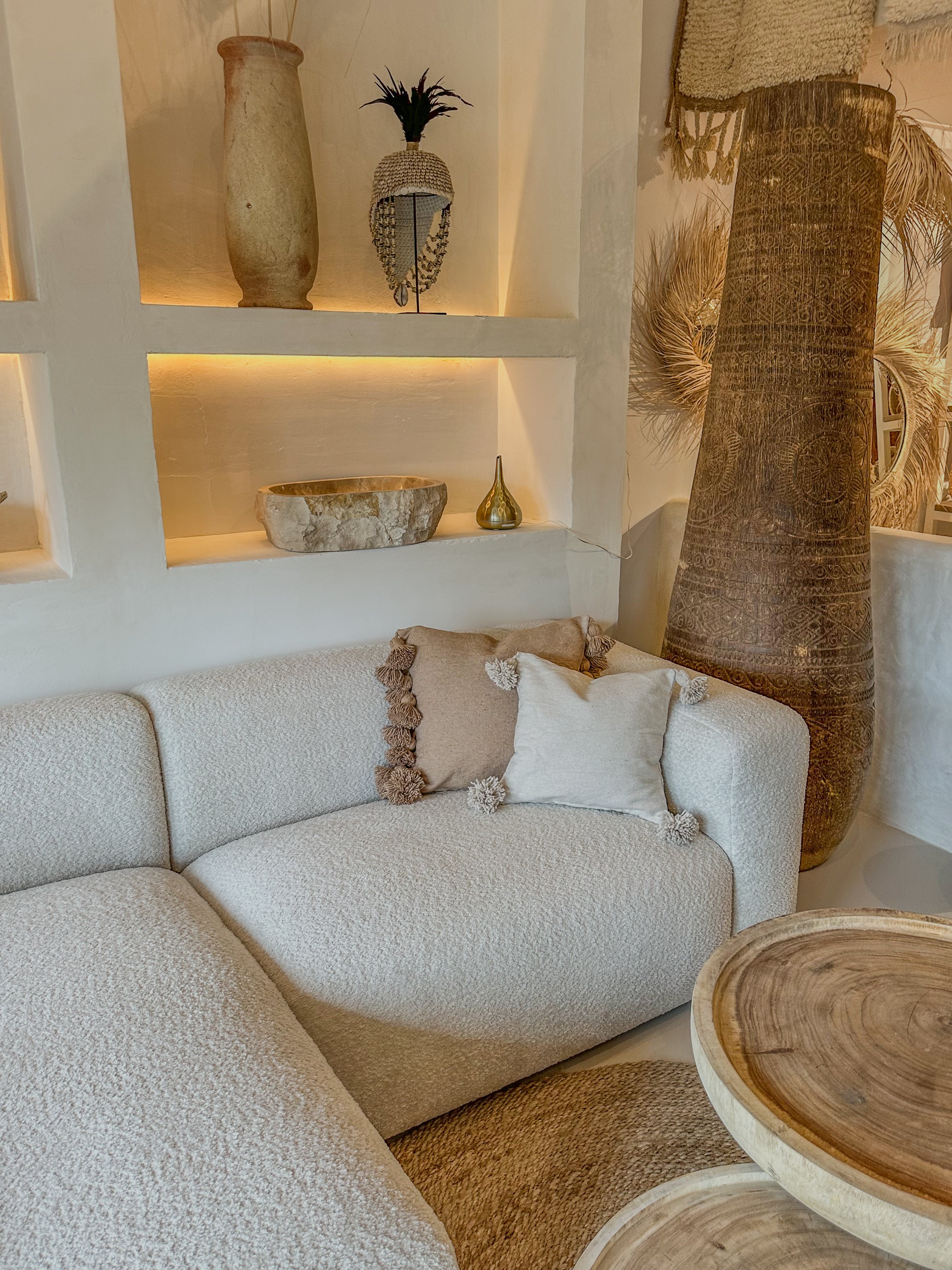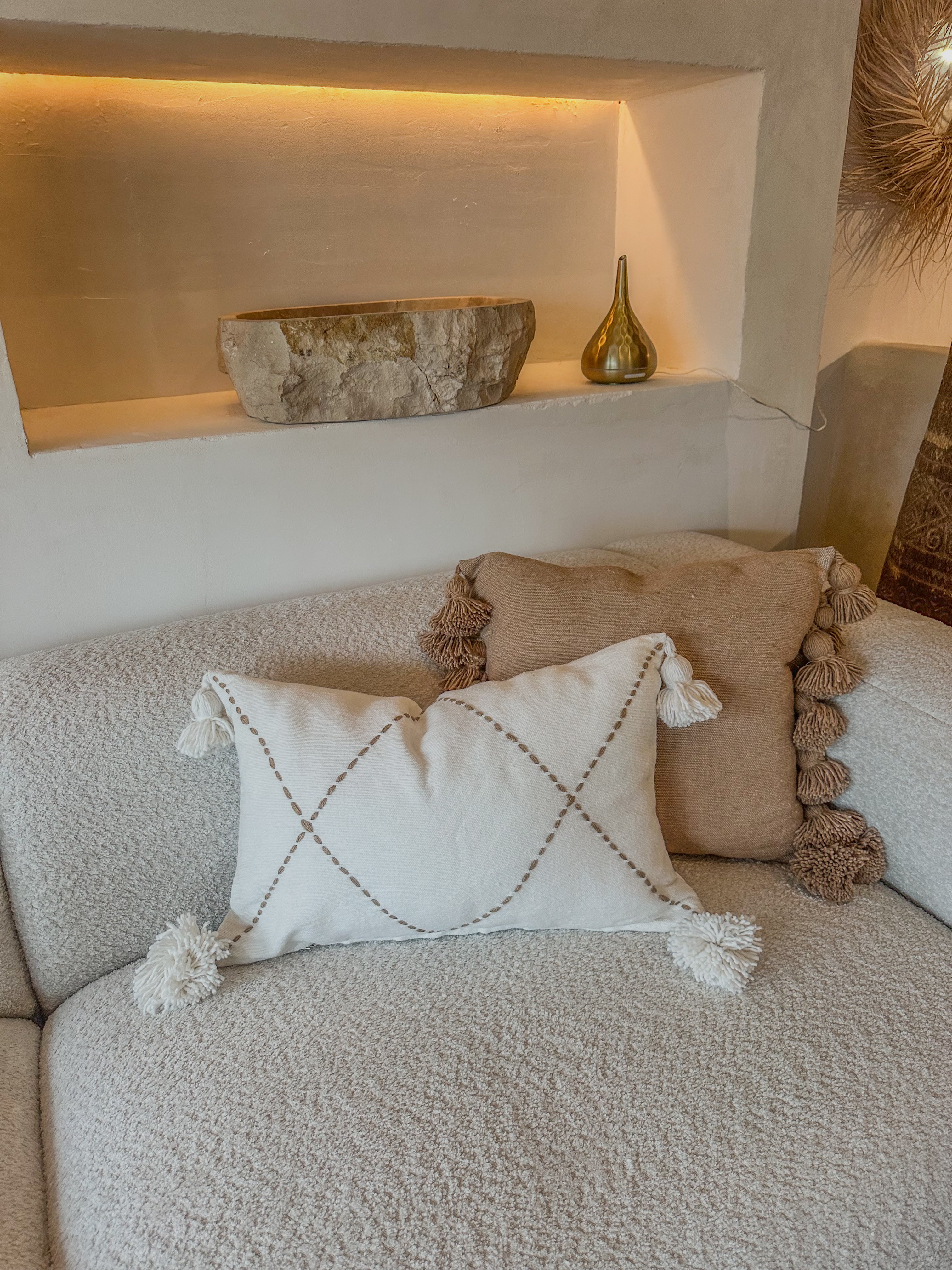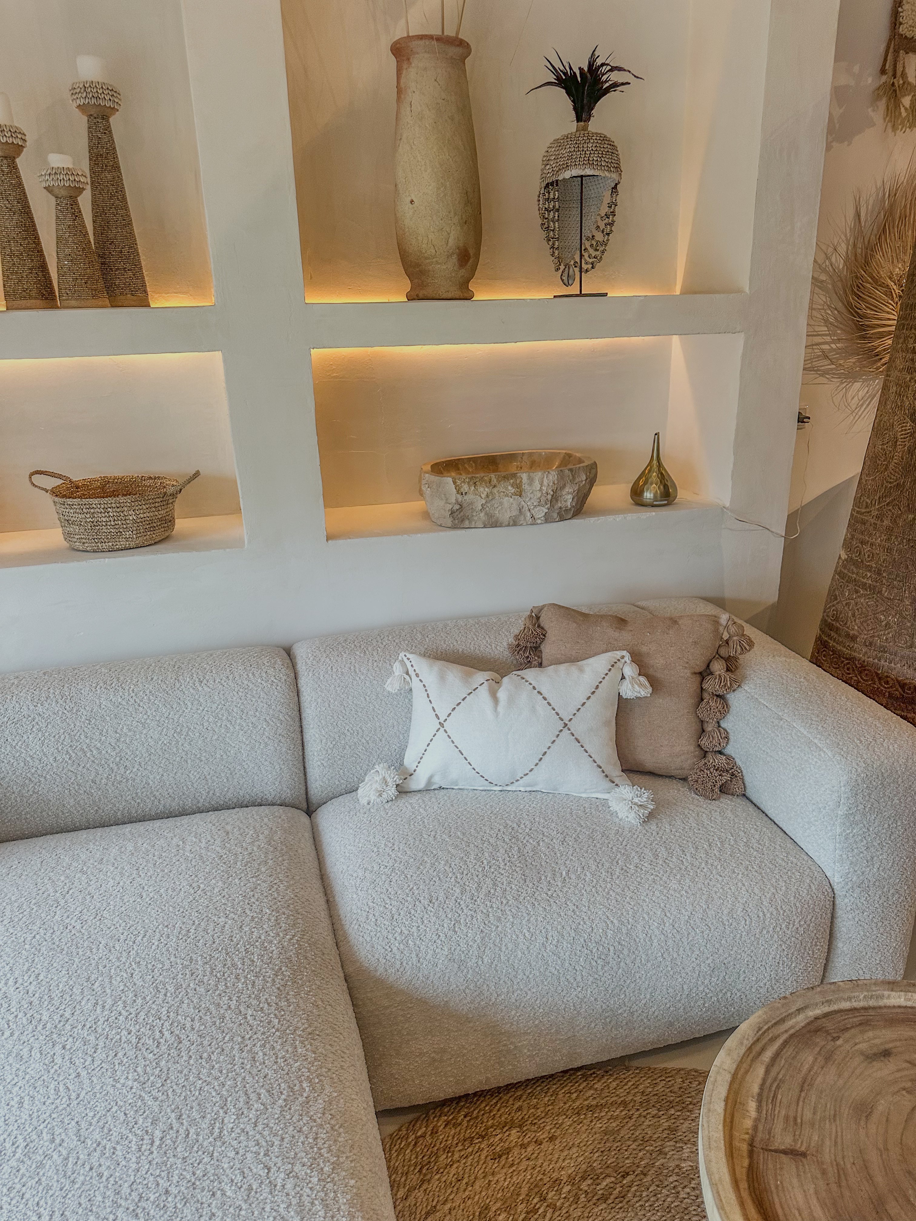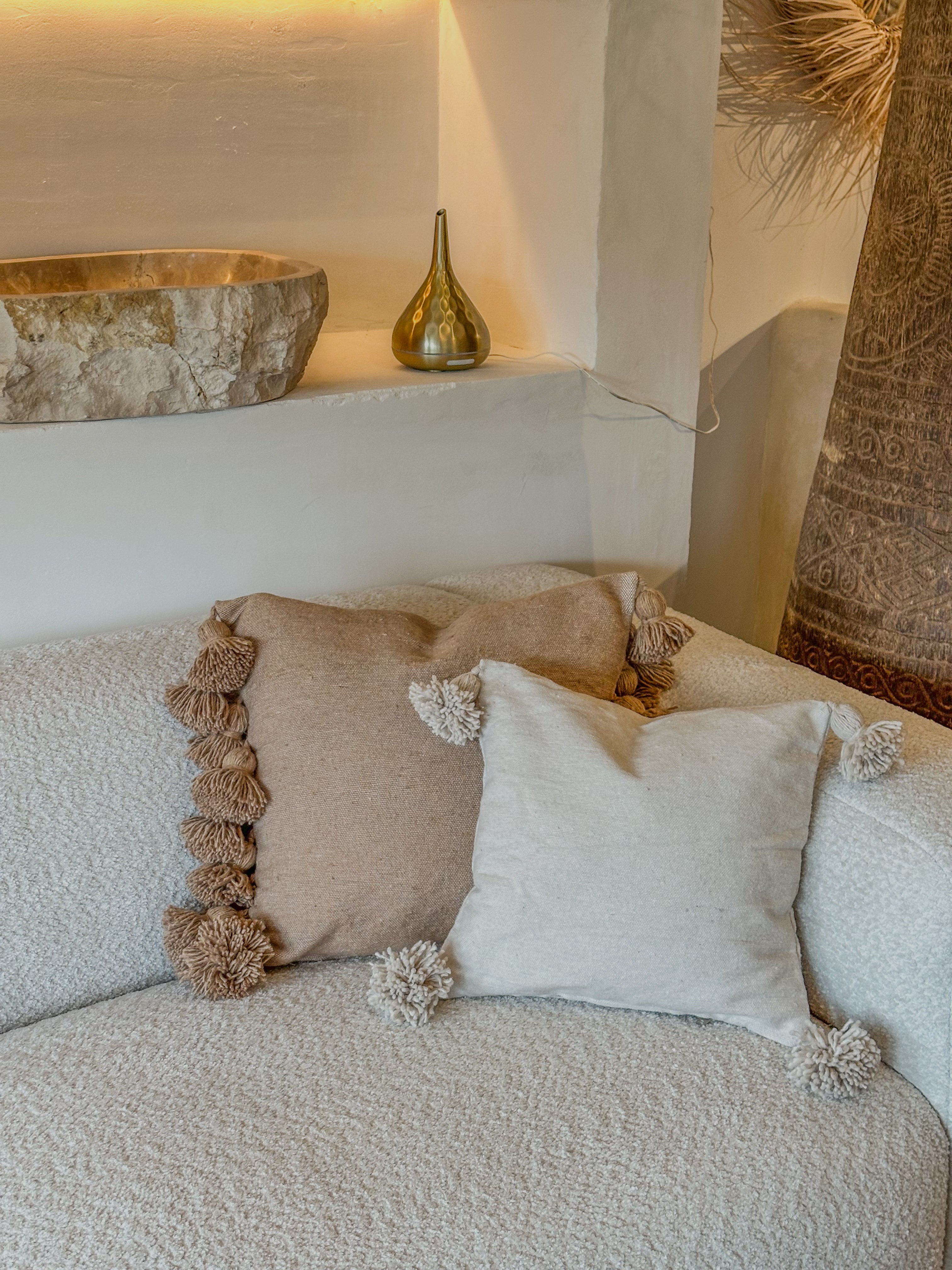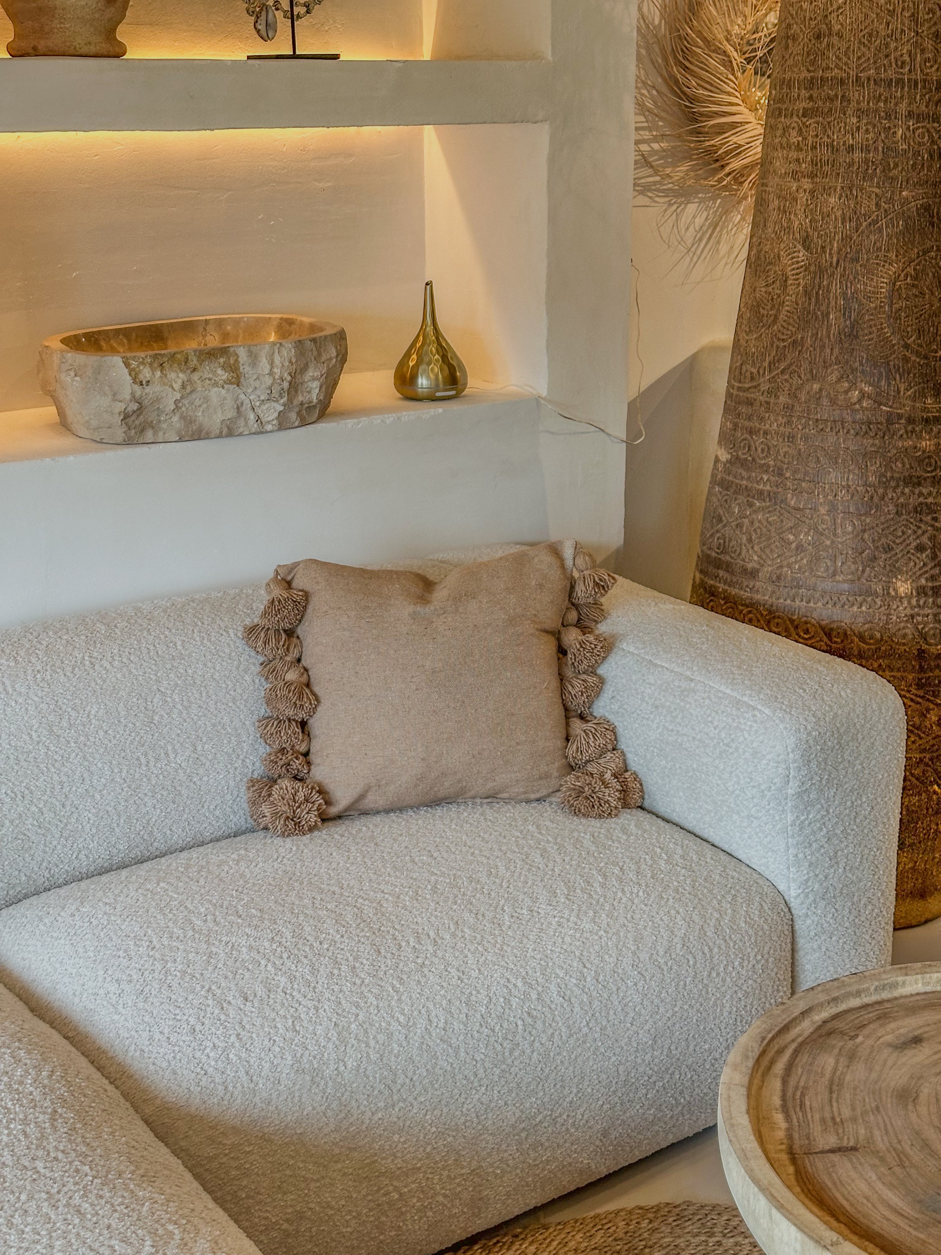 De kussenhoes is afgewerkt met speelse pompons aan beide zijkanten, wat zorgt voor een subtiel boho-accent en een gezellige uitstraling. De natuurlijke tint combineert moeiteloos met diverse woonstijlen van minimalistisch tot mediterraans of boho chic. Perfect voor op de bank, fauteuil of bed.