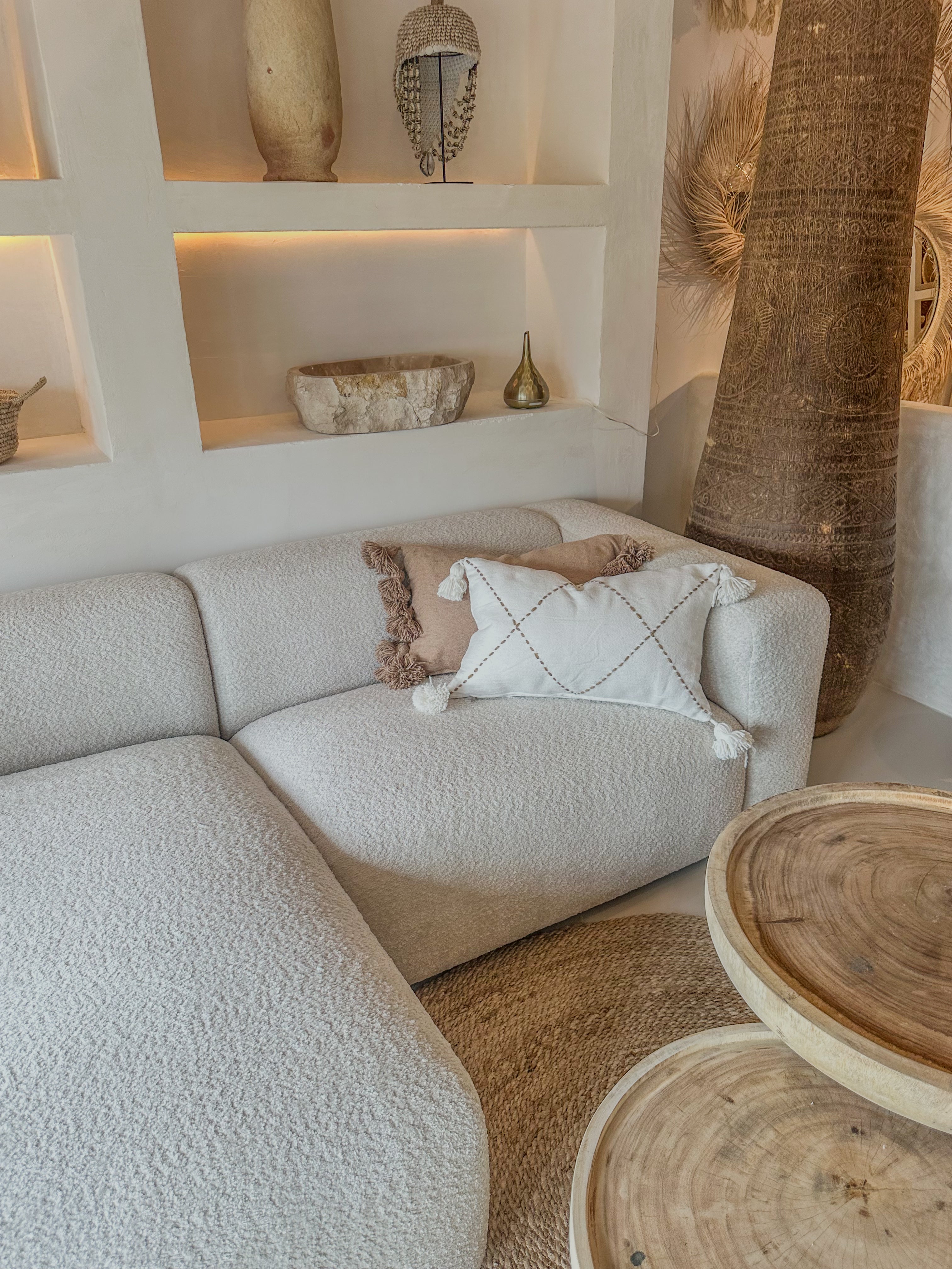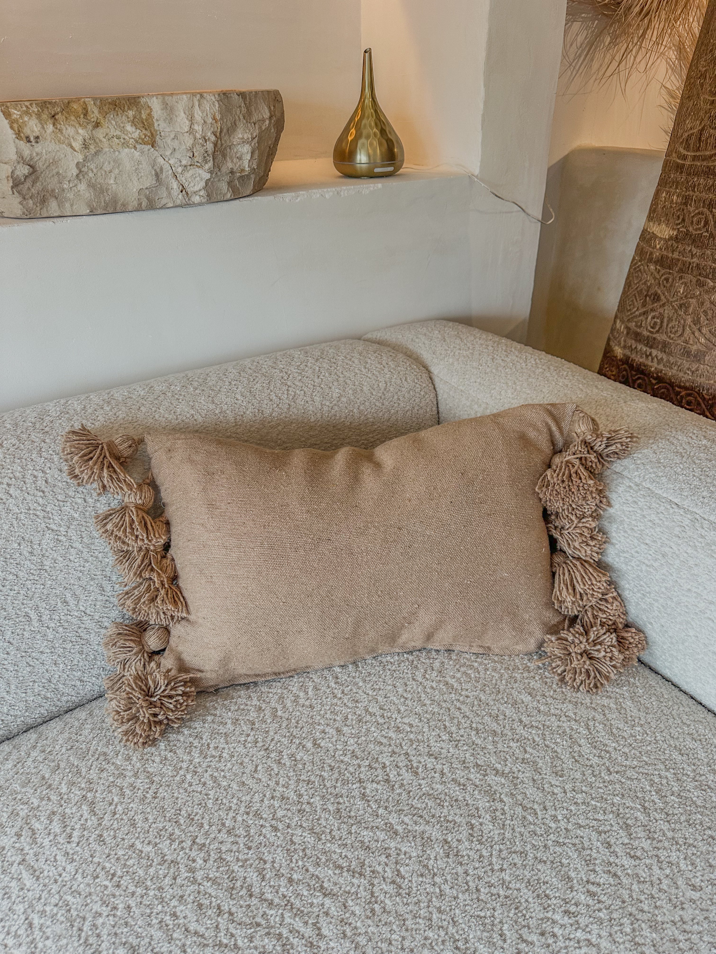 De kussenhoes is afgewerkt met speelse pompons aan beide zijkanten, wat zorgt voor een subtiel boho-accent en een gezellige uitstraling. De natuurlijke tint combineert moeiteloos met diverse woonstijlen van minimalistisch tot mediterraans of boho chic. Perfect voor op de bank, fauteuil of bed.