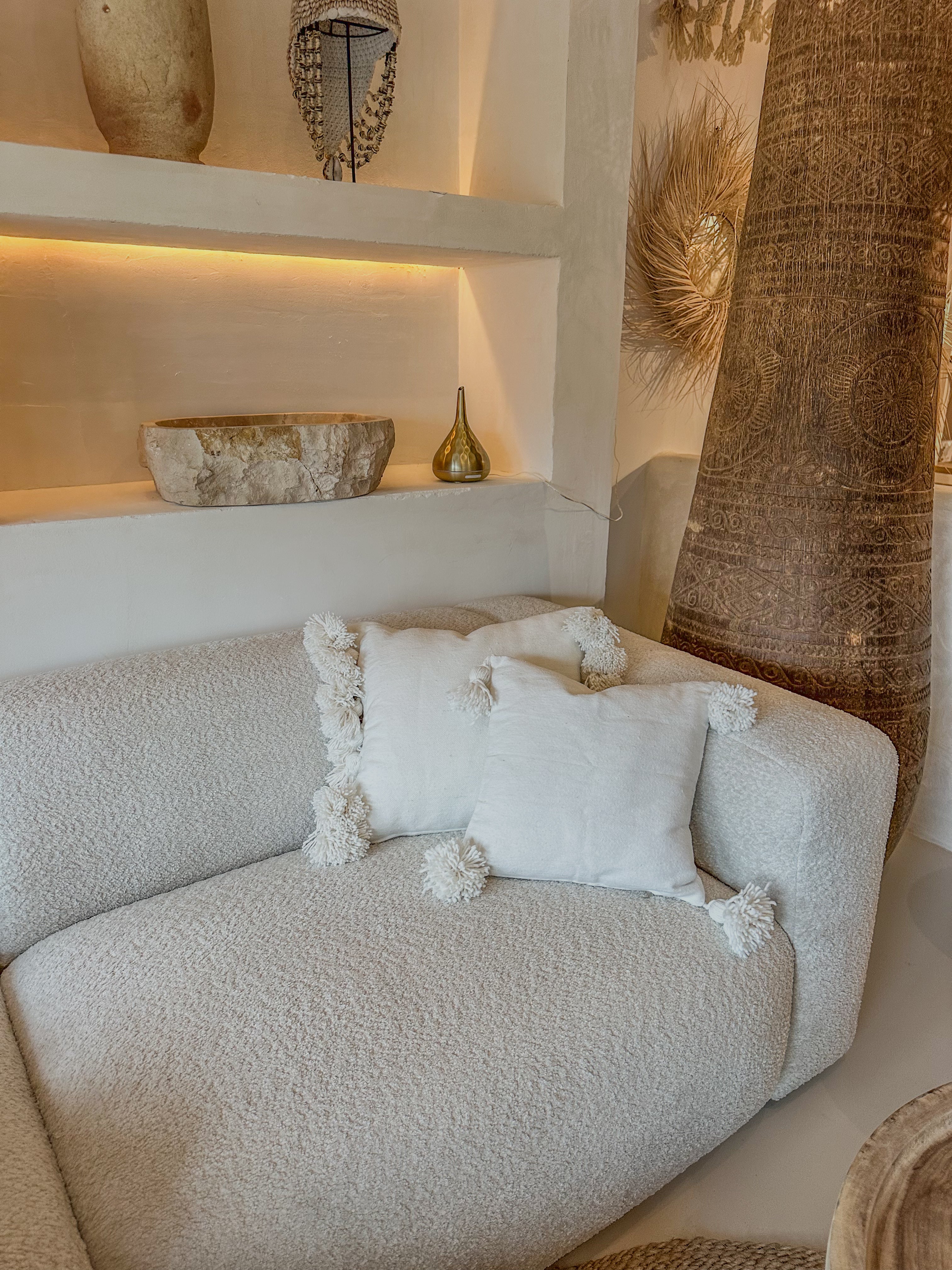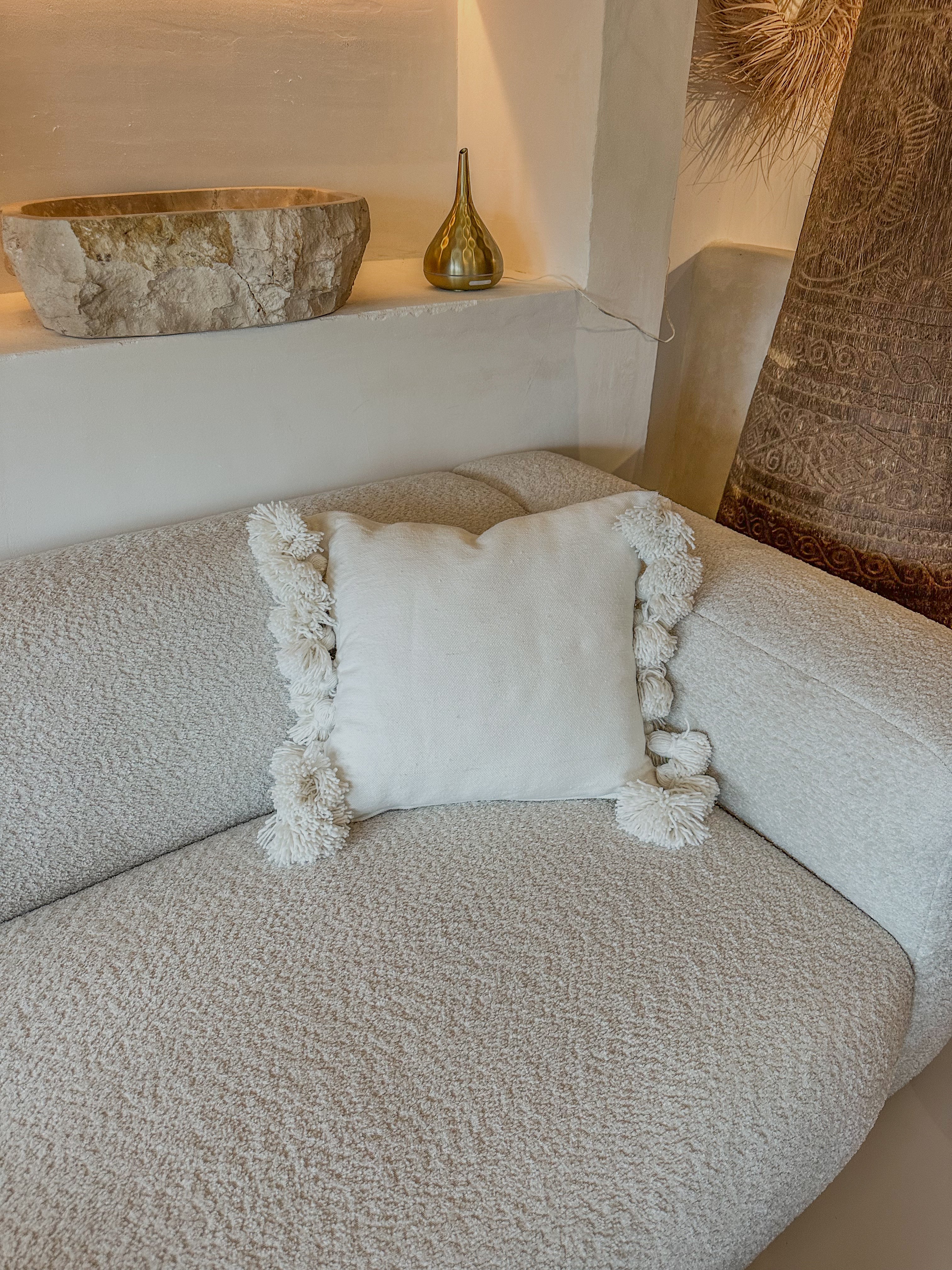 De kussenhoes is afgewerkt met speelse pompons aan beide zijkanten, wat zorgt voor een subtiel boho-accent en een gezellige uitstraling. De natuurlijke tint combineert moeiteloos met diverse woonstijlen van minimalistisch tot mediterraans of boho chic. Perfect voor op de bank, fauteuil of bed.