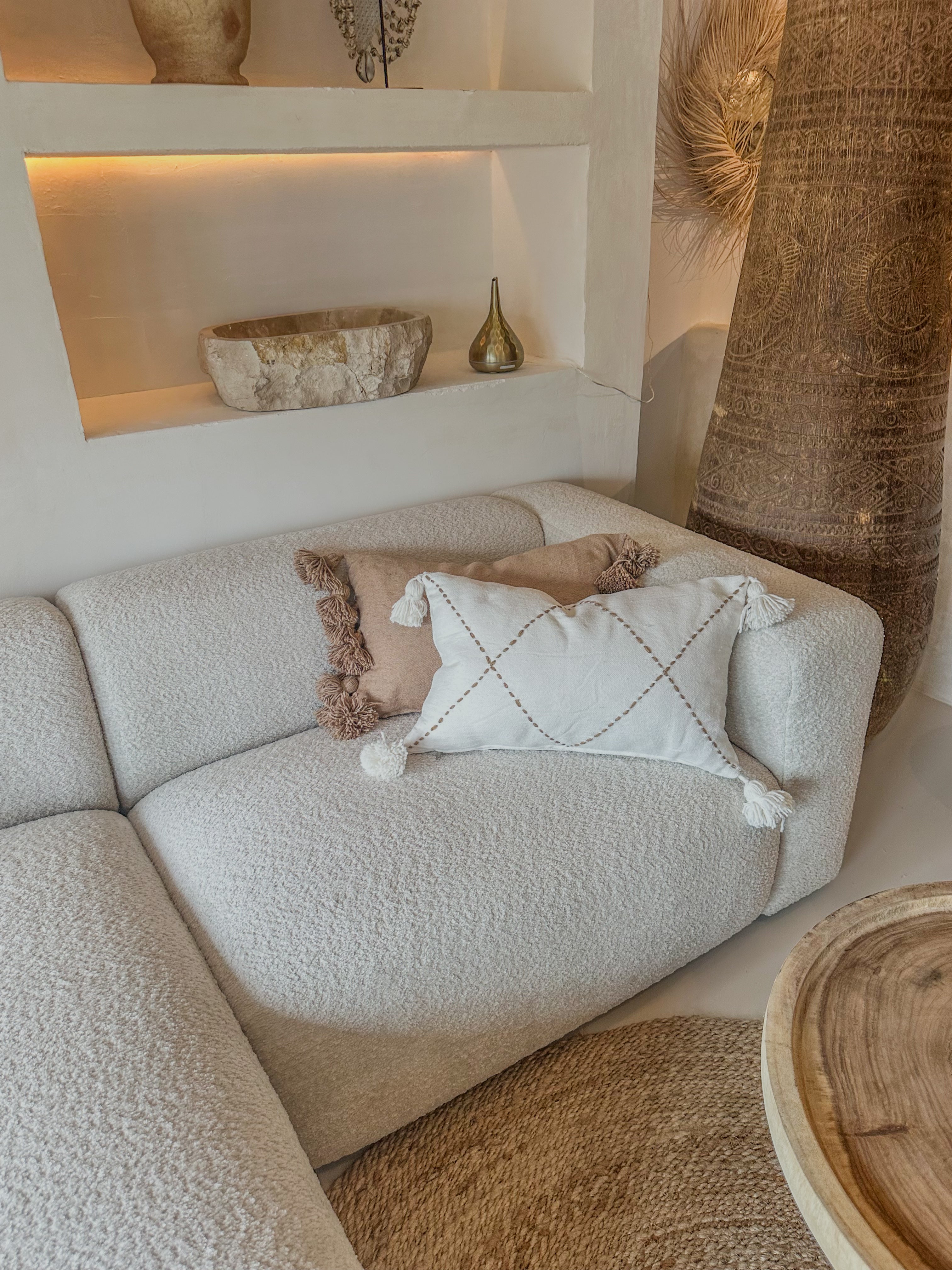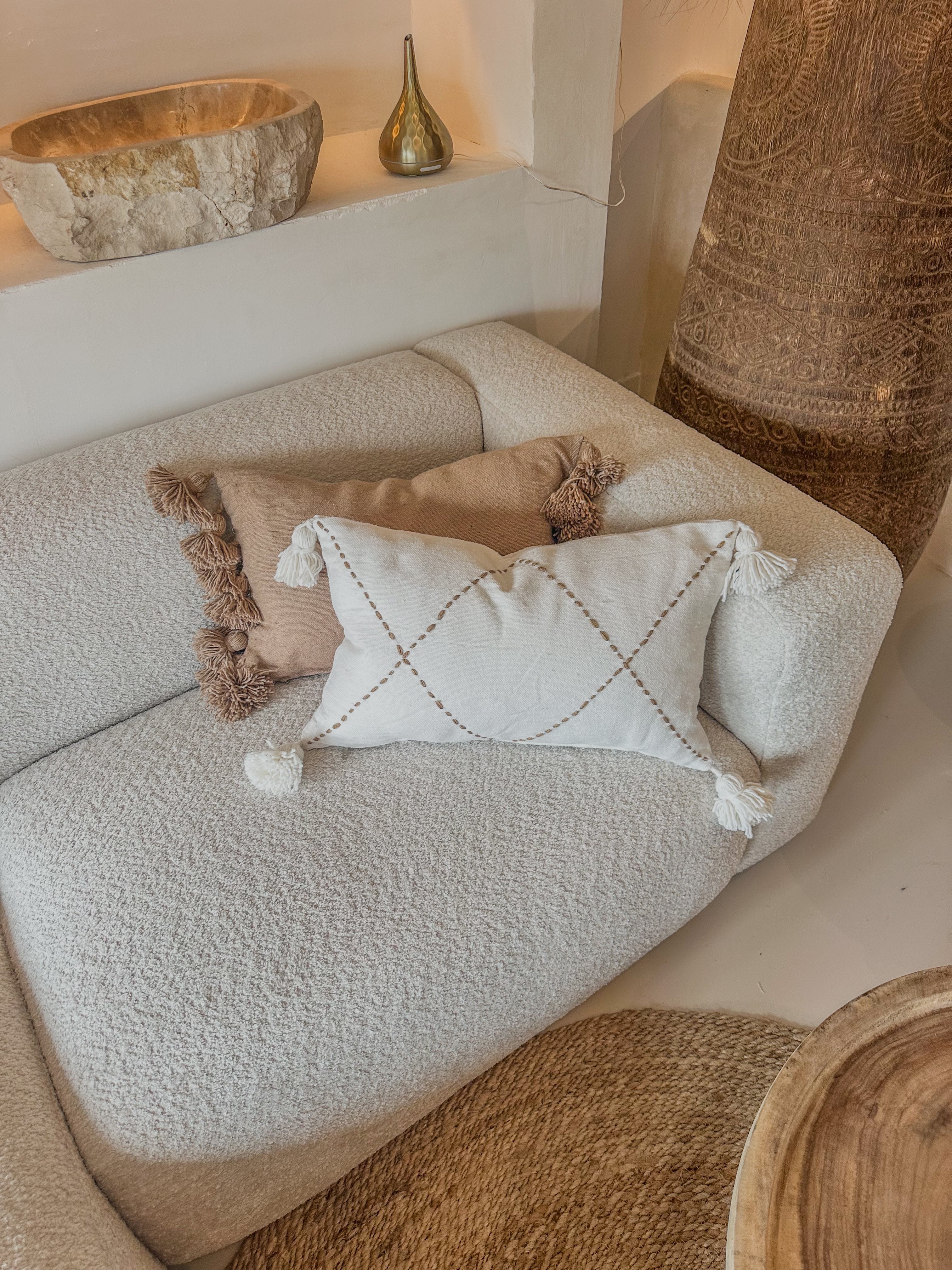 De kussenhoes is afgewerkt met speelse pompons op de hoeken, wat zorgt voor een subtiel boho-accent en een gezellige uitstraling. De natuurlijke tint combineert moeiteloos met diverse woonstijlen van minimalistisch tot mediterraans of boho chic. Perfect voor op de bank, fauteuil of bed.