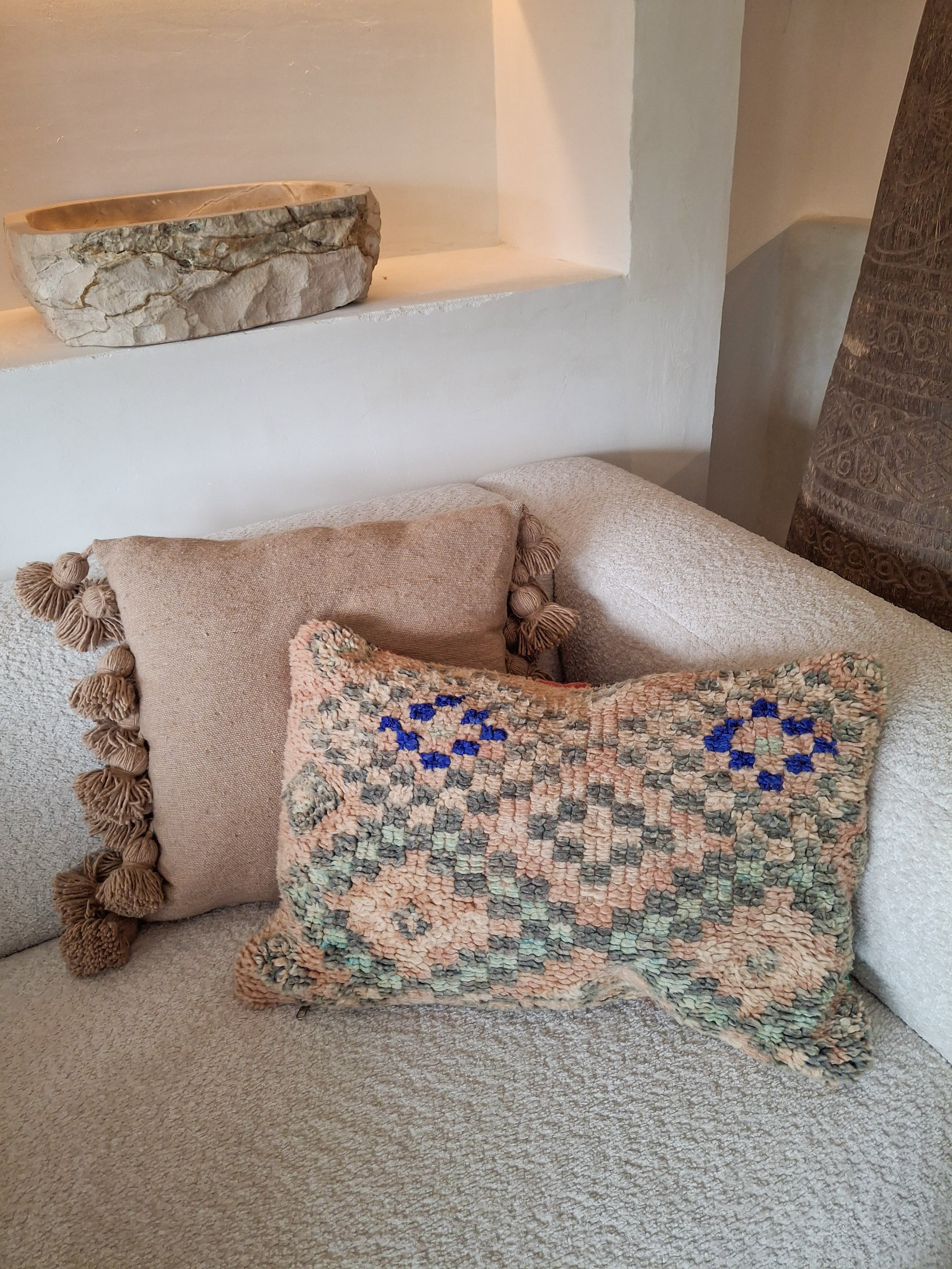 Ontdek de charme van authentiek vakmanschap met onze unieke kussenhoezen, met de hand gemaakt in Marokko. Elke hoes is een op zichzelf staand kunstwerk, met zorg vervaardigd door lokale ambachtslieden. Geen enkel exemplaar is hetzelfde subtiele variaties in kleur, patroon en textuur maken jouw kussen écht bijzonder.