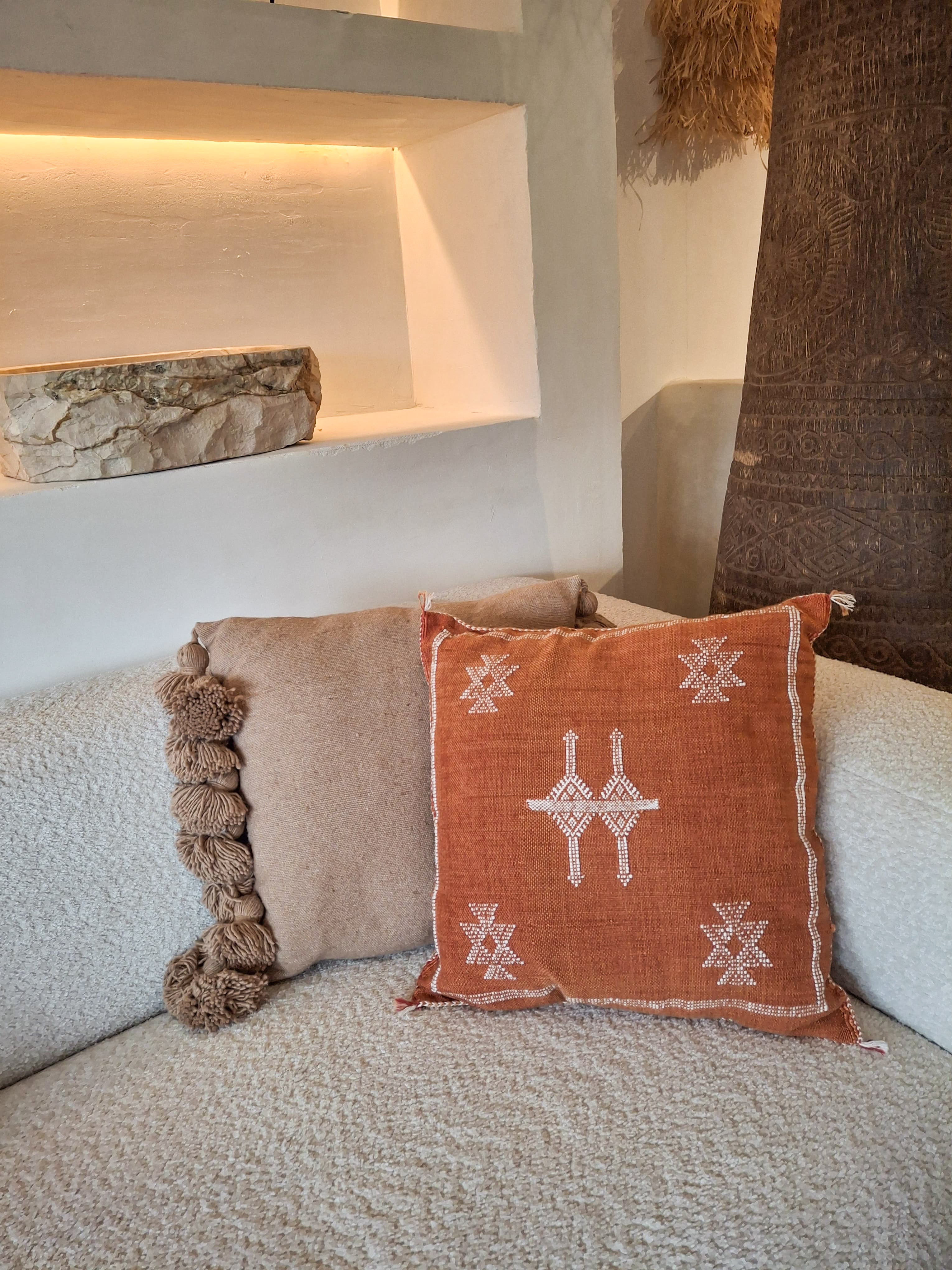 Ontdek de charme van authentiek vakmanschap met onze unieke kussenhoezen, met de hand gemaakt in Marokko. Elke hoes is een op zichzelf staand kunstwerk, met zorg vervaardigd door lokale ambachtslieden. Geen enkel exemplaar is hetzelfde subtiele variaties in kleur, patroon en textuur maken jouw kussen écht bijzonder.