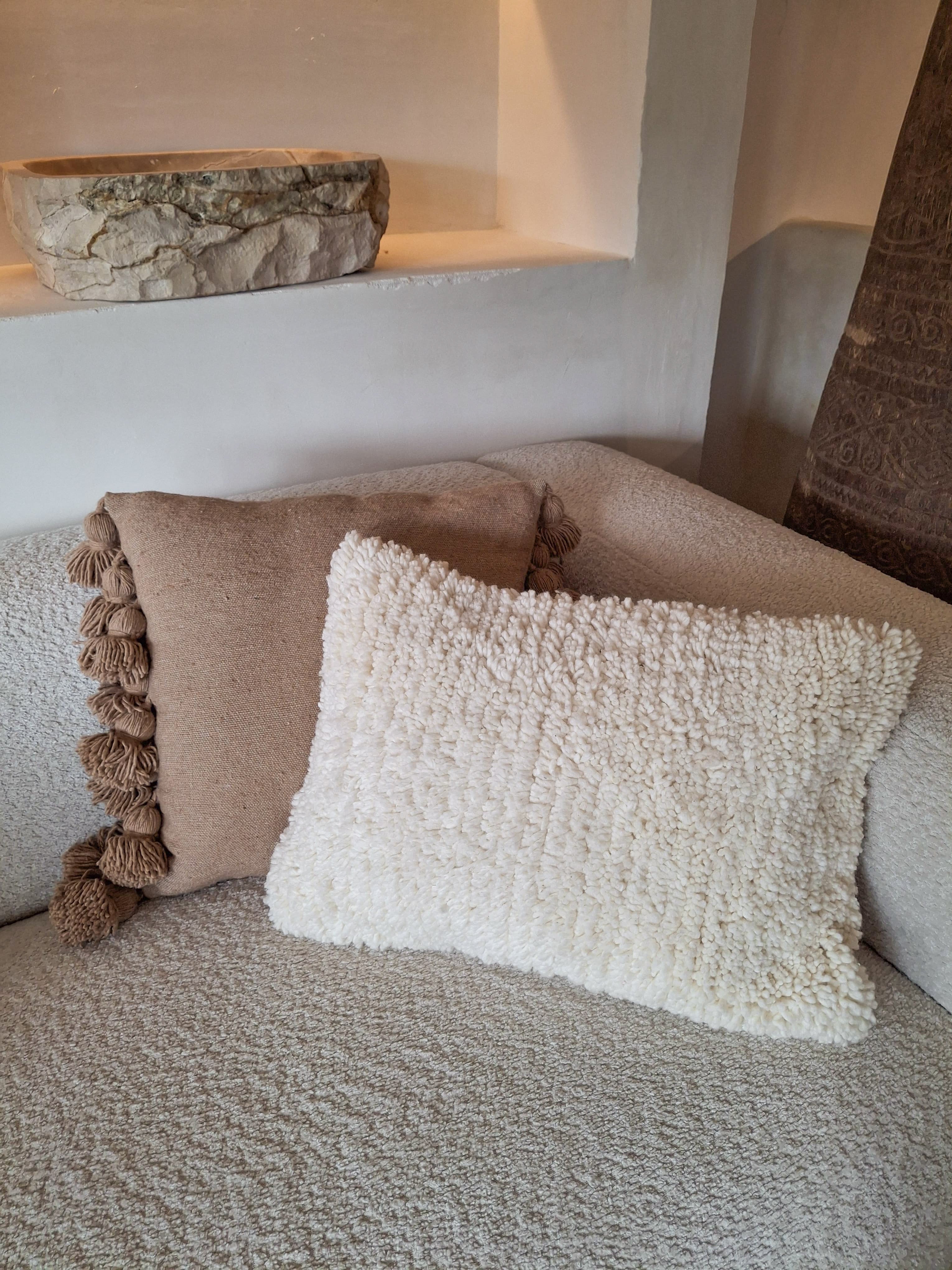 De natuurlijke crème tint en de rijke textuur maken dit kussen een stijlvolle aanvulling op elk interieur van modern tot bohemian of landelijk chic. Perfect voor op de bank, fauteuil of het bed.