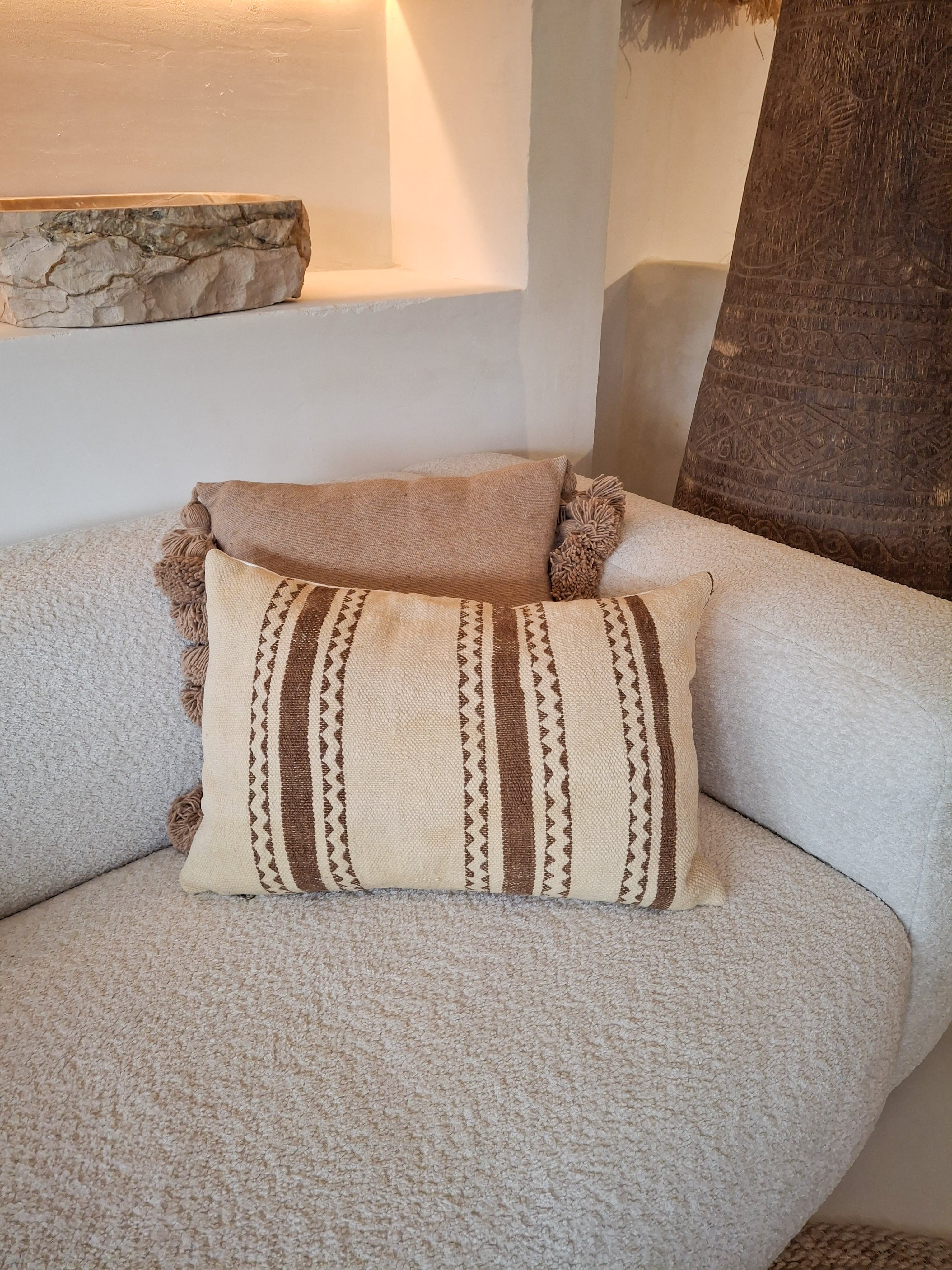 Ontdek de charme van authentiek vakmanschap met onze unieke kussenhoezen, met de hand gemaakt in Marokko. Elke hoes is een op zichzelf staand kunstwerk, met zorg vervaardigd door lokale ambachtslieden. Geen enkel exemplaar is hetzelfde subtiele variaties in kleur, patroon en textuur maken jouw kussen écht bijzonder.