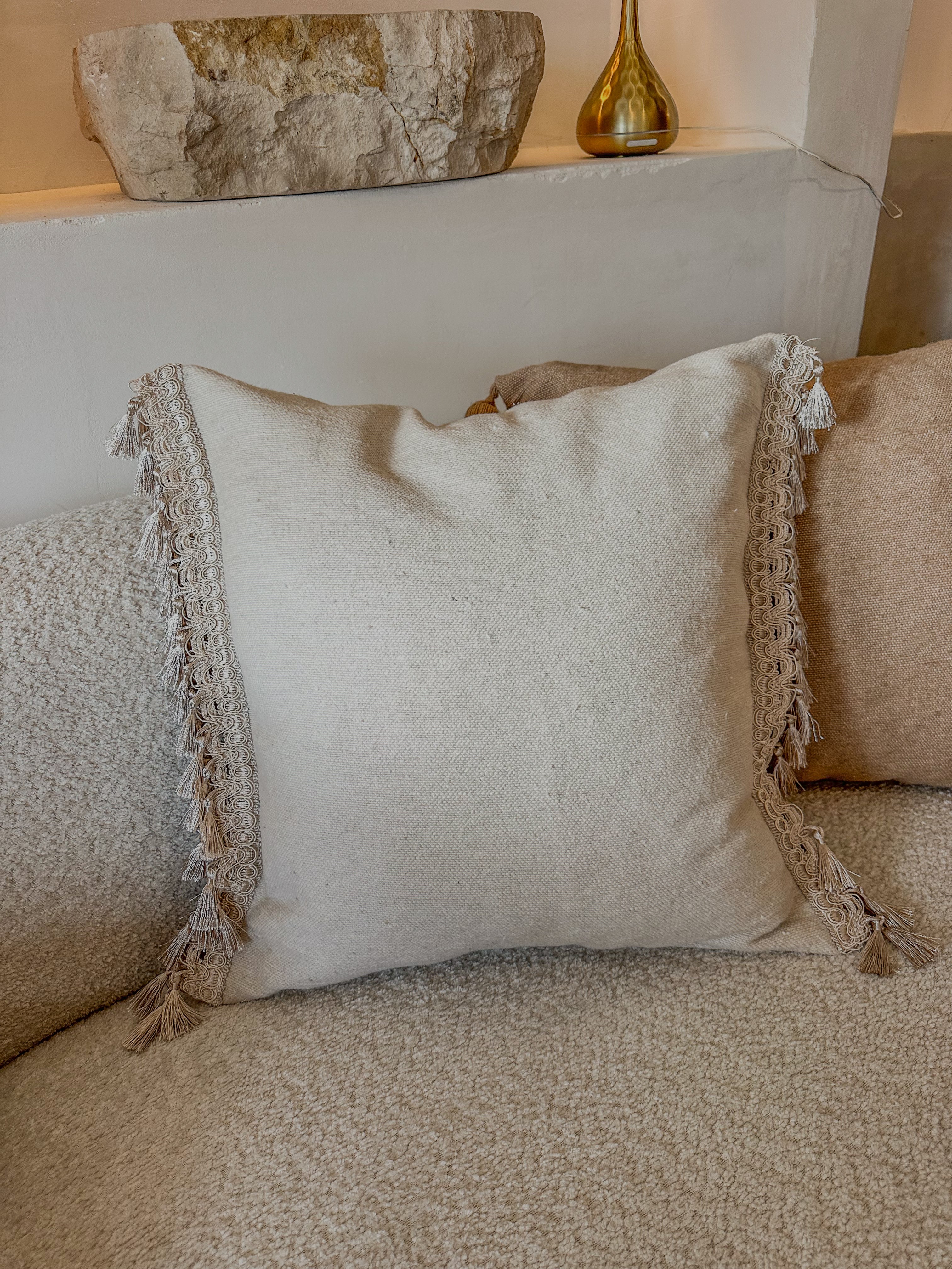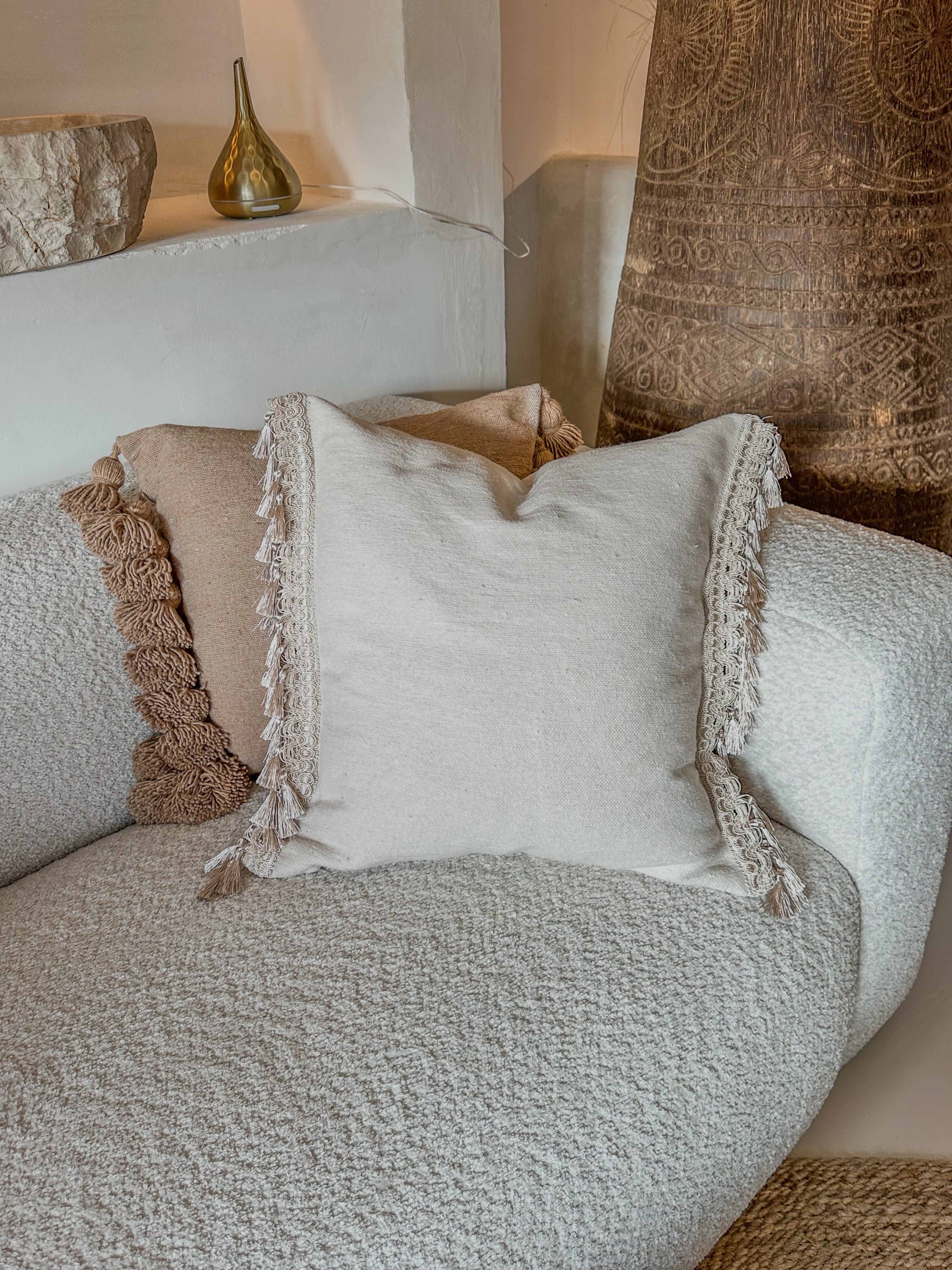 Korte webshopomschrijving: Katoenen kussenhoes (50×50 cm) met champagnekleurige, vastgeborduurde franjes aan de zijkanten. Neutrale, elegante toevoeging aan elk interieur.