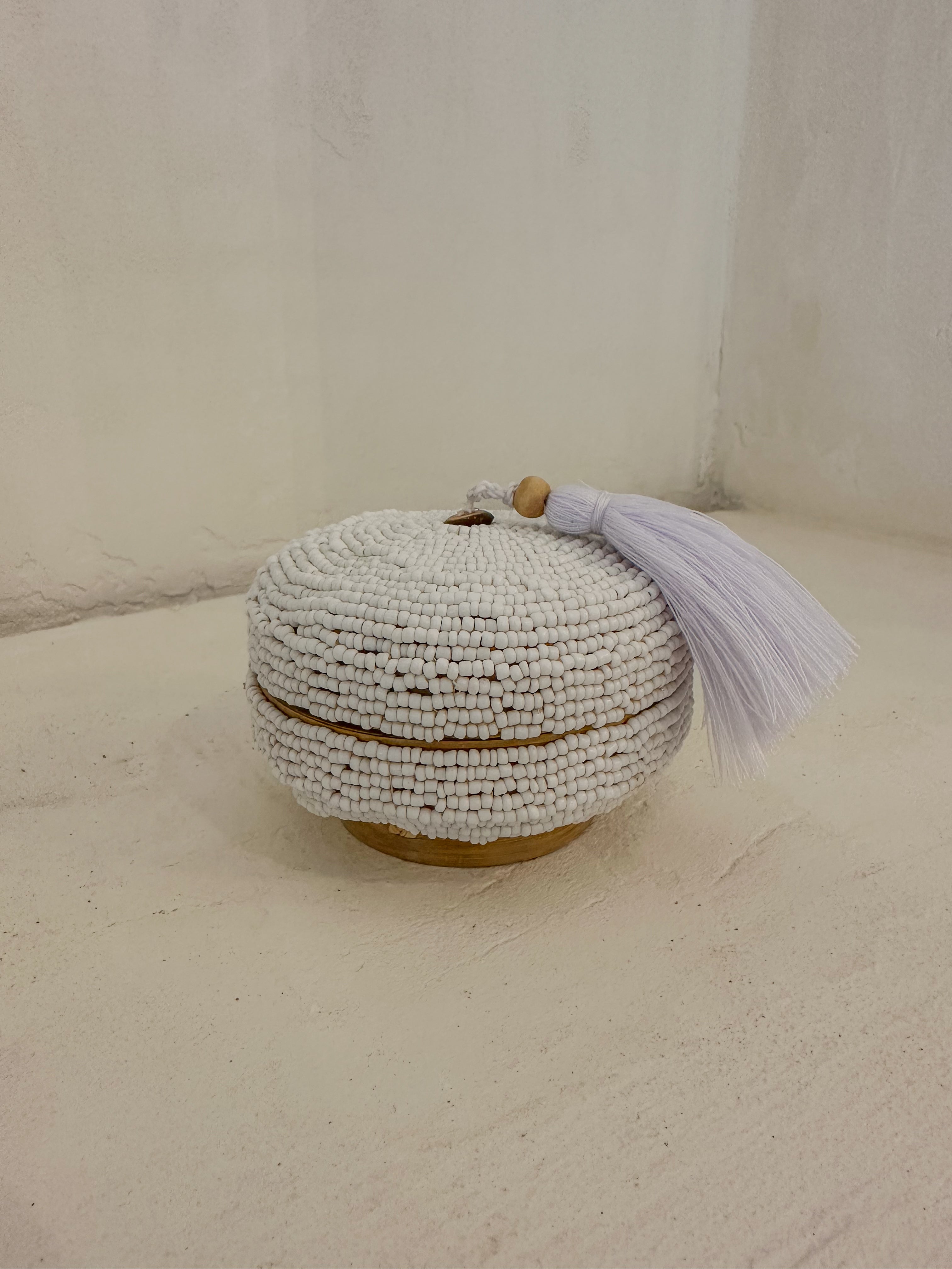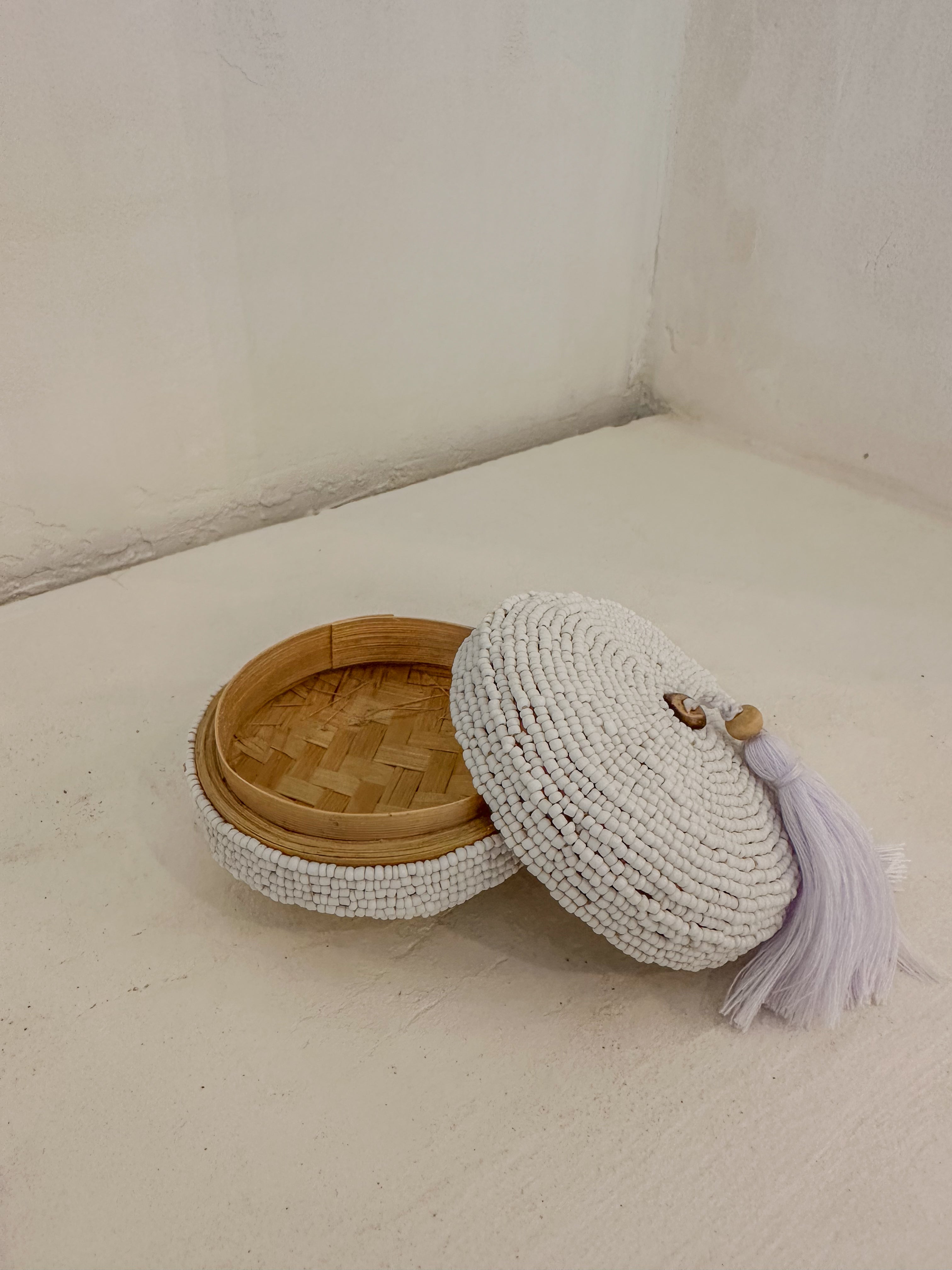 Volledig afgewerkt met witte glaskralen, straalt dit doosje rust en eenvoud uit. De zachte glans en natuurlijke basis van bamboe...
