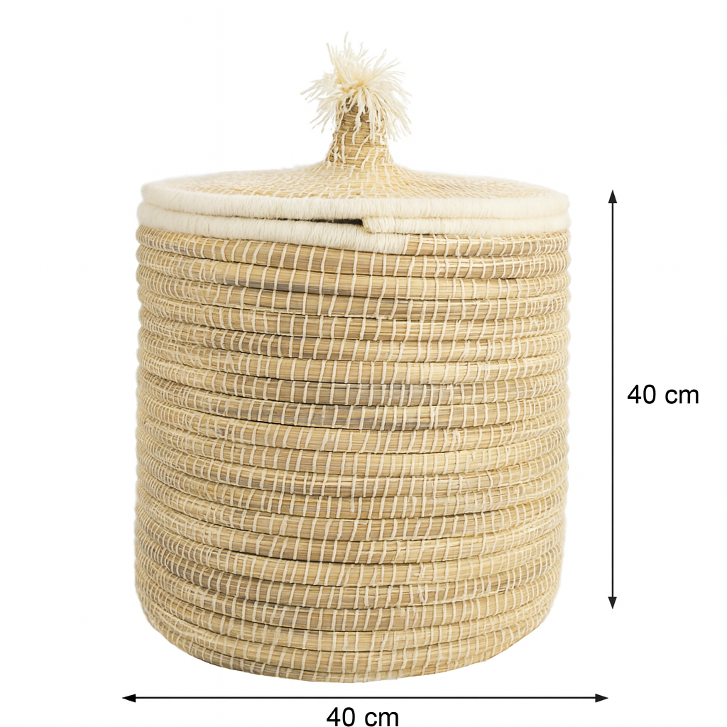 Deze handgeweven mand uit Marokko is een prachtige mix van natuurlijk zeegras en zacht katoen. Het deksel is afgewerkt met...