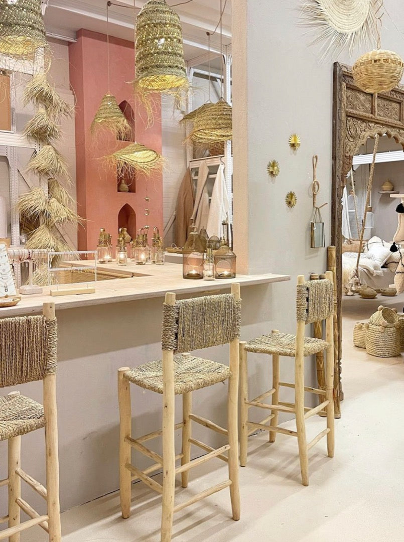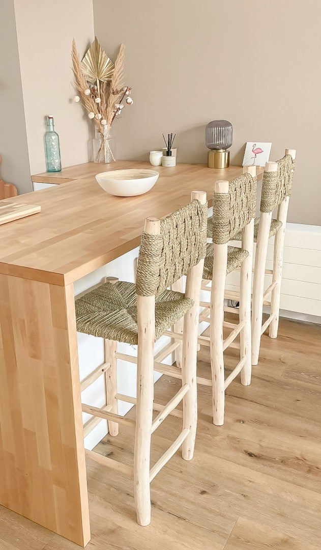 De barkrukken worden handgemaakt van hout en een zeegras gevlochten zitting + rug leuning.