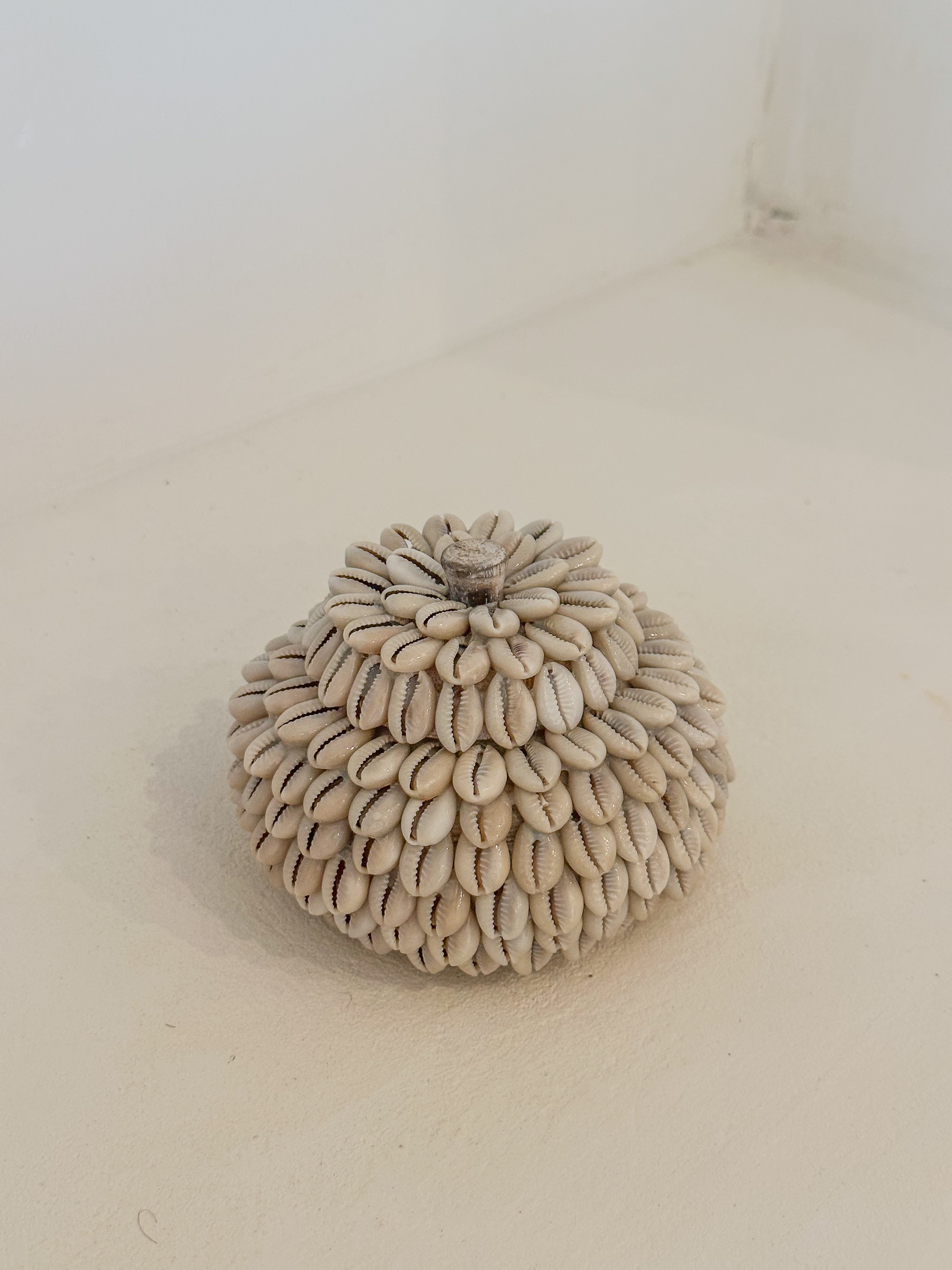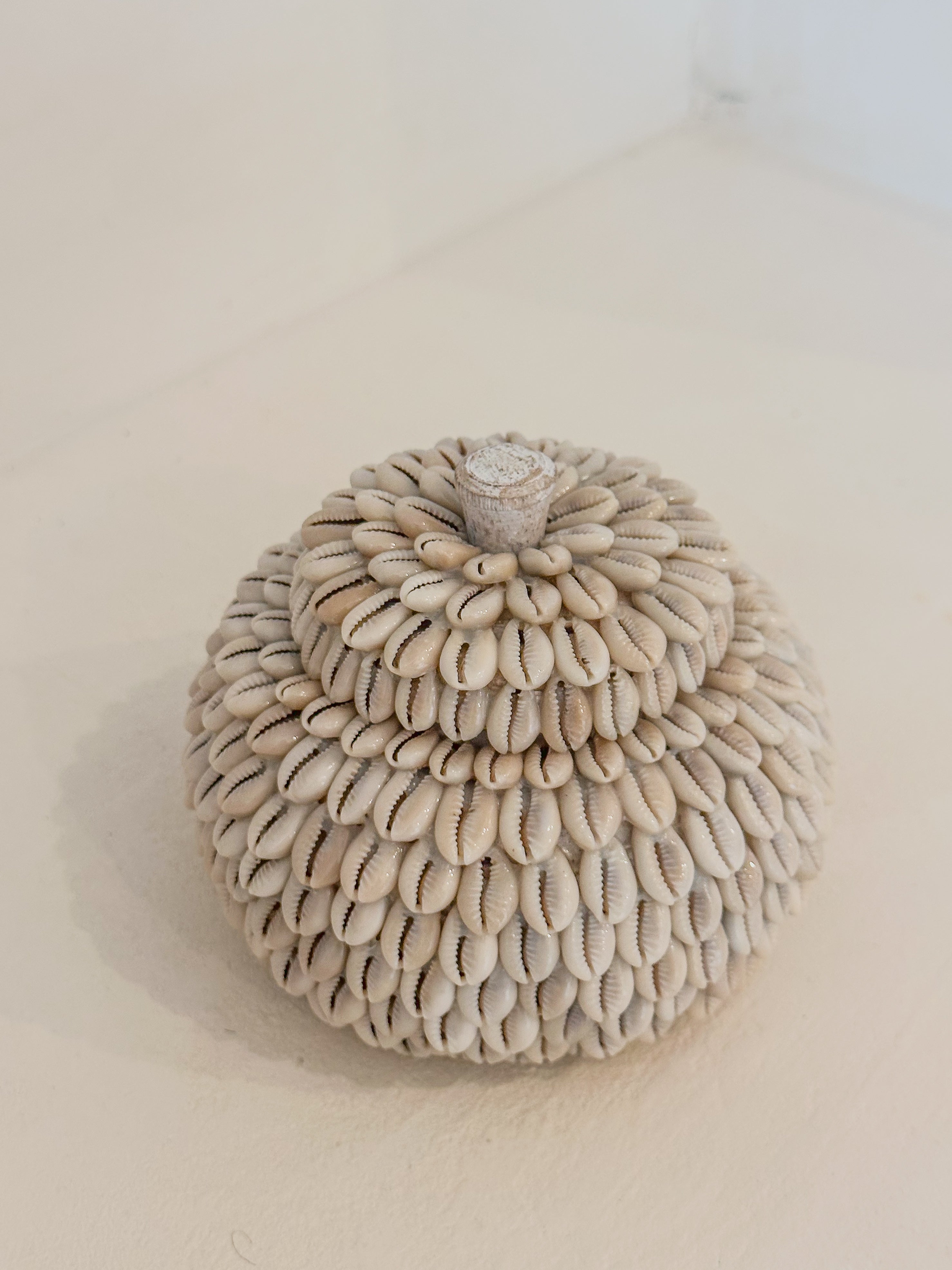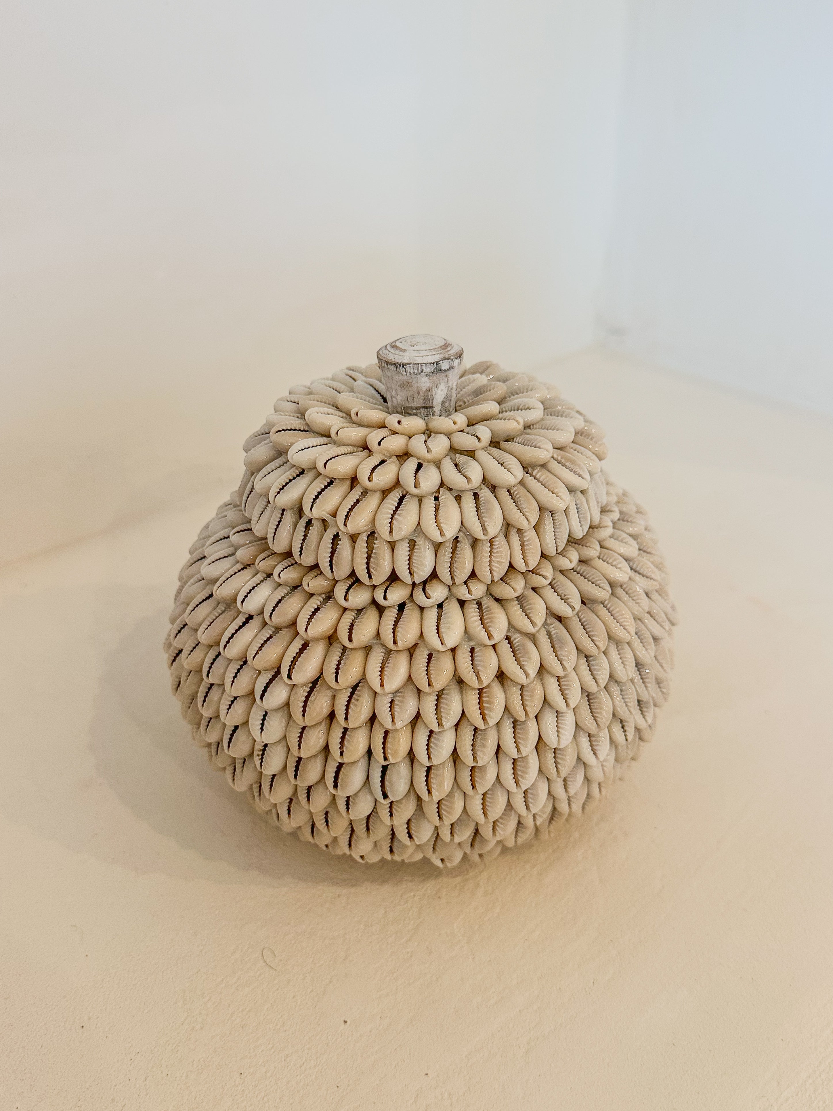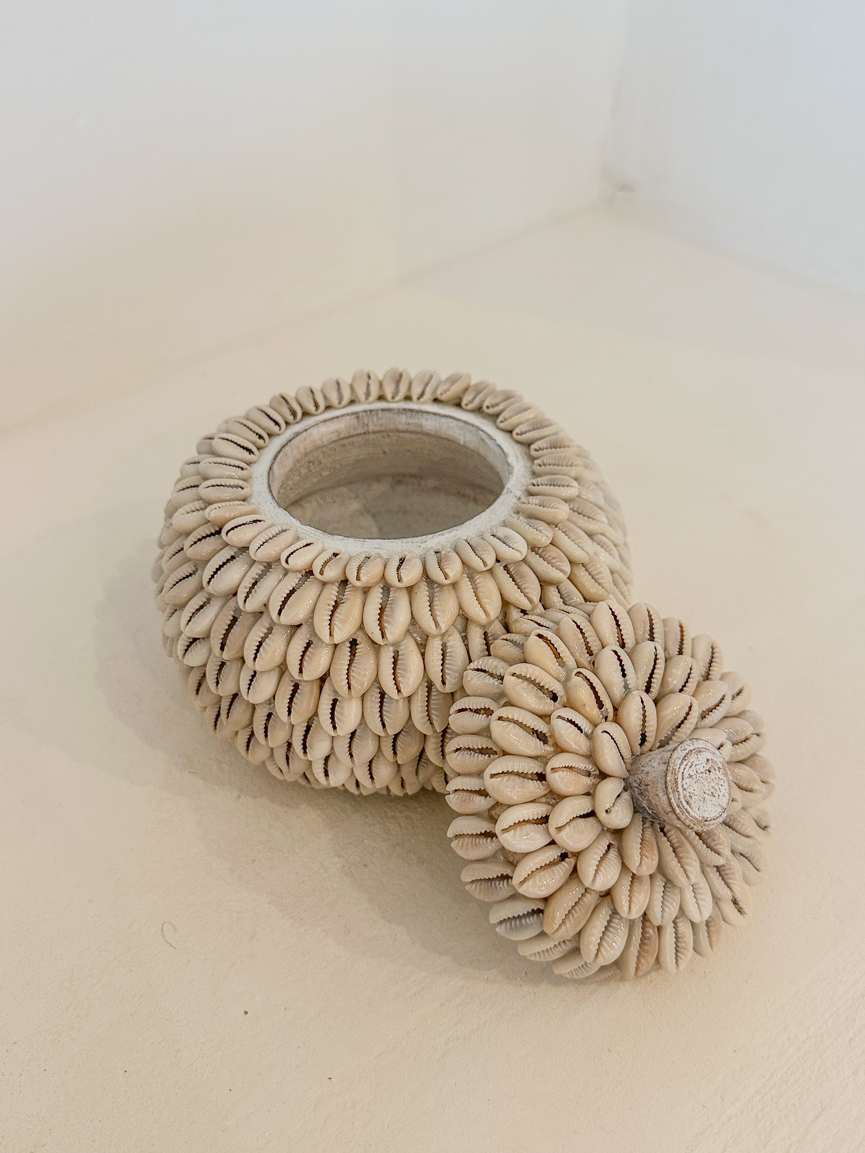 Deze bijzondere pot is vervaardigd uit hout en rijkelijk versierd met natuurlijke kauri schelpen, zorgvuldig met de hand bevestigd in lagen voor een prachtige, textuurrijke uitstraling.