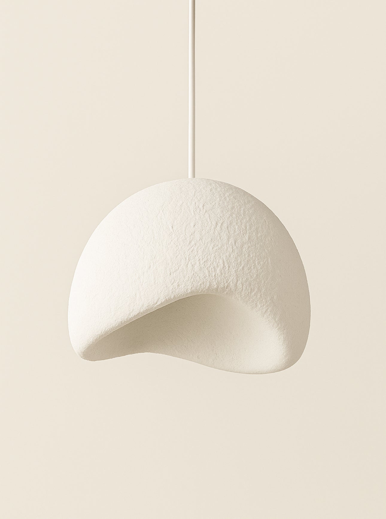 De lamp heeft een vloeiende, asymmetrische vorm en is gemaakt van een lichtgewicht kunststof basis, afgewerkt met een grove kalkpleisterlaag die zorgt voor een prachtige, ambachtelijke textuur. De matwitte tint versterkt het gevoel van rust en eenvoud, terwijl het licht zacht en sfeervol wordt verspreid.