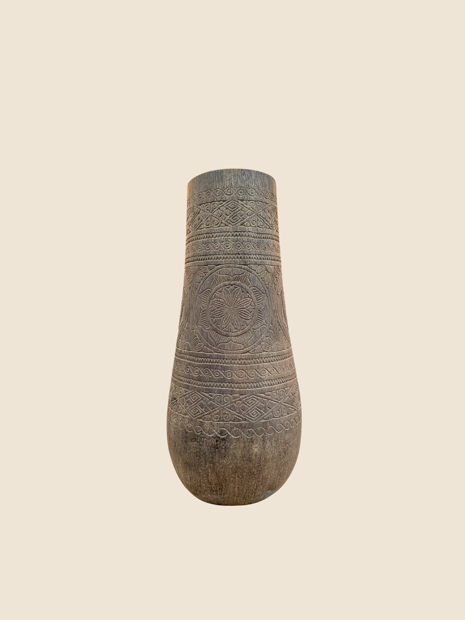 Deze bijzondere vaas is met de hand gemaakt uit de stam van een echte palmboom. Elk exemplaar is uniek, met verfijnde gravures en een doorleefde uitstraling die alleen echt vakmanschap kan creëren.