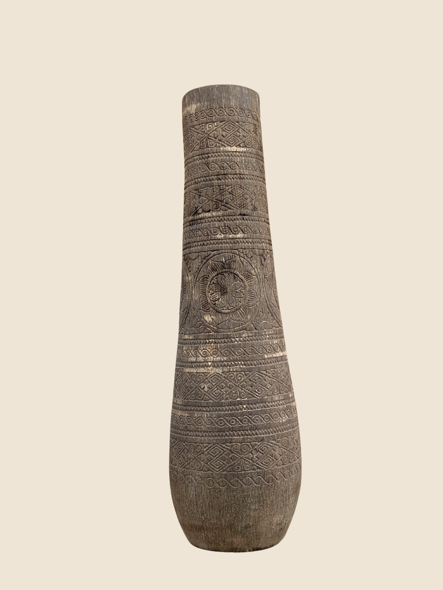Deze bijzondere vaas is met de hand gemaakt uit de stam van een echte palmboom. Elk exemplaar is uniek, met verfijnde gravures en een doorleefde uitstraling die alleen echt vakmanschap kan creëren.