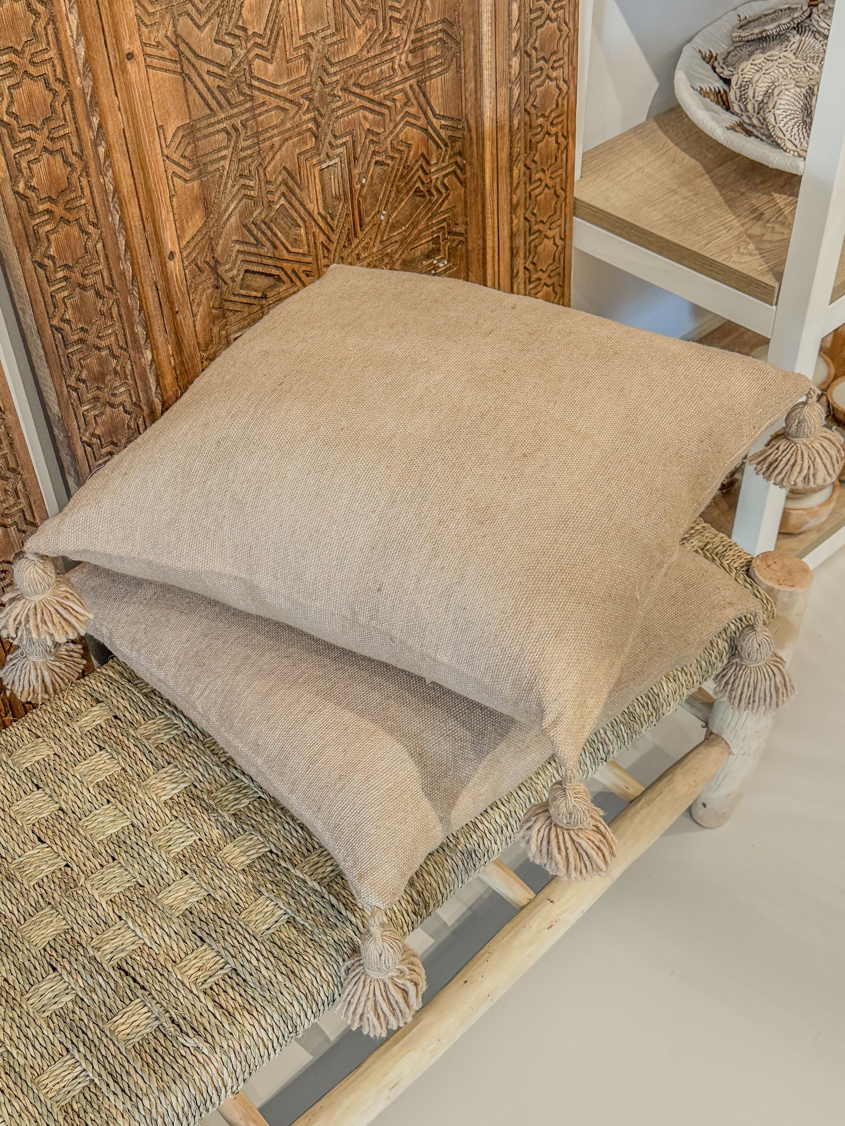✔ Handgeweven katoen ✔ Met pompoms op de hoeken ✔ Formaat: 45 x 45 cm ✔ Camel – Warm & tijdloos ✔ Perfect te combineren met andere kussens