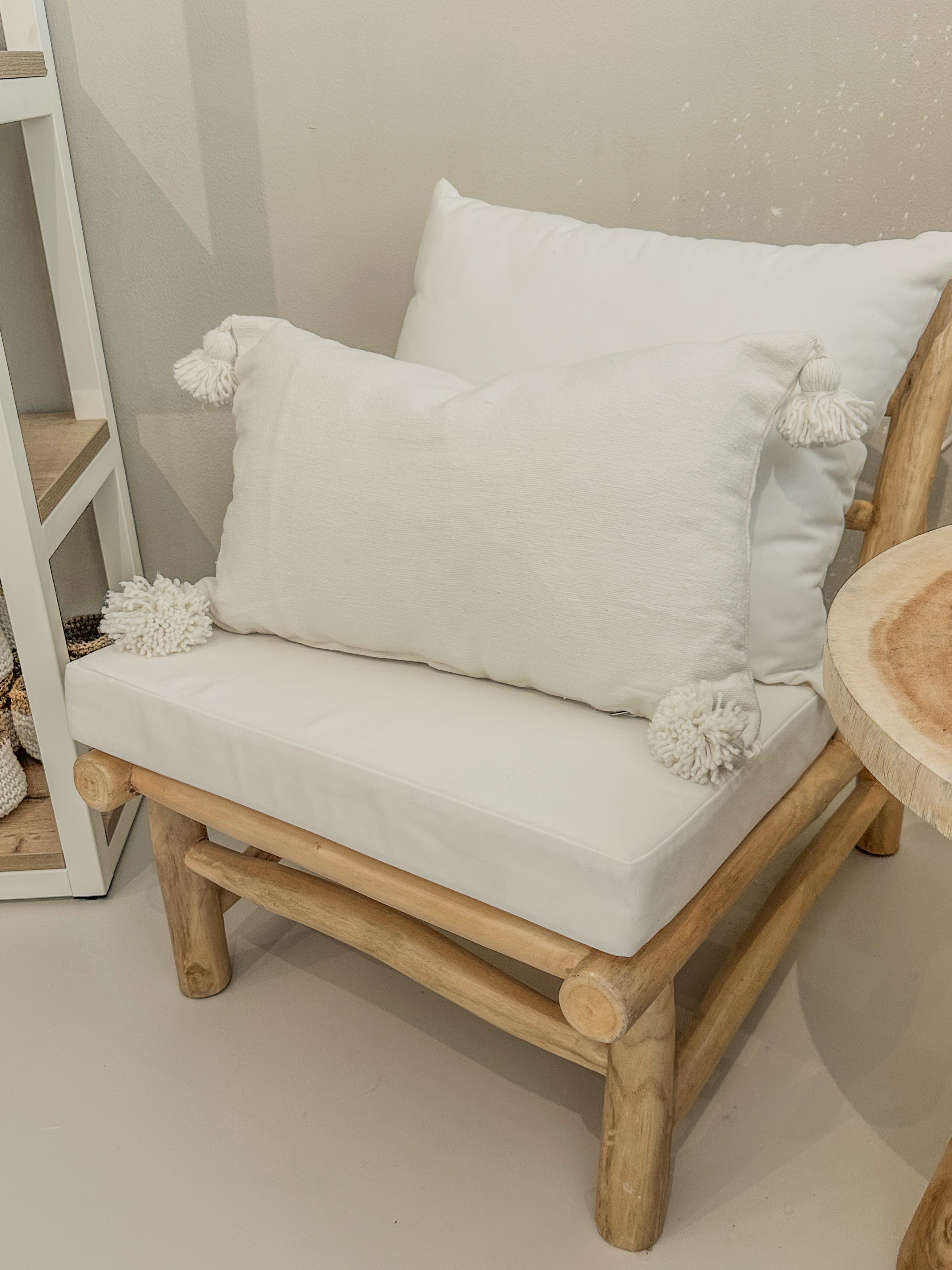 ✔ Handgeweven katoen ✔ Met pompoms op de hoeken ✔ Formaat: 60 x 40 cm ✔ Witte kleur – fris & tijdloos ✔ Perfect te combineren met andere kussens