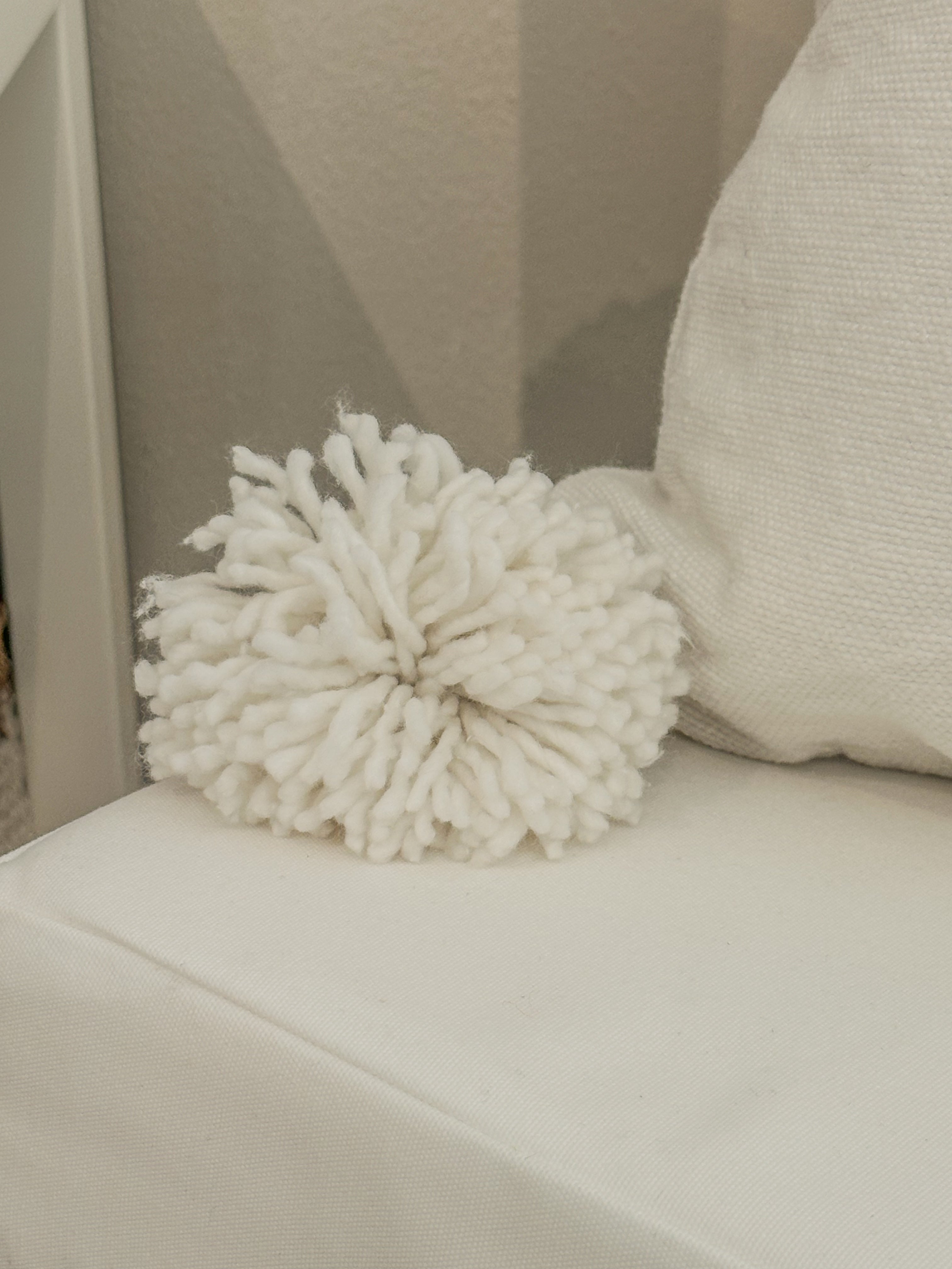 Voeg een vleugje zachtheid en lichte elegantie toe aan je interieur met dit handgeweven katoenen kussen in wit met pompoms.
