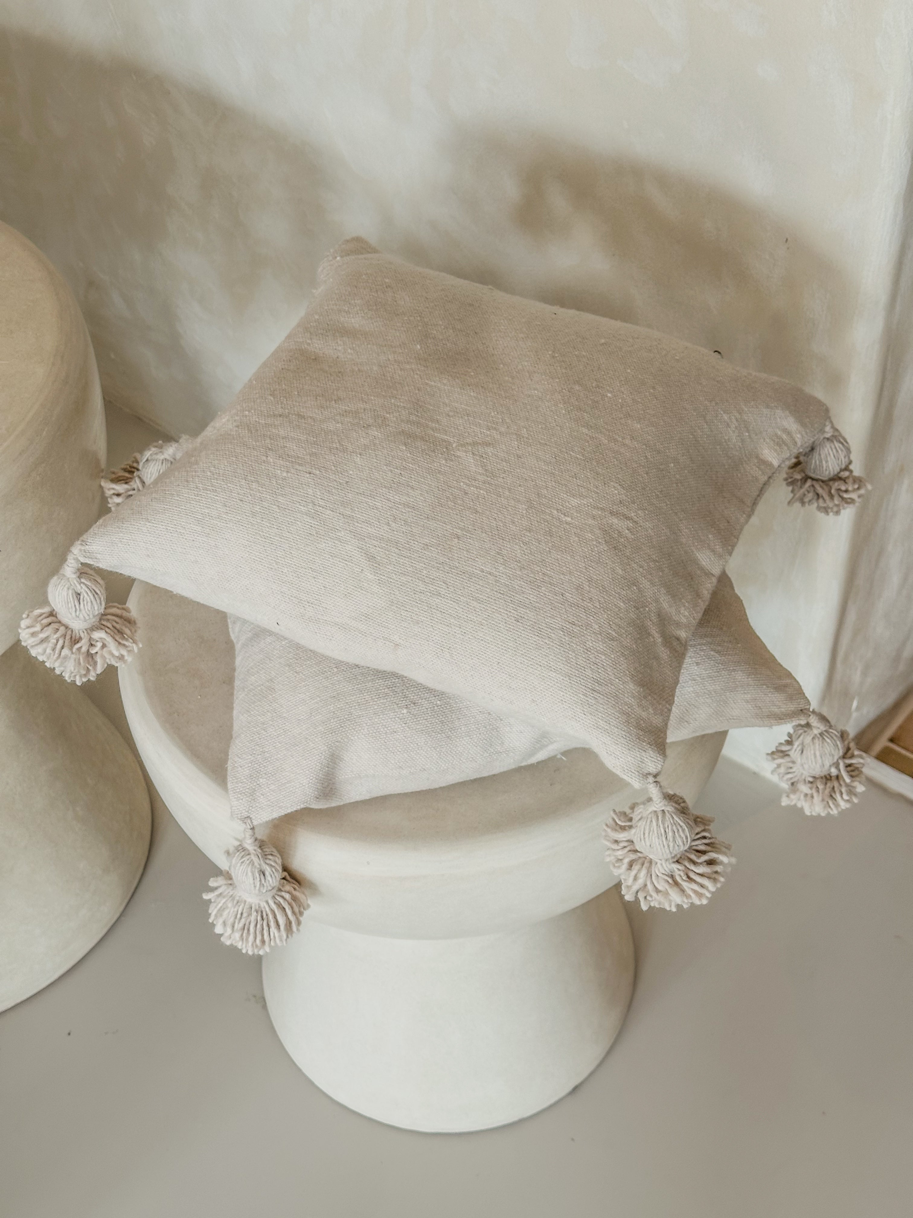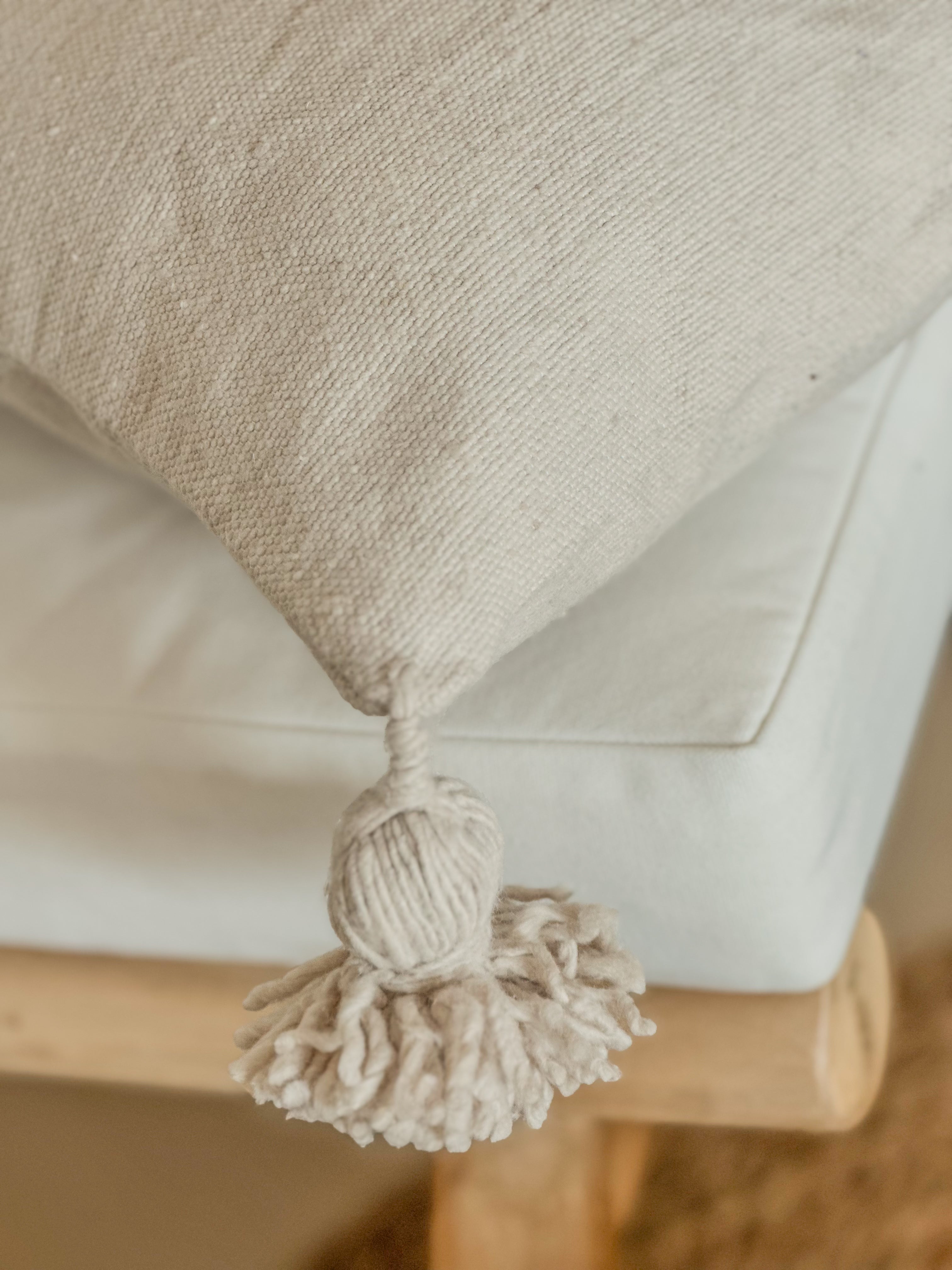 ✔ Handgeweven katoen ✔ Met pompoms op de hoeken ✔ Formaat: 35 x 35 cm ✔ Zandkleur – neutraal & tijdloos ✔ Perfect te combineren met andere kussens