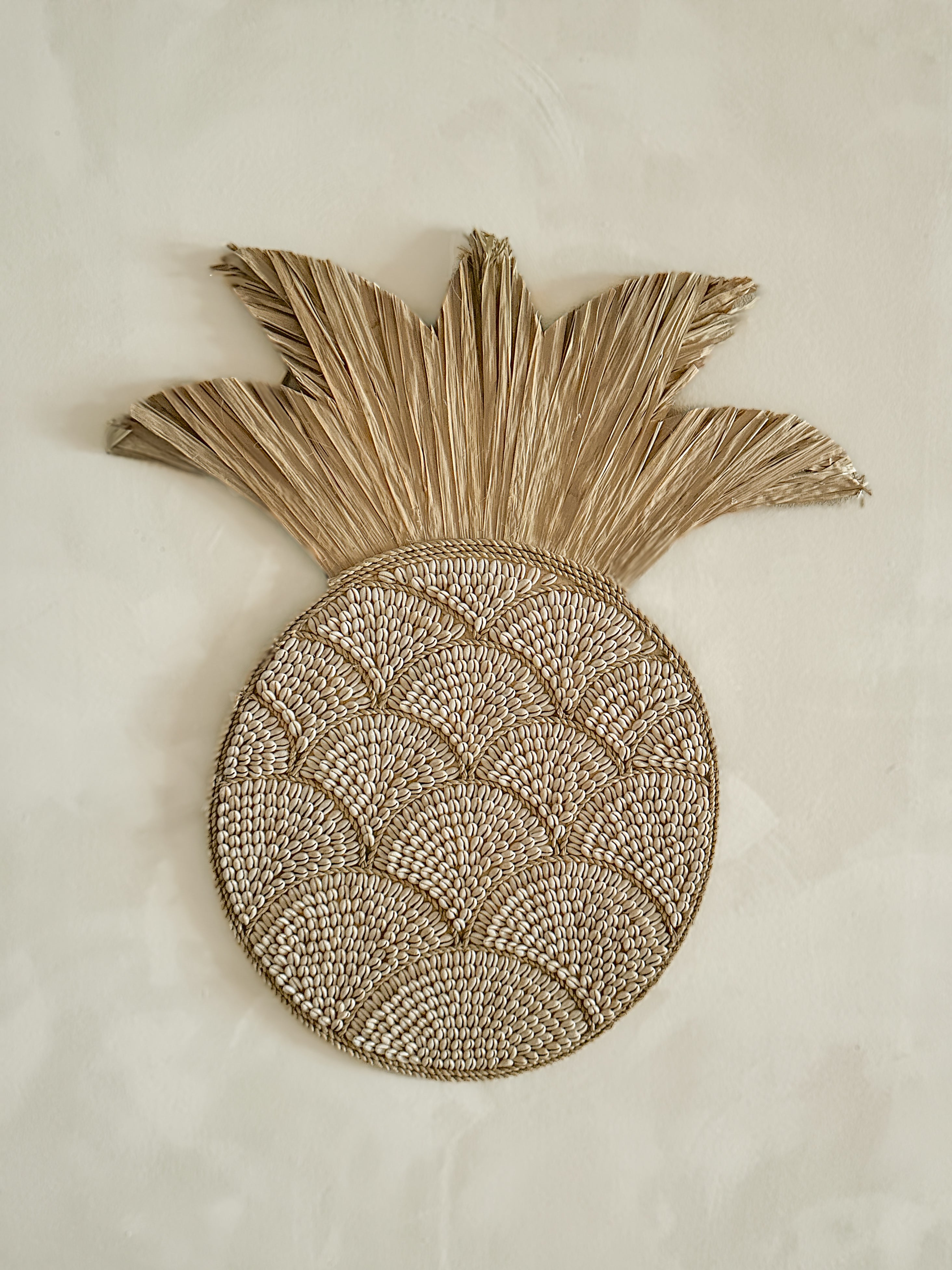 Deze handgemaakte wanddecoratie is vervaardigd uit natuurlijk raffia en rijkelijk versierd met kauri schelpen in een elegant, golvend patroon.