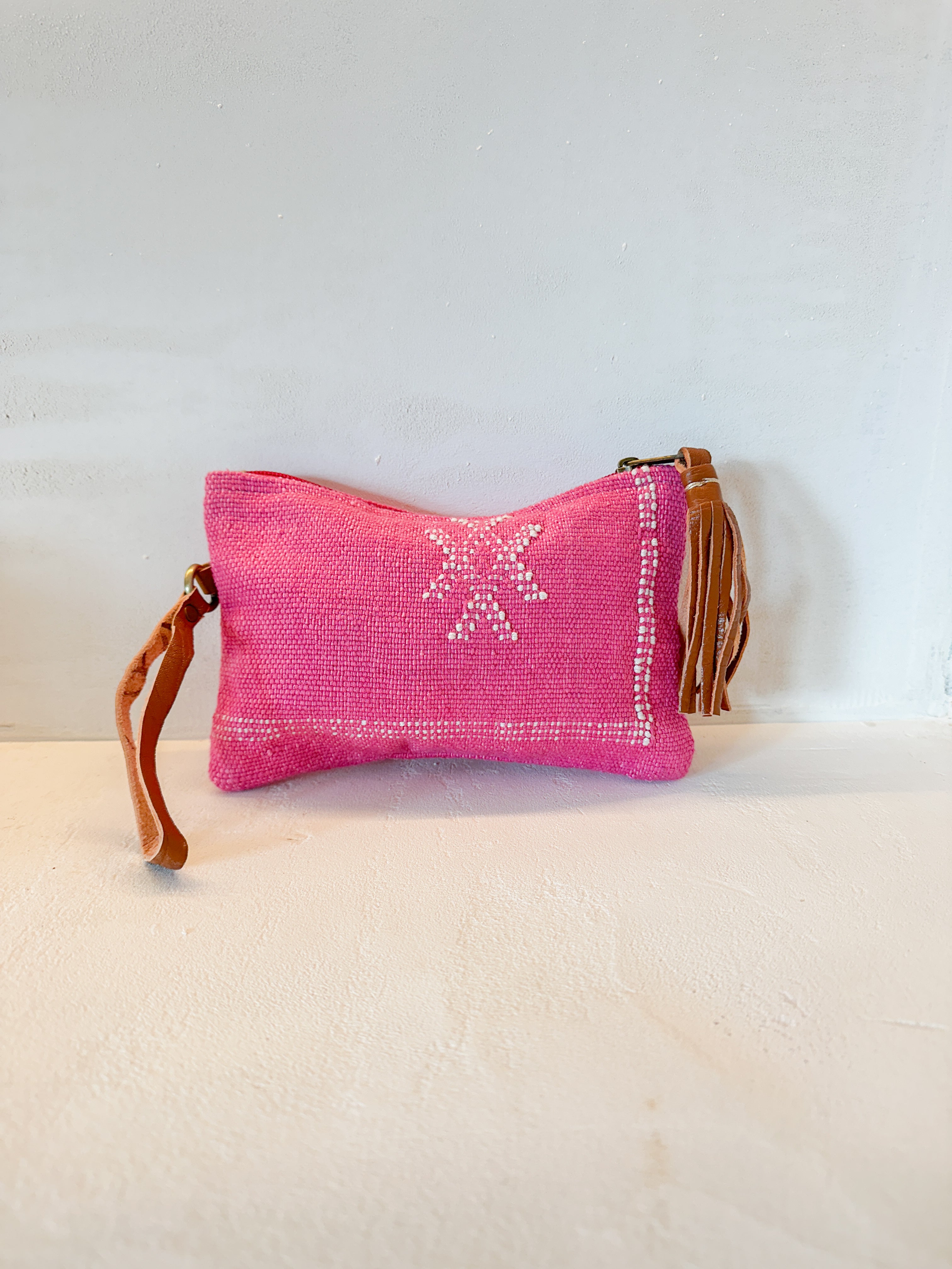 Het tasje is uitgevoerd in een vel roze tint met een subtiel ingeweven patroon. Afgewerkt met een leren polslus en een leren tassel, waardoor het een speelse en luxe uitstraling krijgt. Het tasje sluit met een rits en heeft één ruim vak, ideaal voor je dagelijkse essentials zoals sleutels, make-up of kleine persoonlijke items.