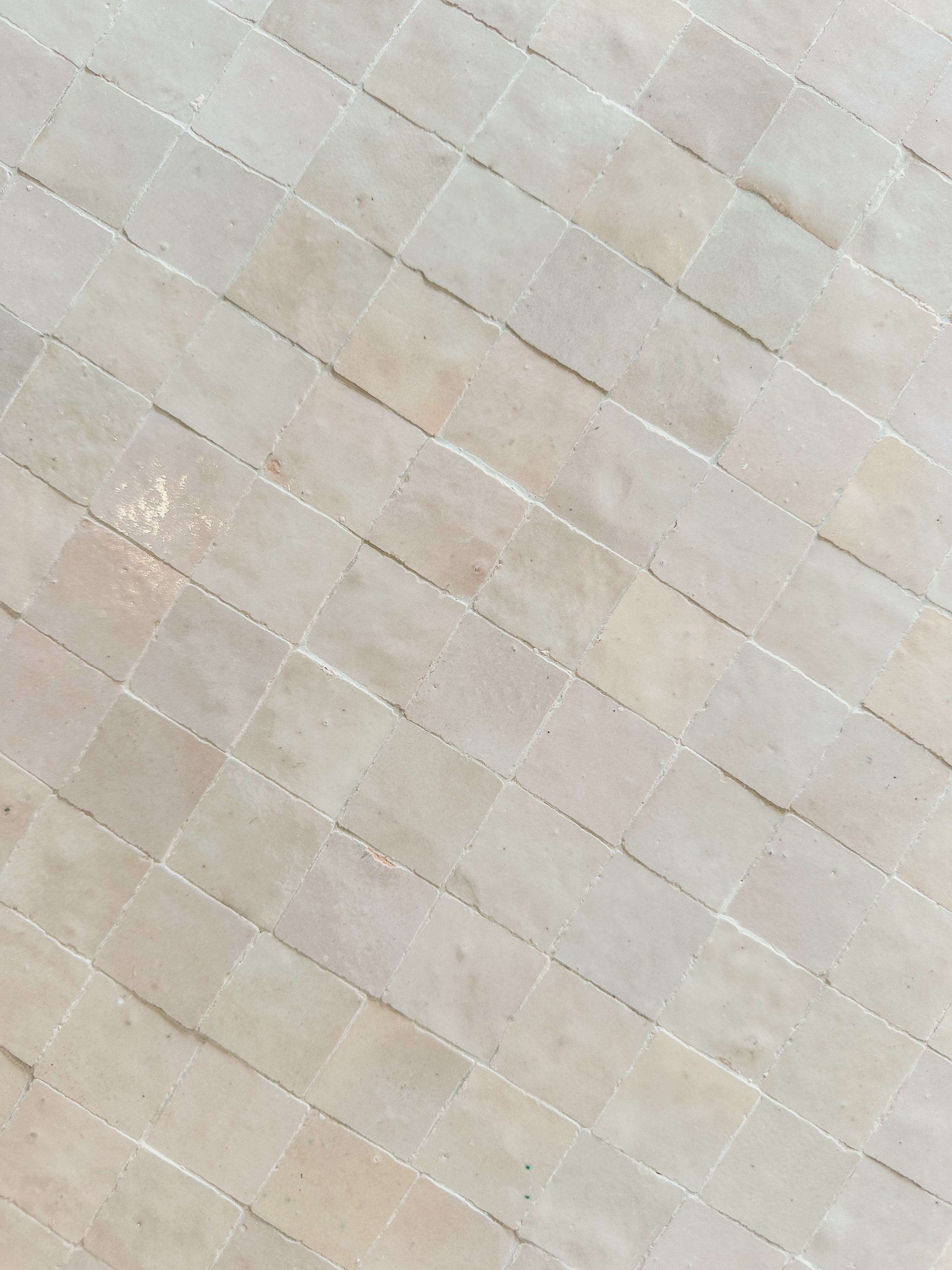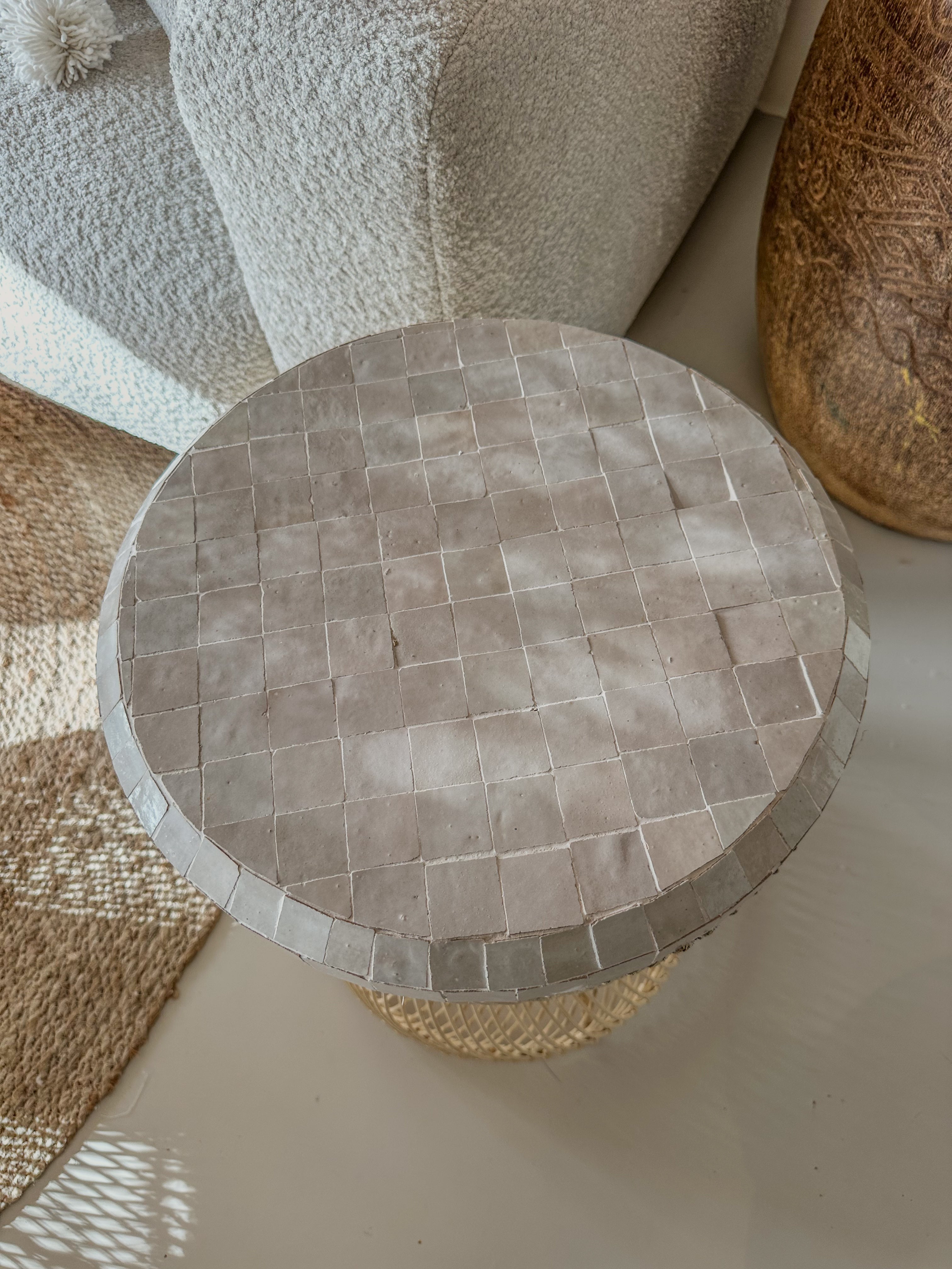Het ronde tafelblad is ingelegd met zellige tegeltjes – kleine handgesneden kleitegels die traditioneel in Marokko worden gemaakt. Elk tegeltje wordt met de hand geglazuurd, waardoor het blad een uniek patroon en een subtiele glans krijgt.