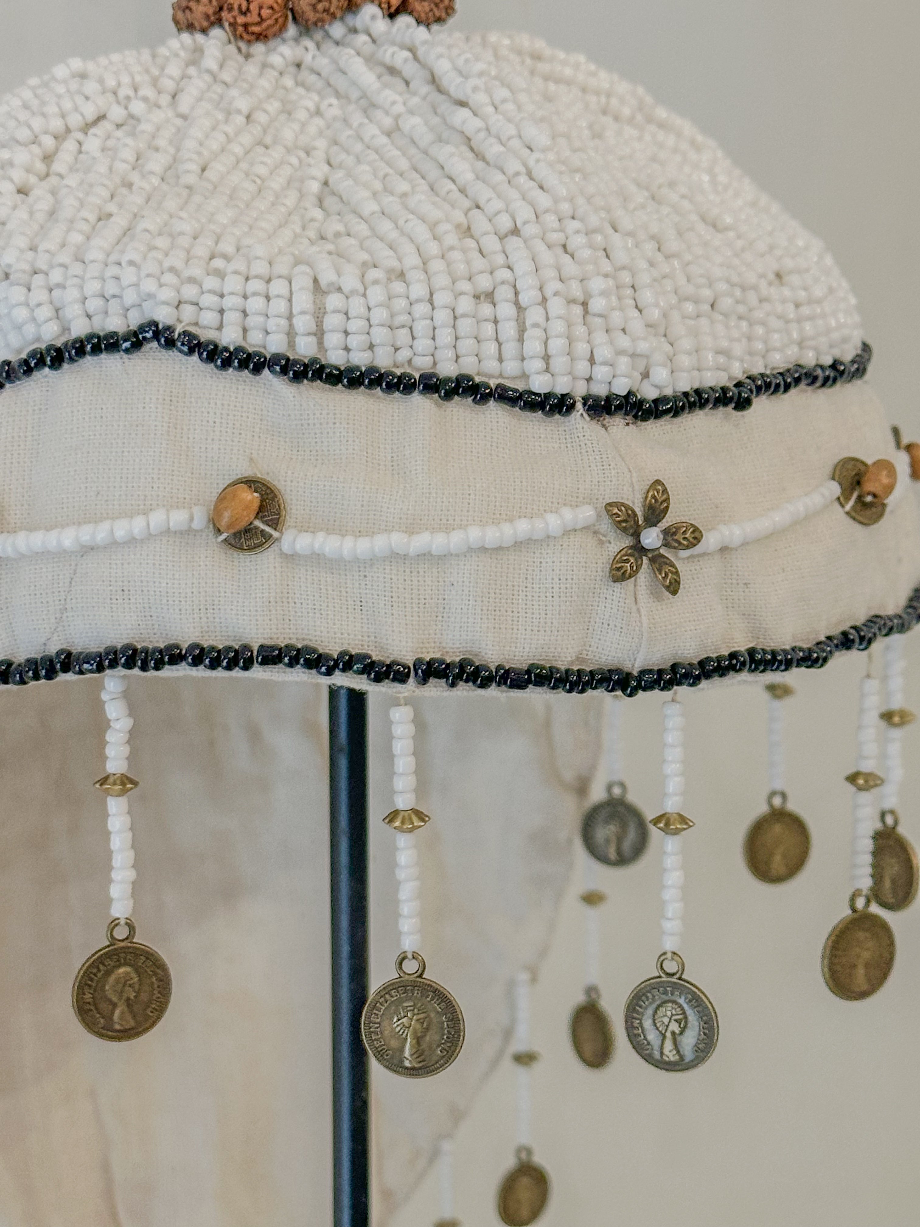 De hoofdtooi is rijk gedecoreerd met witte glaskralen, metalen muntjes en subtiele ornamenten, die samen een prachtig en harmonieus geheel vormen.